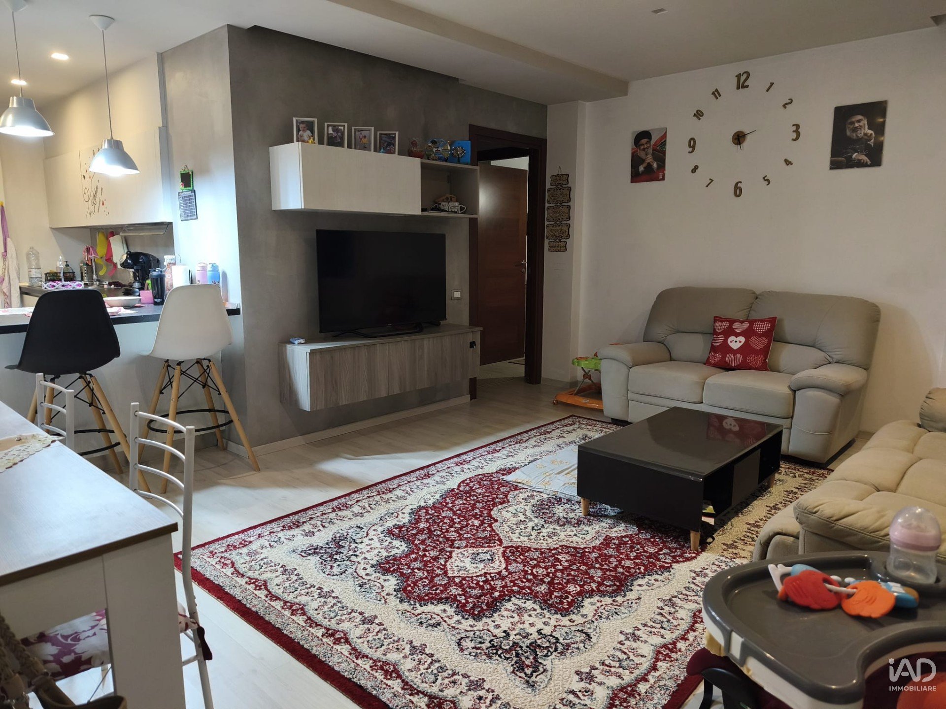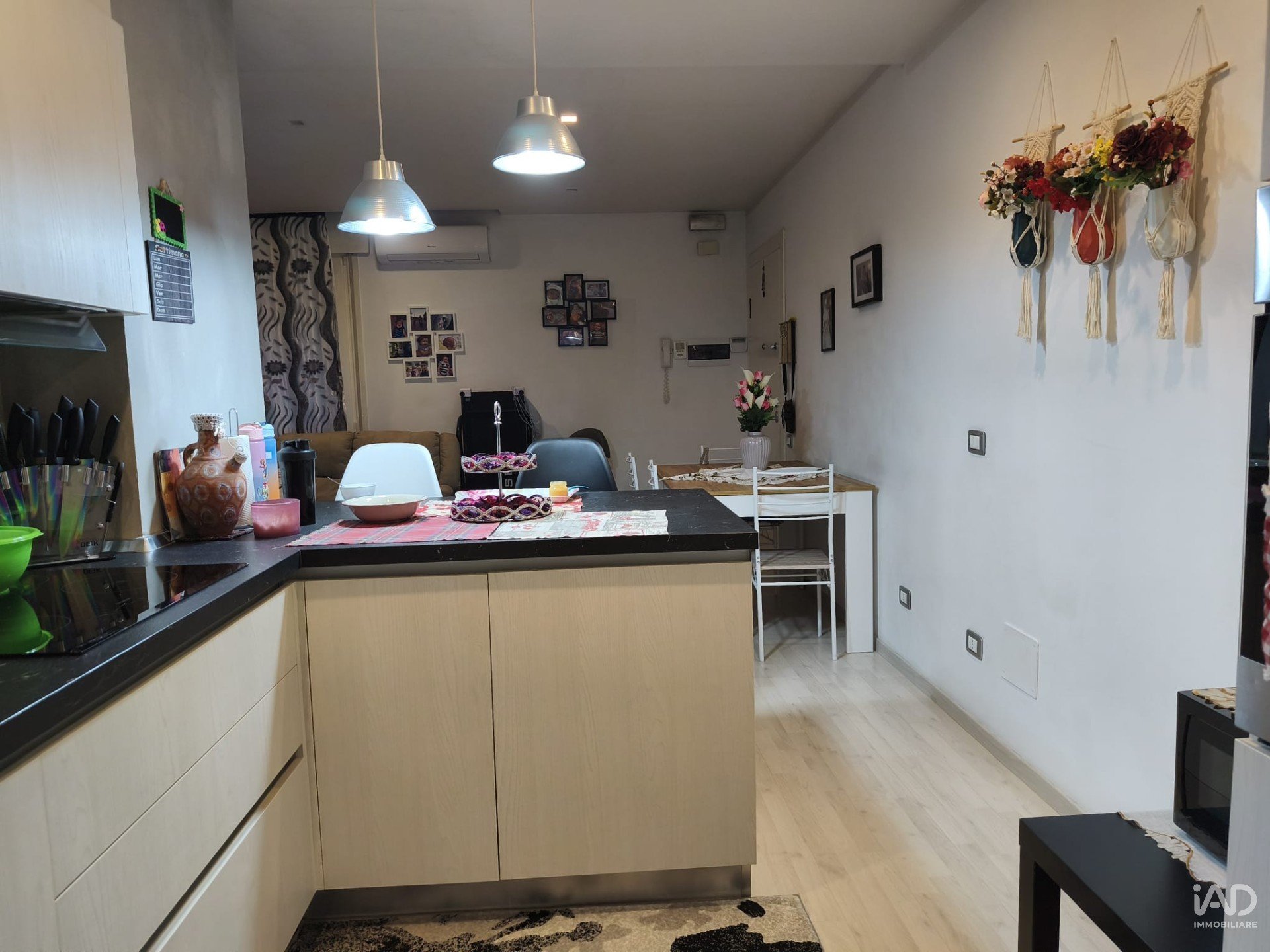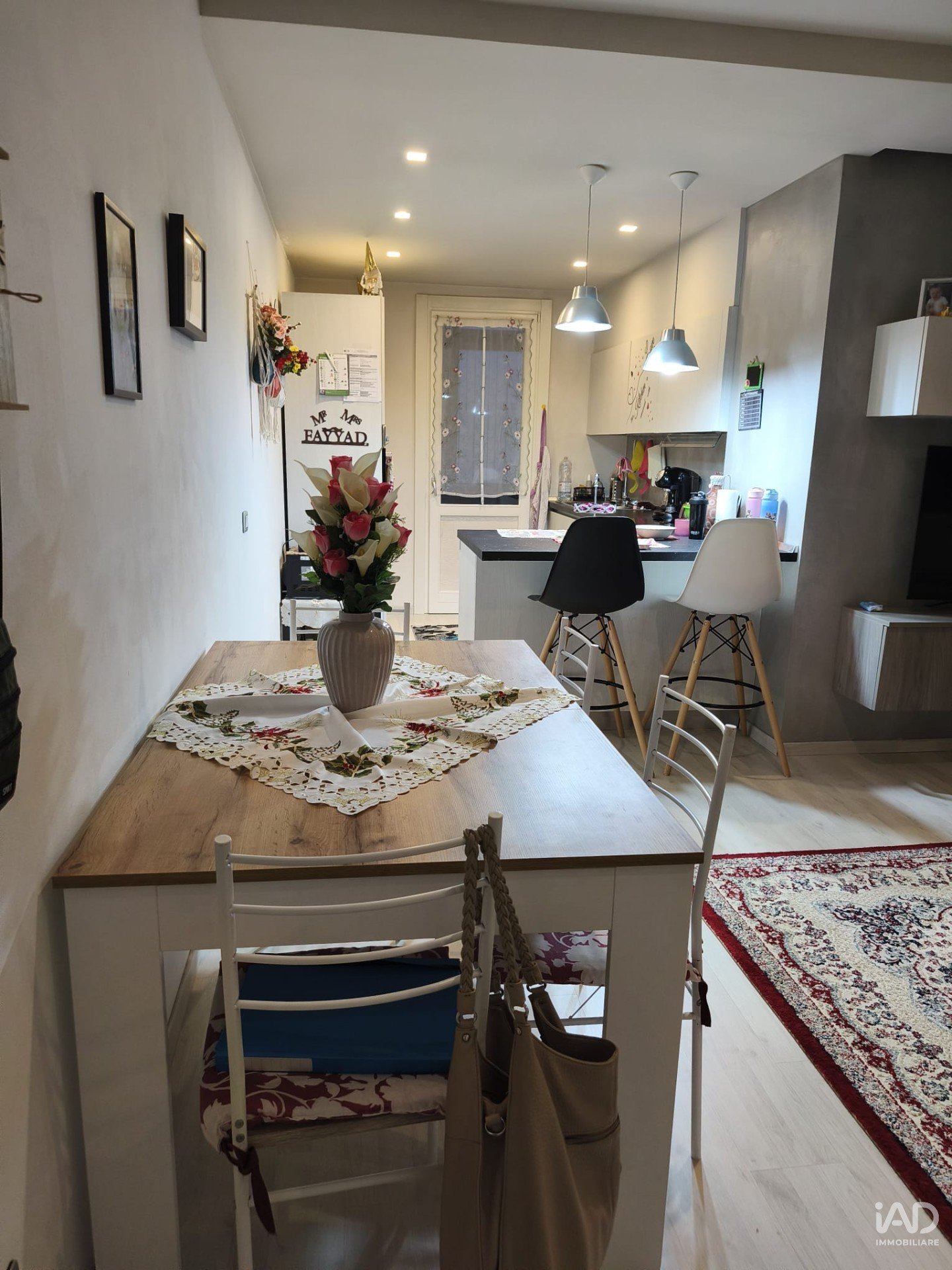 L’ingresso conduce a una spaziosa zona giorno con angolo cottura a vista, elegantemente semiseparato e affacciato su un pratico terrazzino coperto con vetrate, ideale come zona di servizio o dispensa.