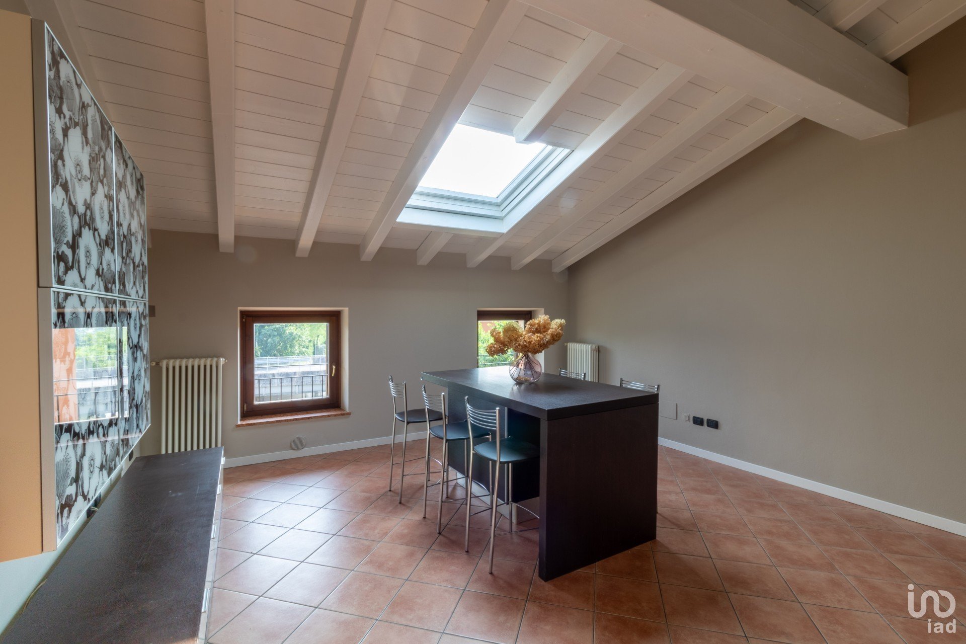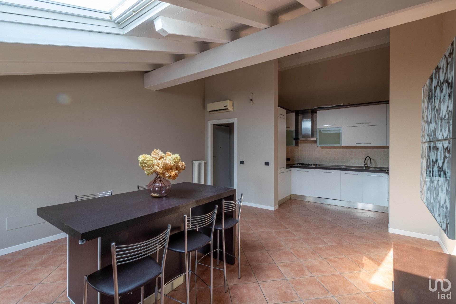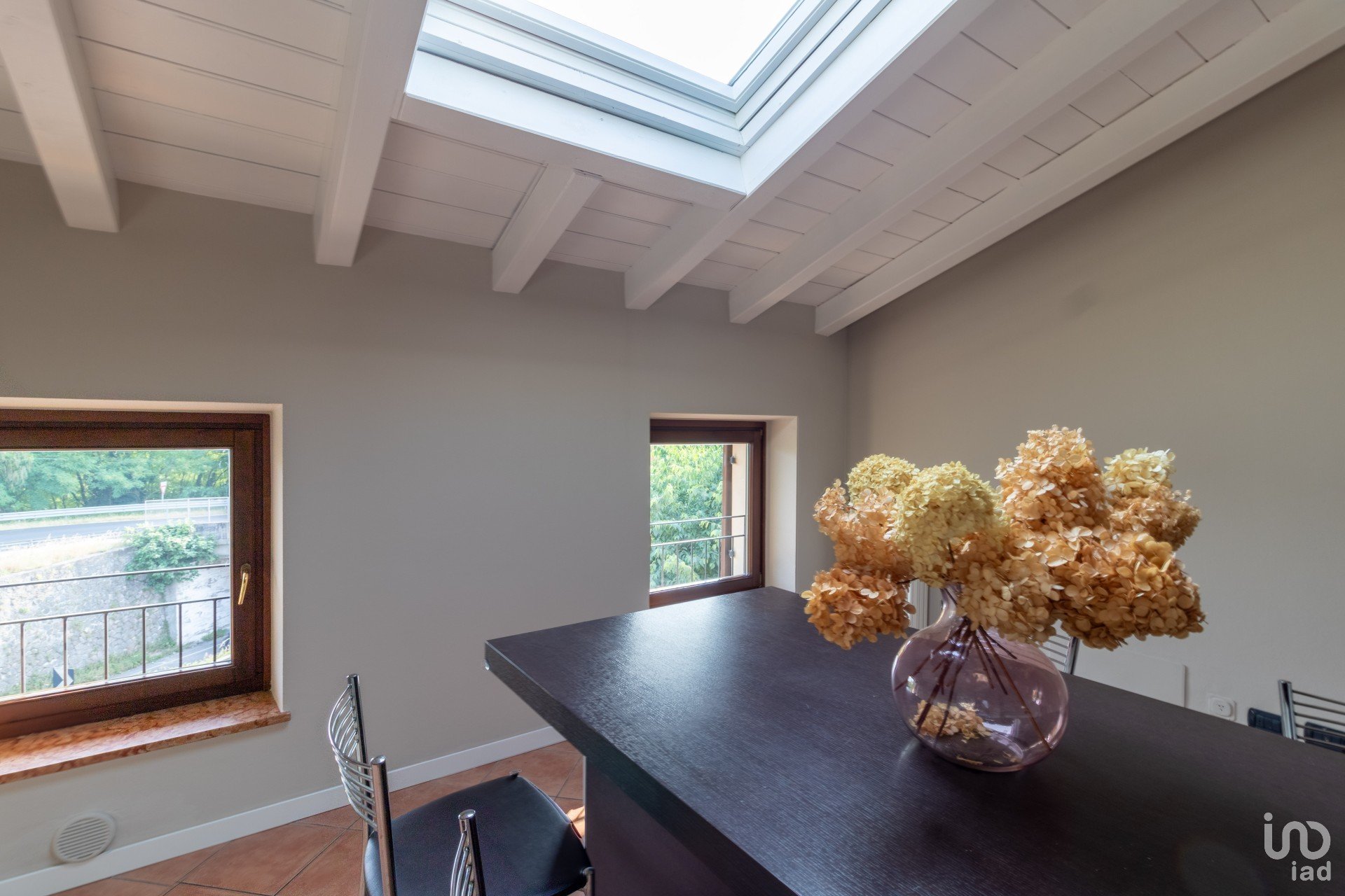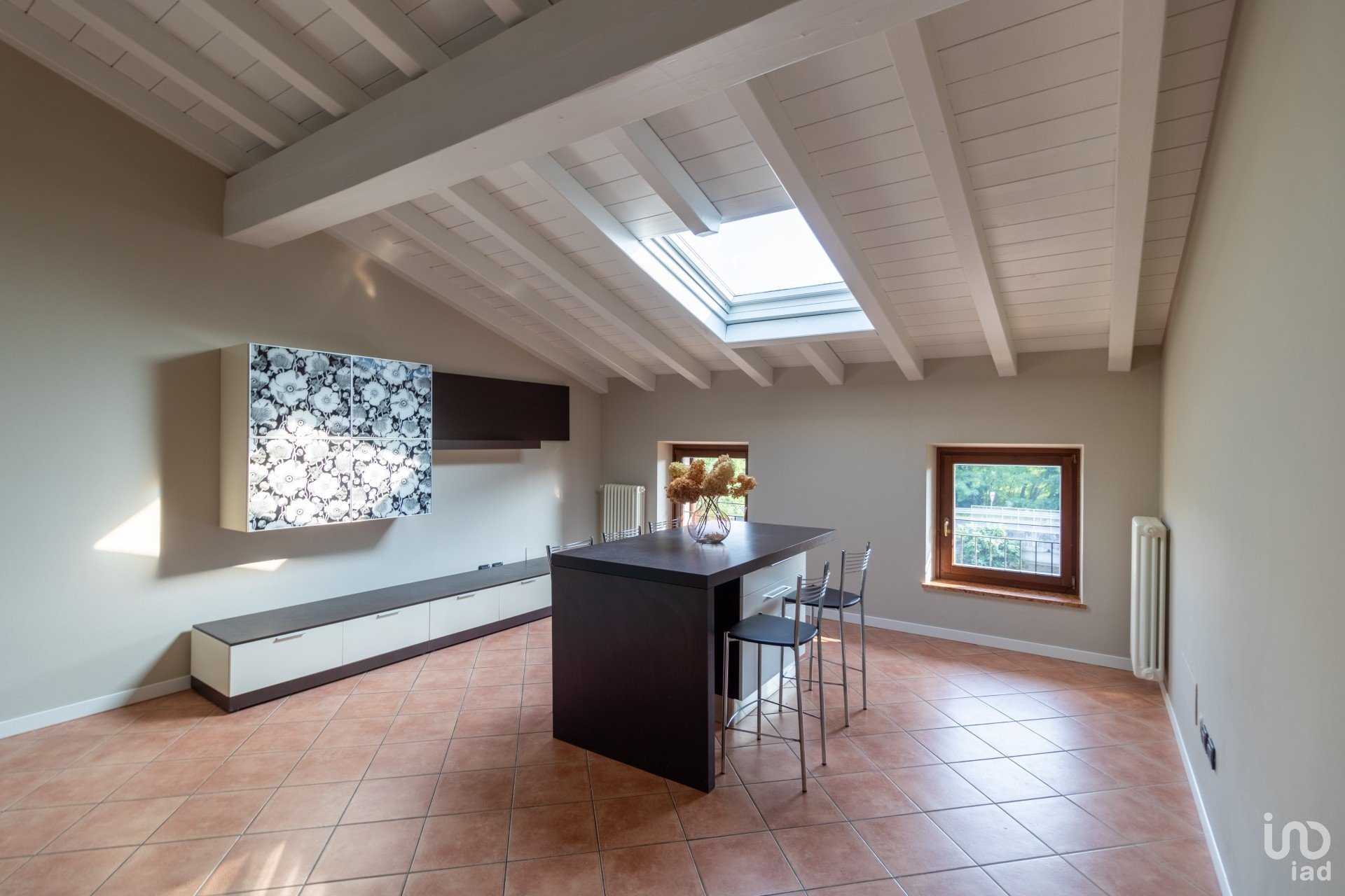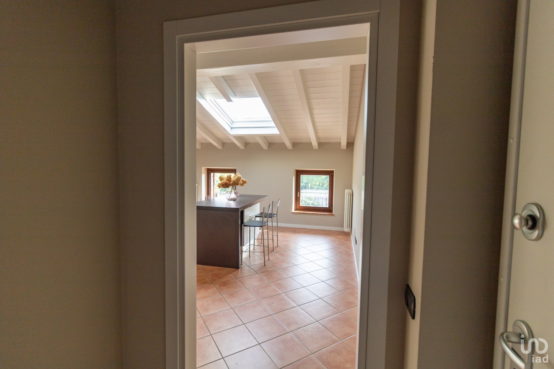 Appena varchi la soglia, vieni accolto da un’ampia zona giorno inondata di luce, dove le travi a vista bianche raccontano un’eleganza semplice e calda.