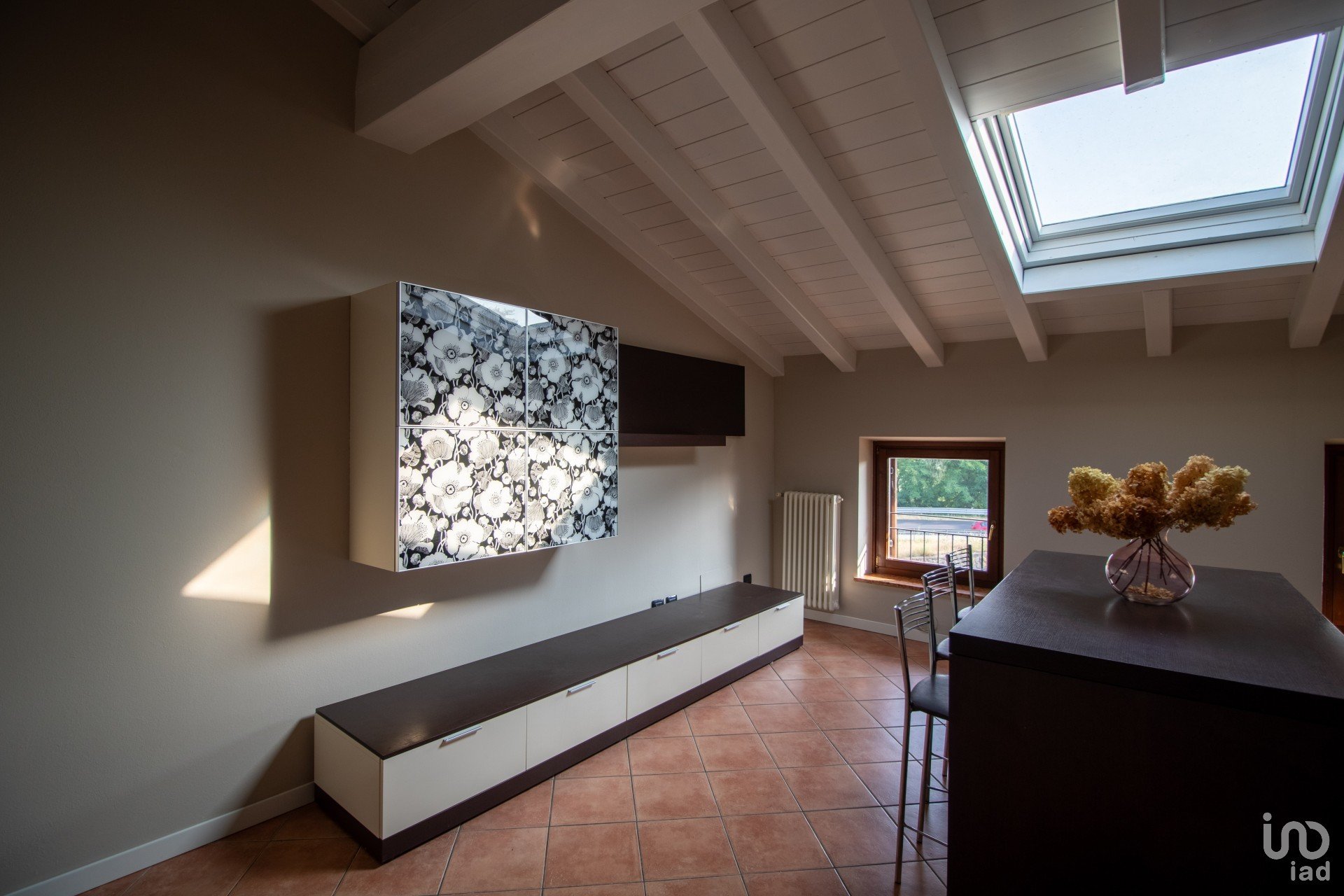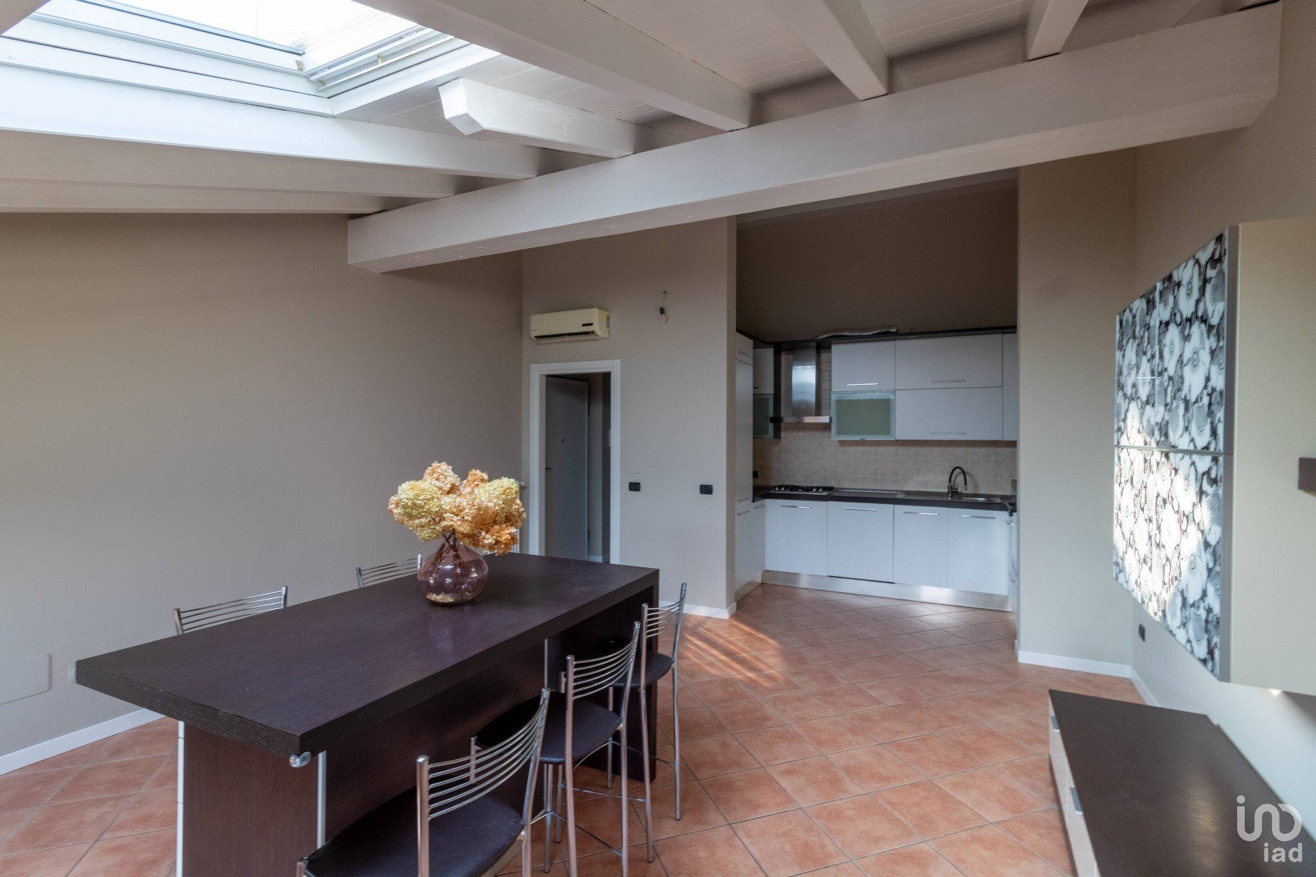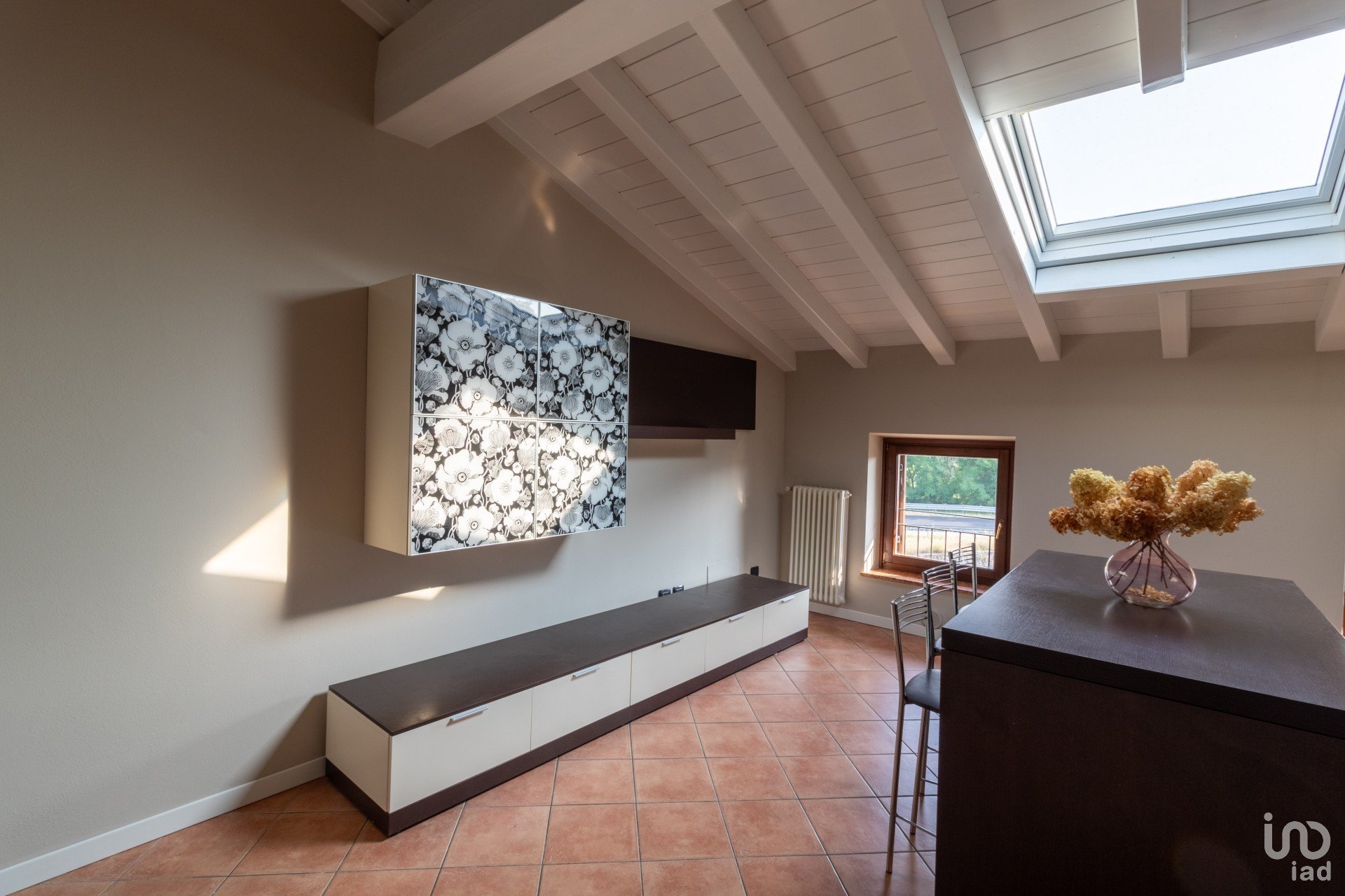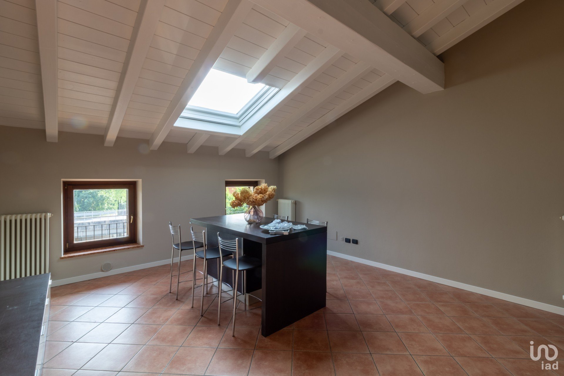 Appena varchi la soglia, vieni accolto da un’ampia zona giorno inondata di luce, dove le travi a vista bianche raccontano un’eleganza semplice e calda.