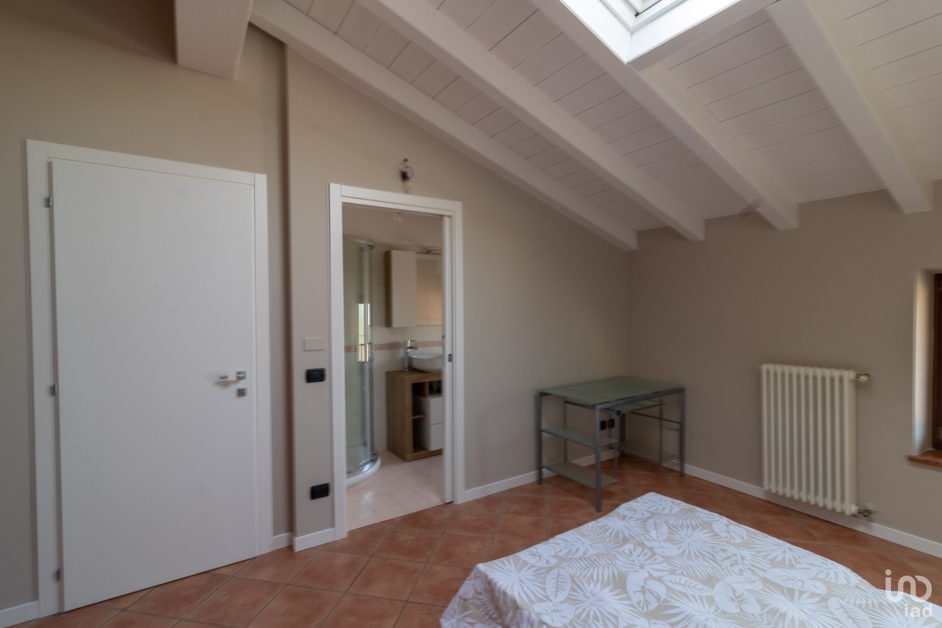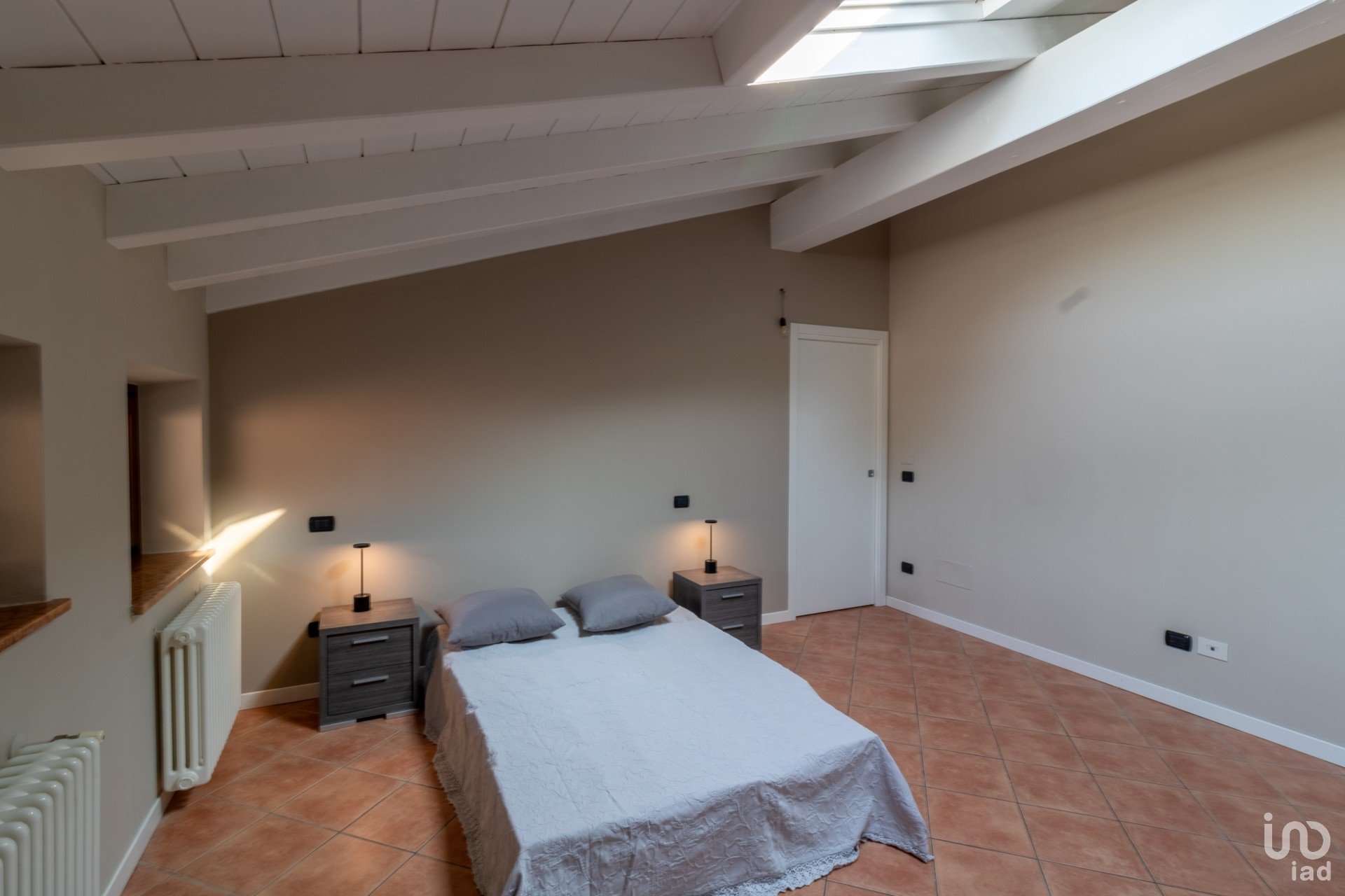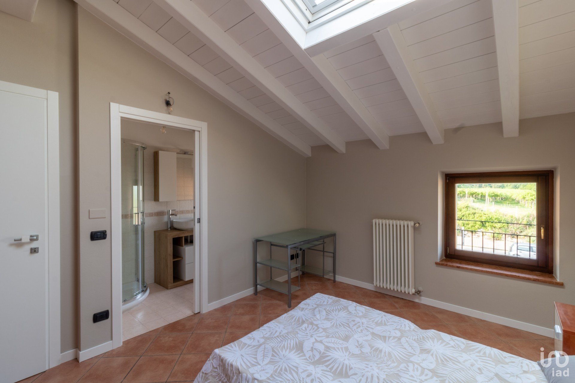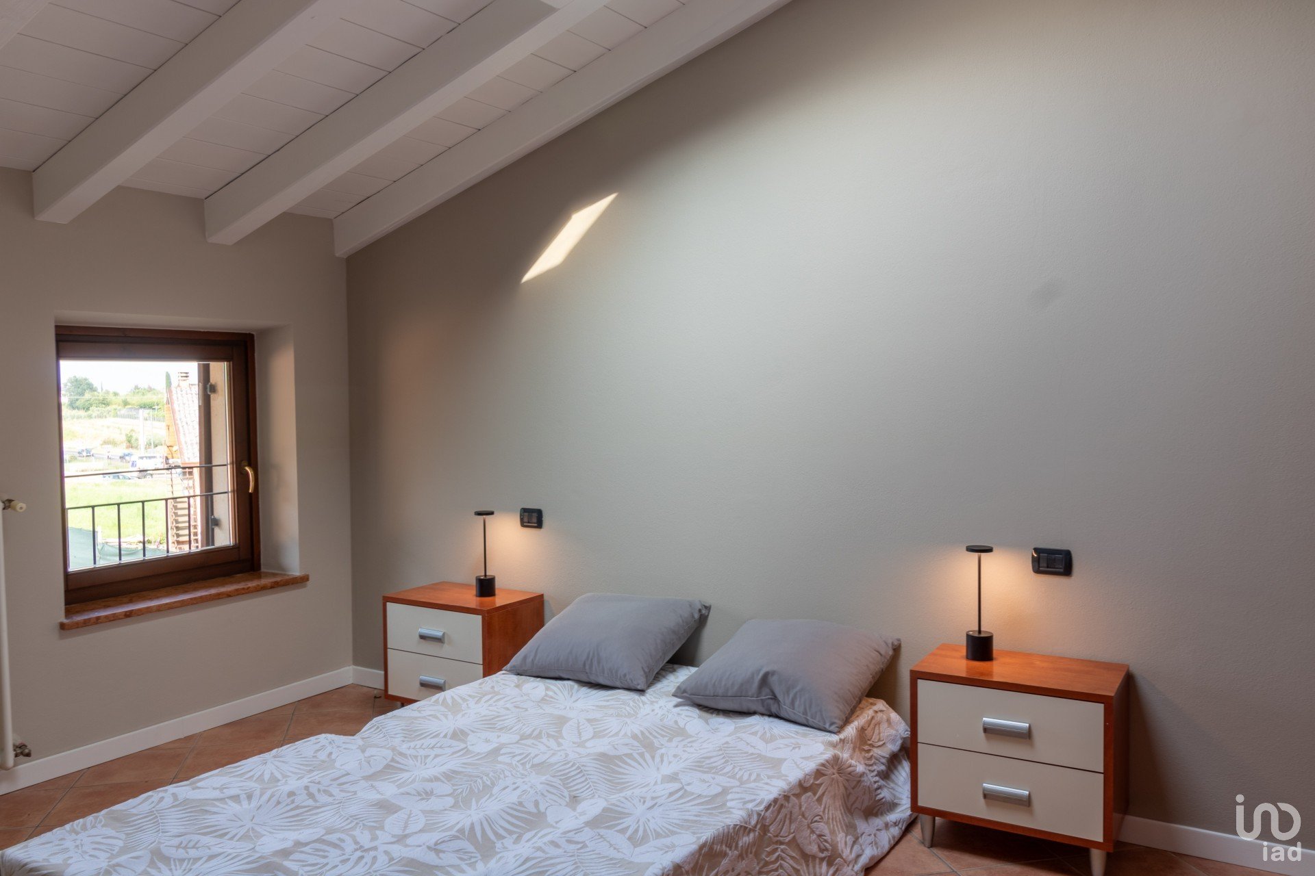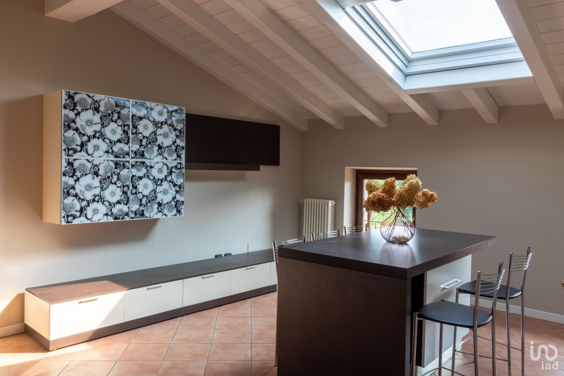 Appena varchi la soglia, vieni accolto da un’ampia zona giorno inondata di luce, dove le travi a vista bianche raccontano un’eleganza semplice e calda.
