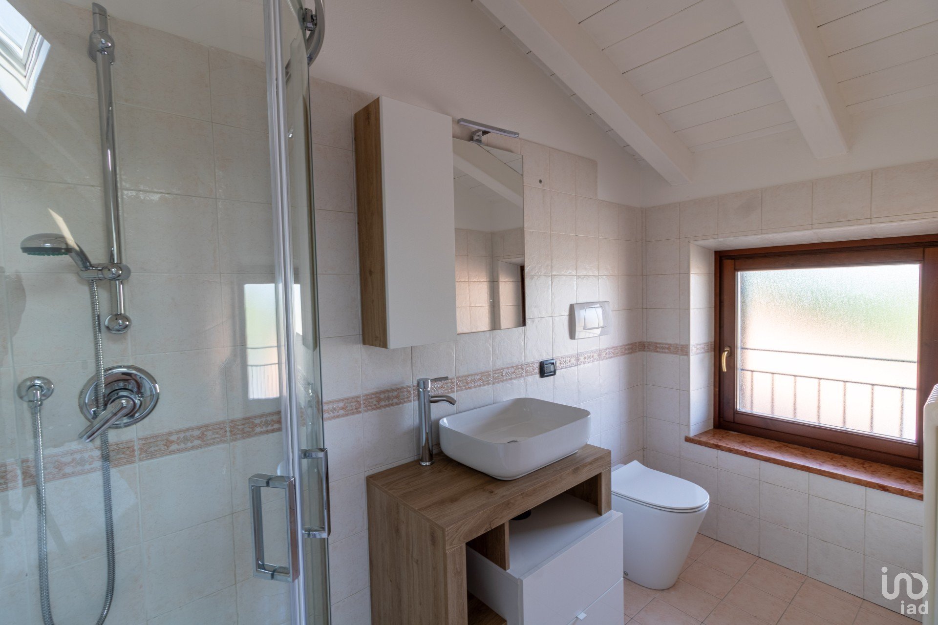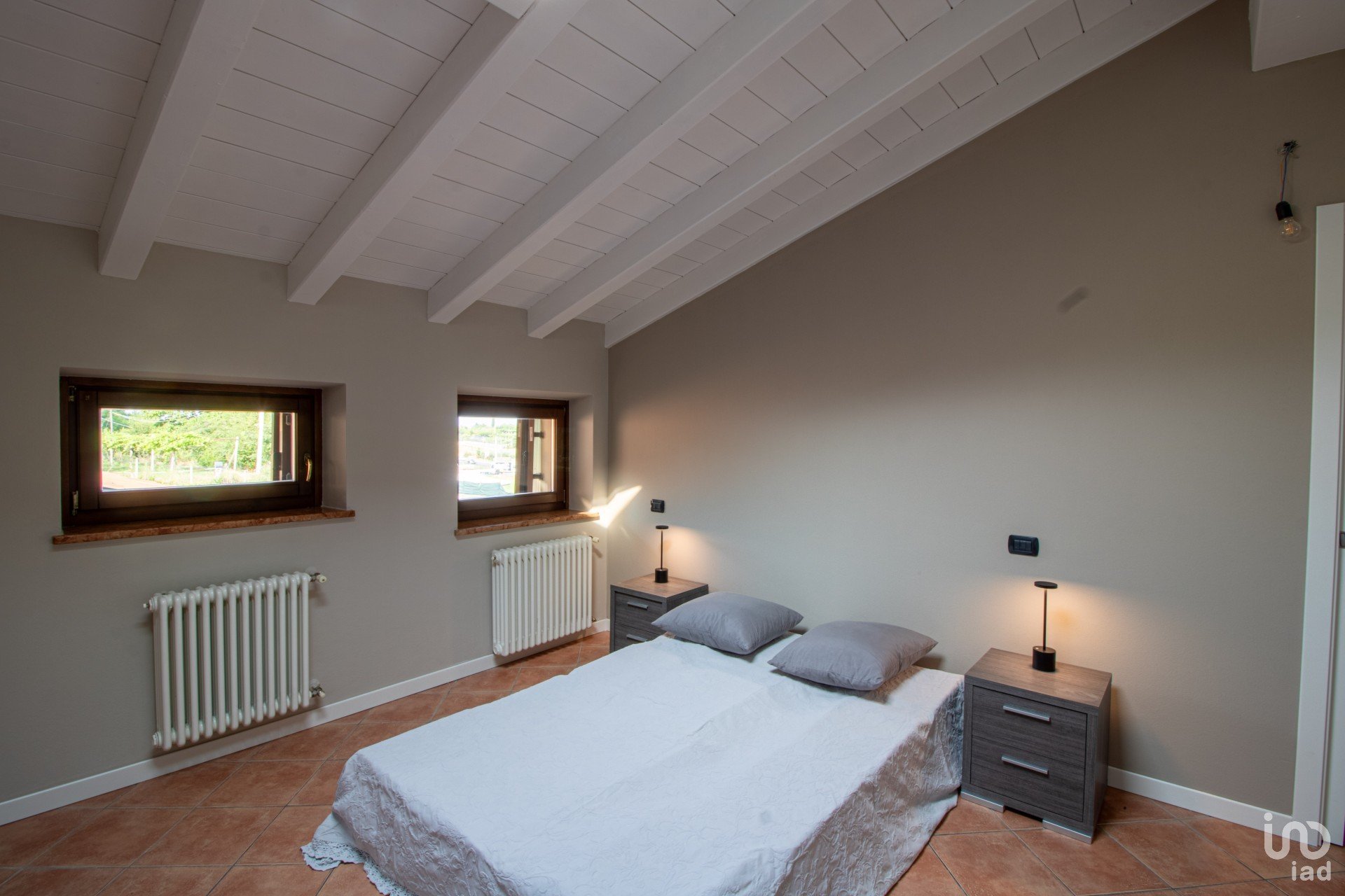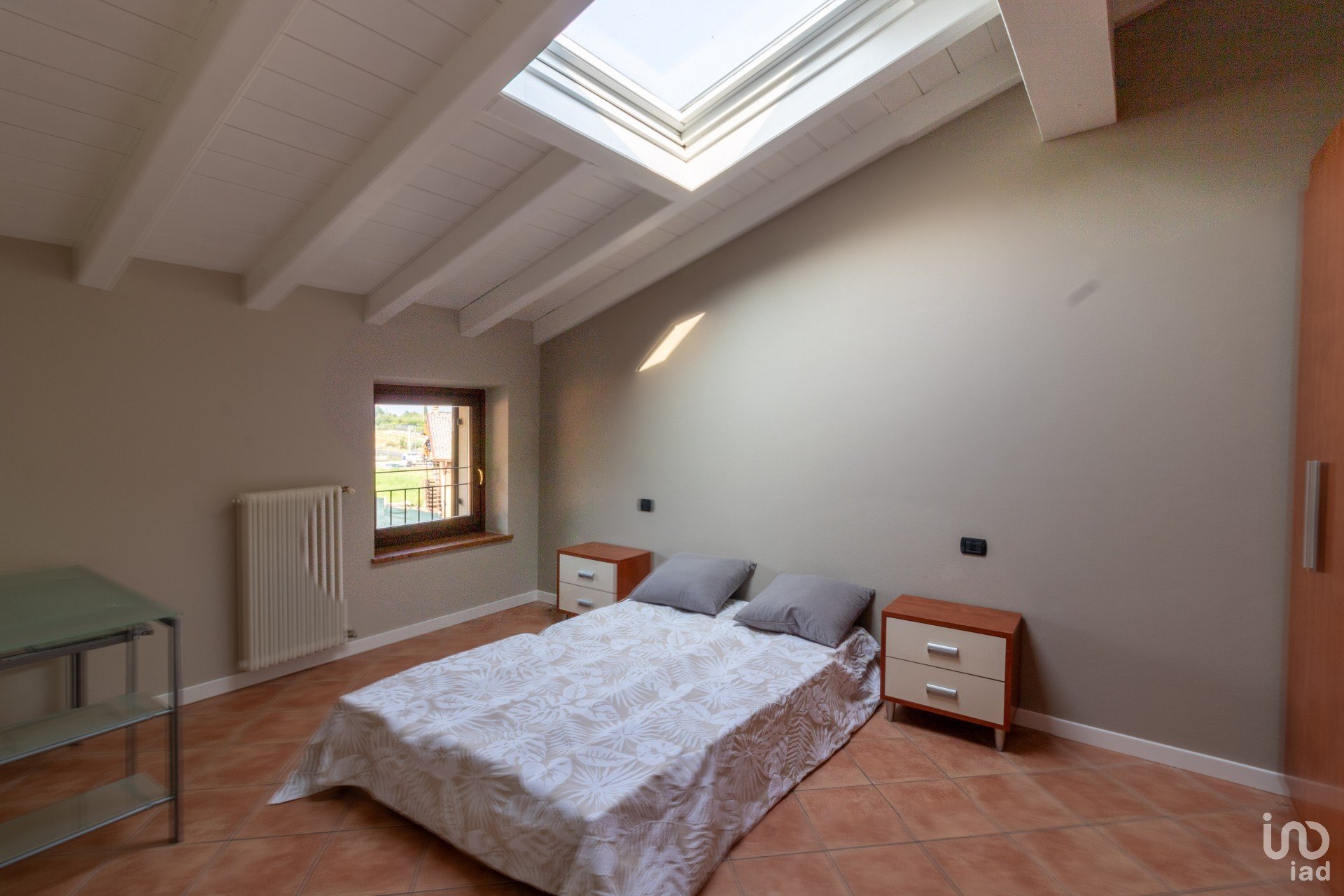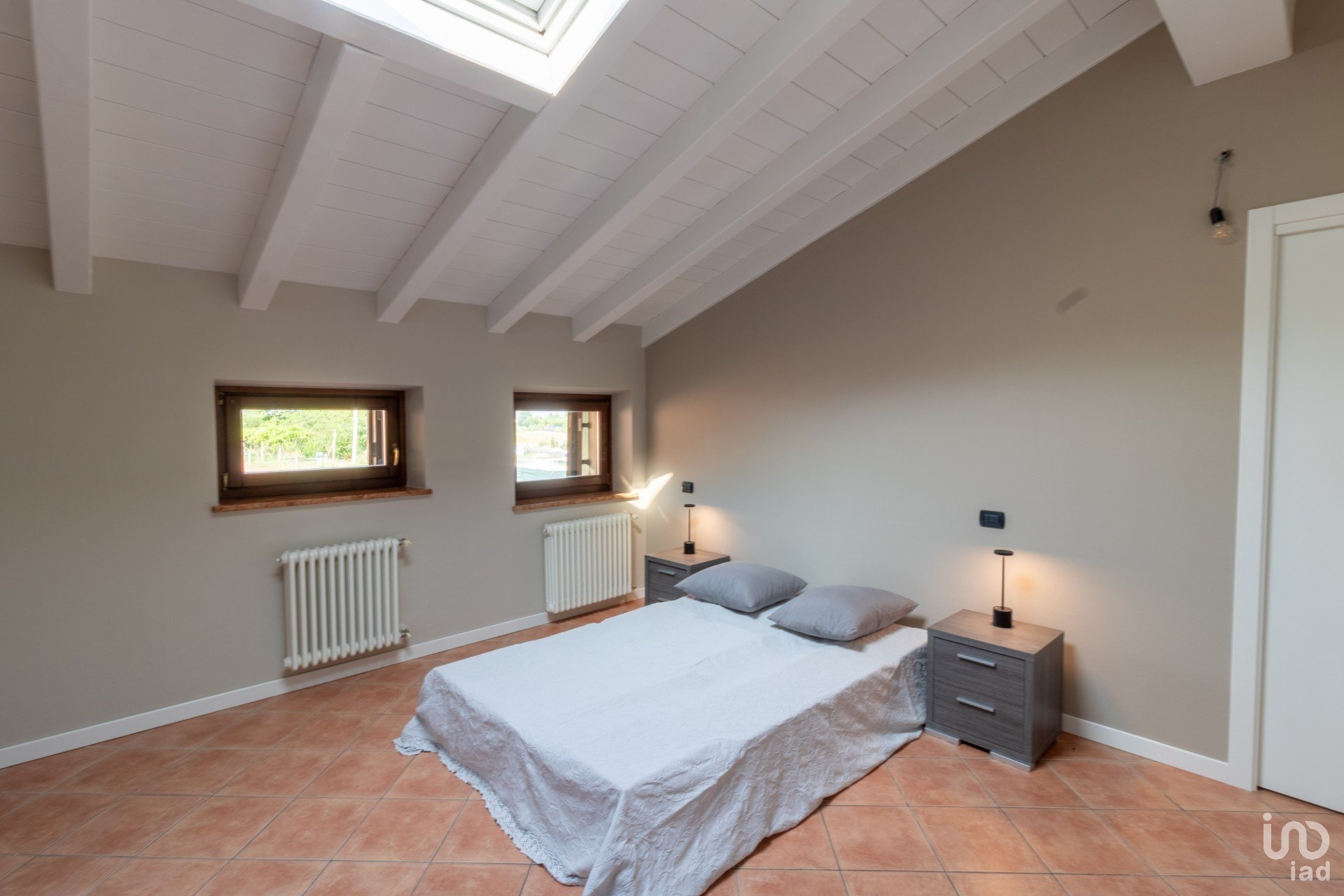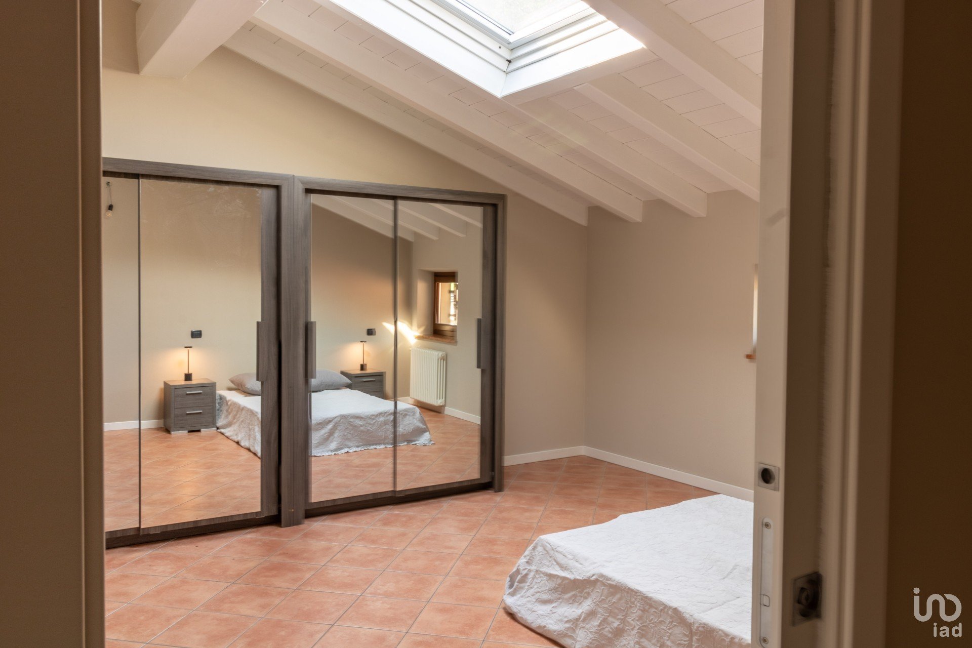 Appena varchi la soglia, vieni accolto da un’ampia zona giorno inondata di luce, dove le travi a vista bianche raccontano un’eleganza semplice e calda.