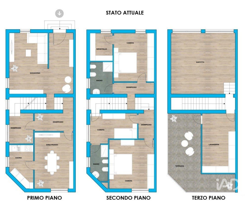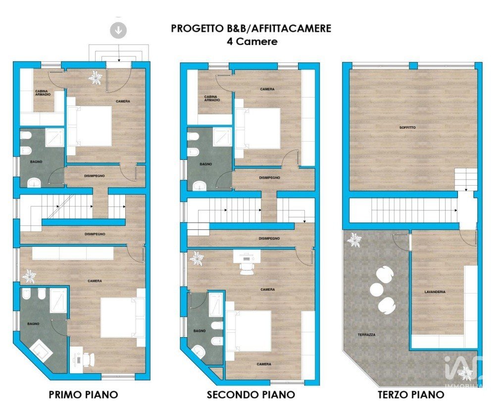 Secondo piano con tre camere, due bagni e ripostiglio