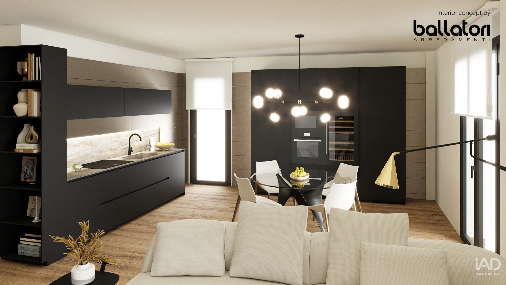 Cucina a isola con zona living direttamente collegata al terrazzo