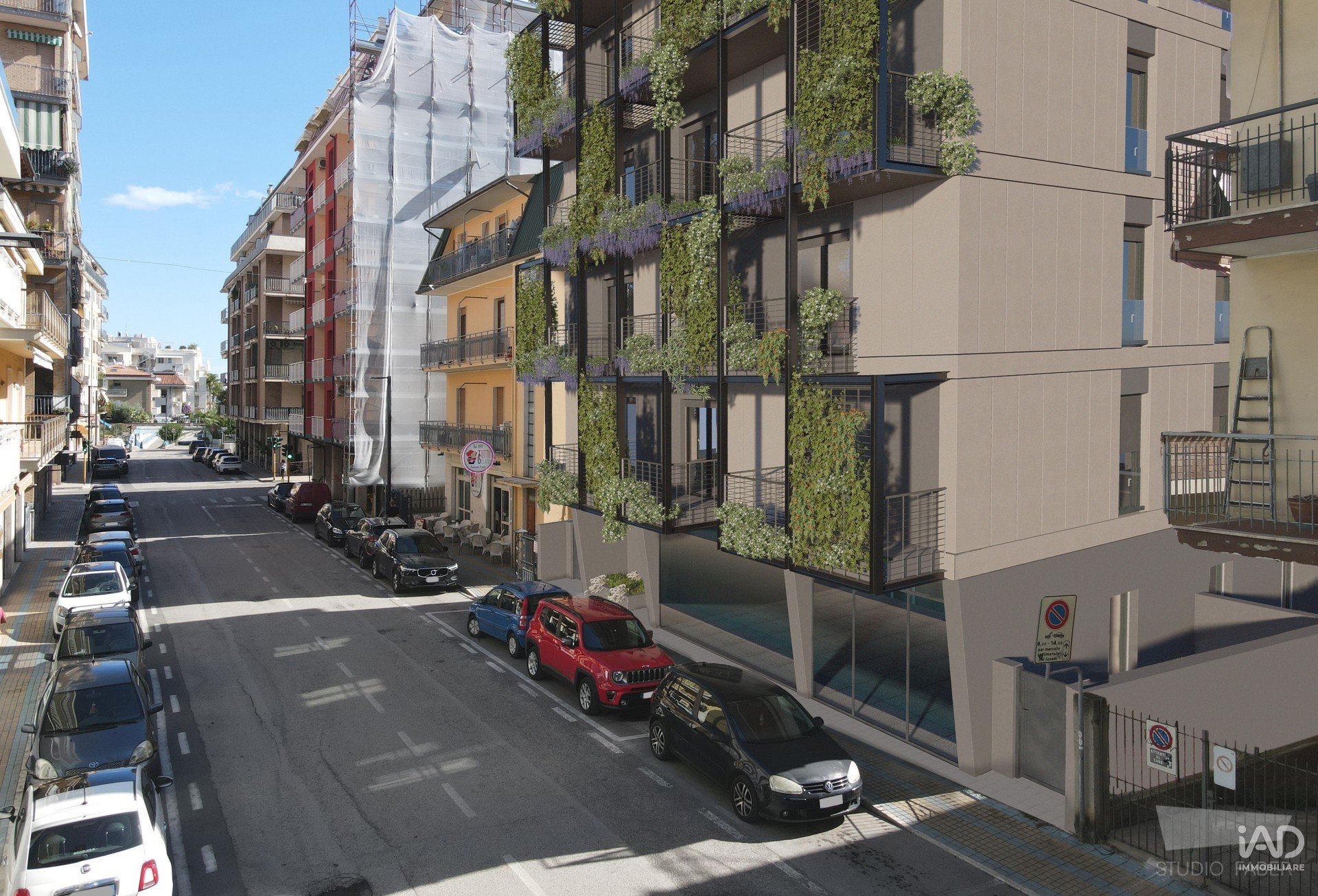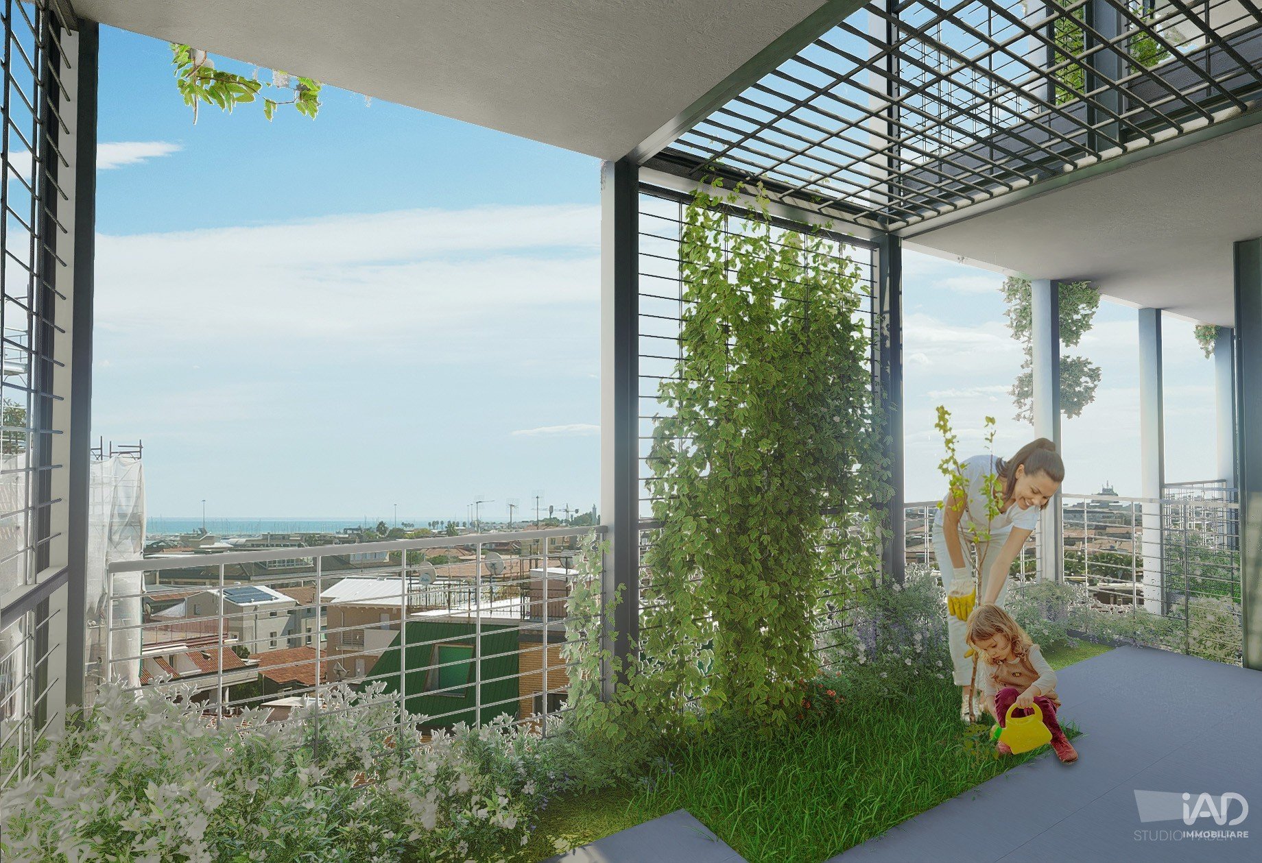 Ti alzi, due passi scalzi e sei già sul balcone. 13 metri di respiro profondo. Metti la moka sul fuoco, apri la porta-finestra e il caffè lo prendi fuori, tra le foglie di glicine che scenderanno l’anno prossimo fino a toccarti la testa. Sotto di te c’è solo il verde dei giardini e il rumore lontano delle onde: 300 metri in linea d’aria, ma sembra di sentire già la spiaggia.
