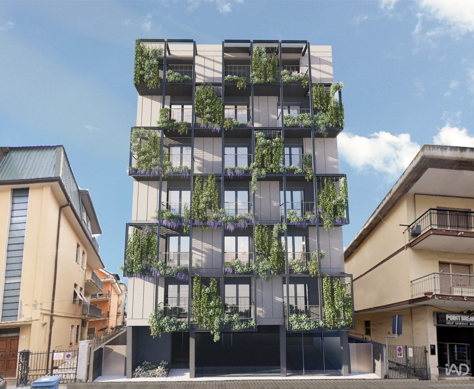 L’edificio è caratterizzato da un’estetica contemporanea molto pulita, con facciata ventilata grigio scuro/antracite e una ricca dotazione di verde verticale: