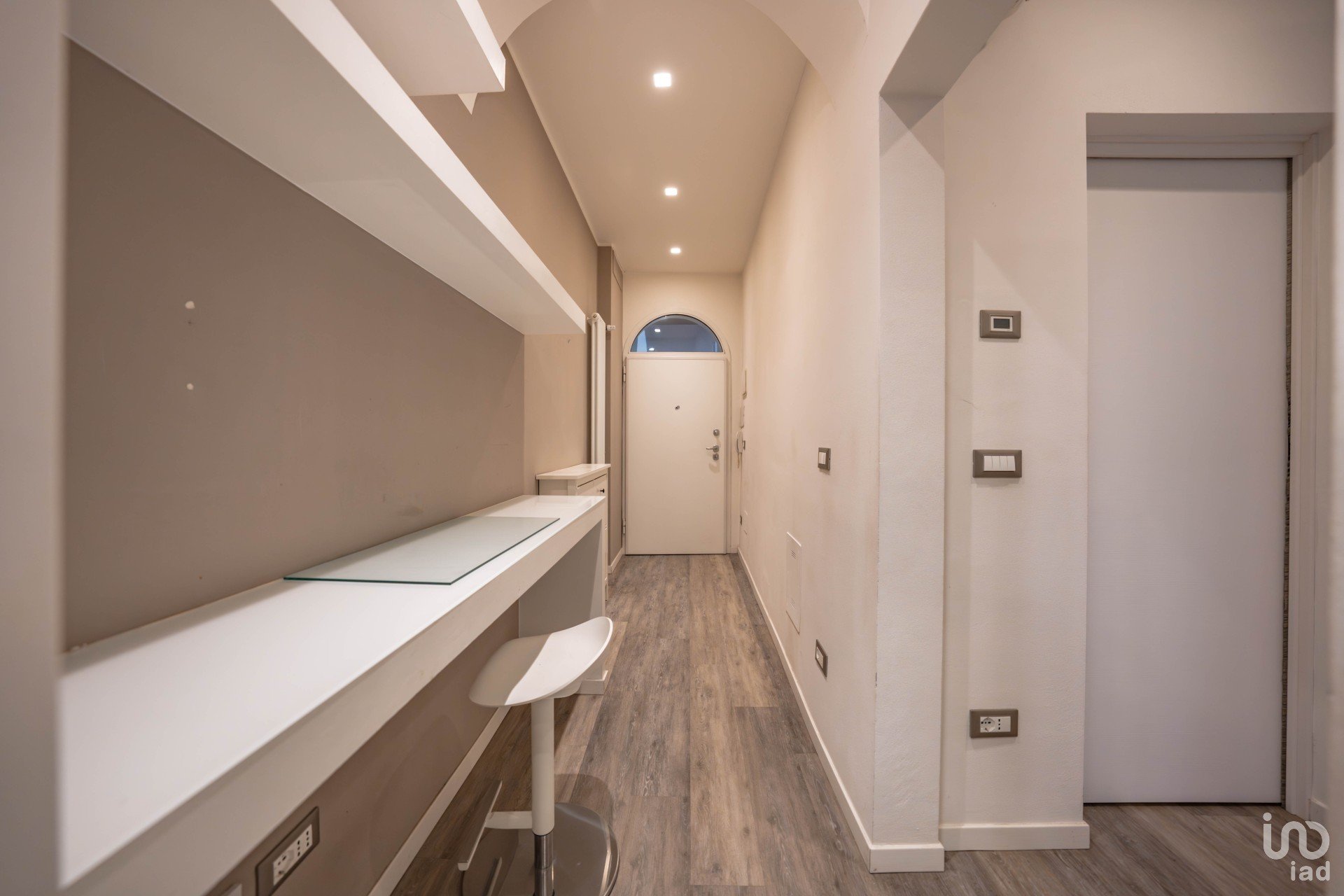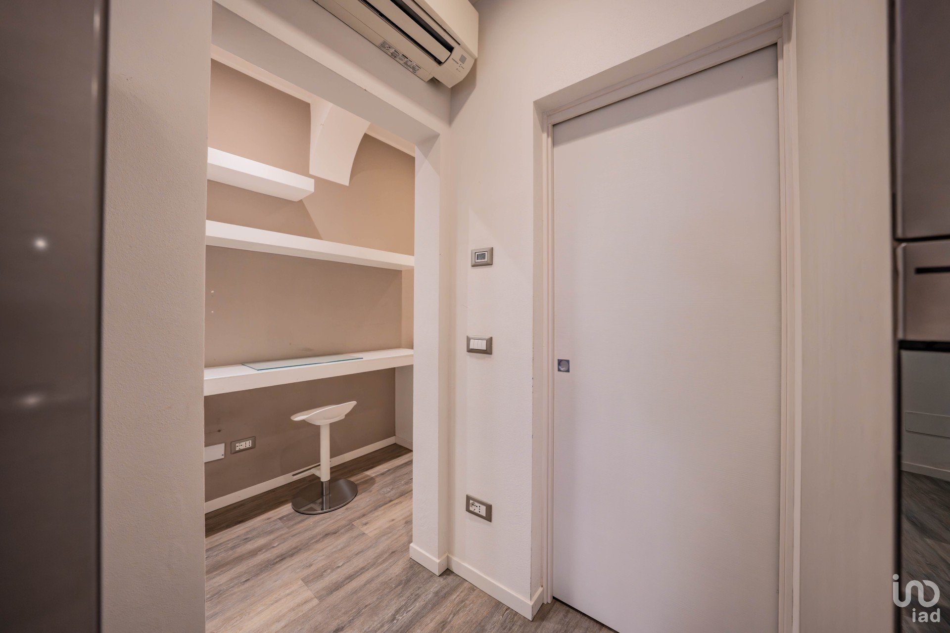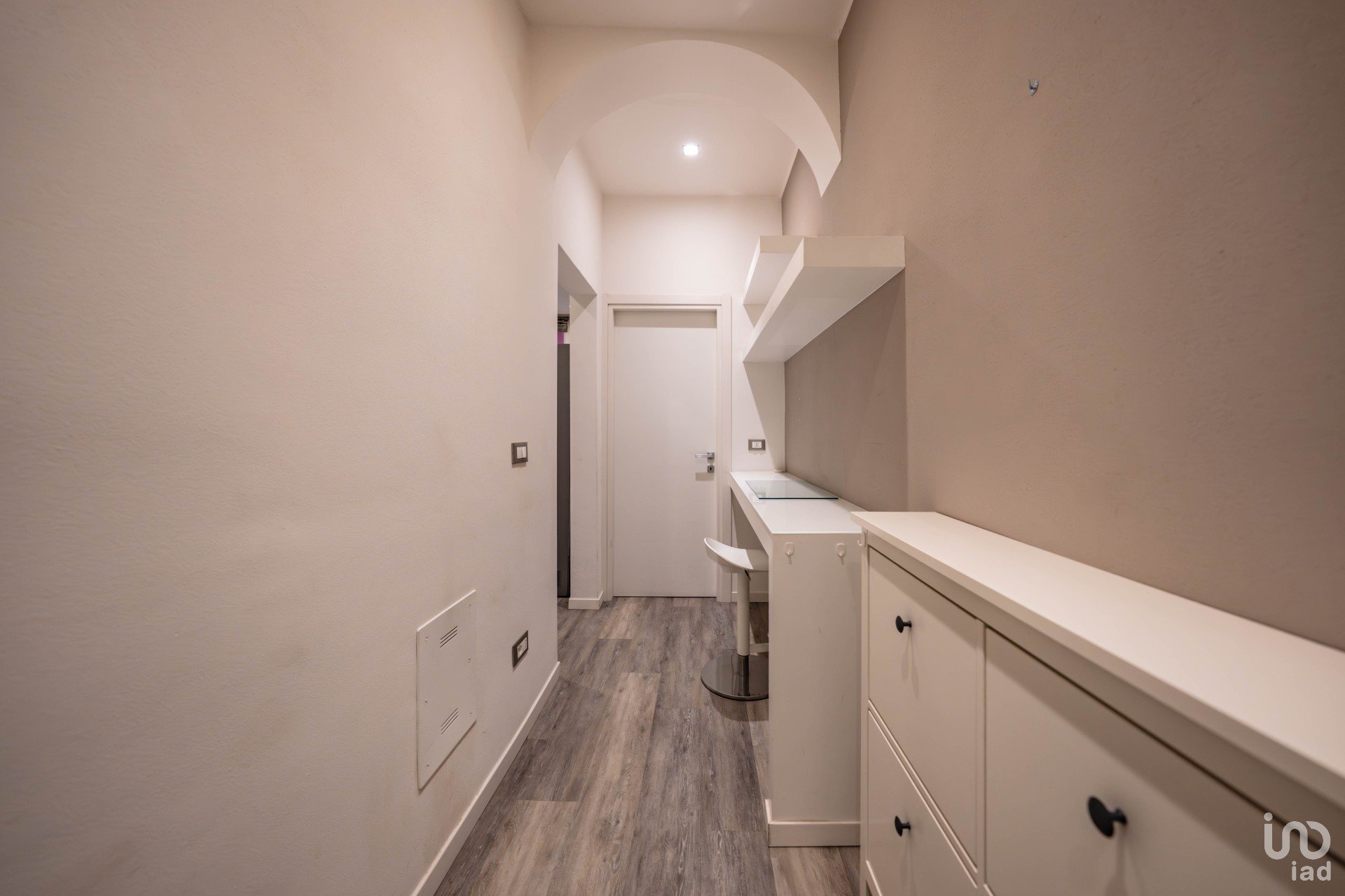Ingresso ampio e versatile, dove è stato sapientemente ricavato un angolo studio in cartongesso, completo di scrivanie e mensole: perfetto per lavorare o studiare in tranquillità.
