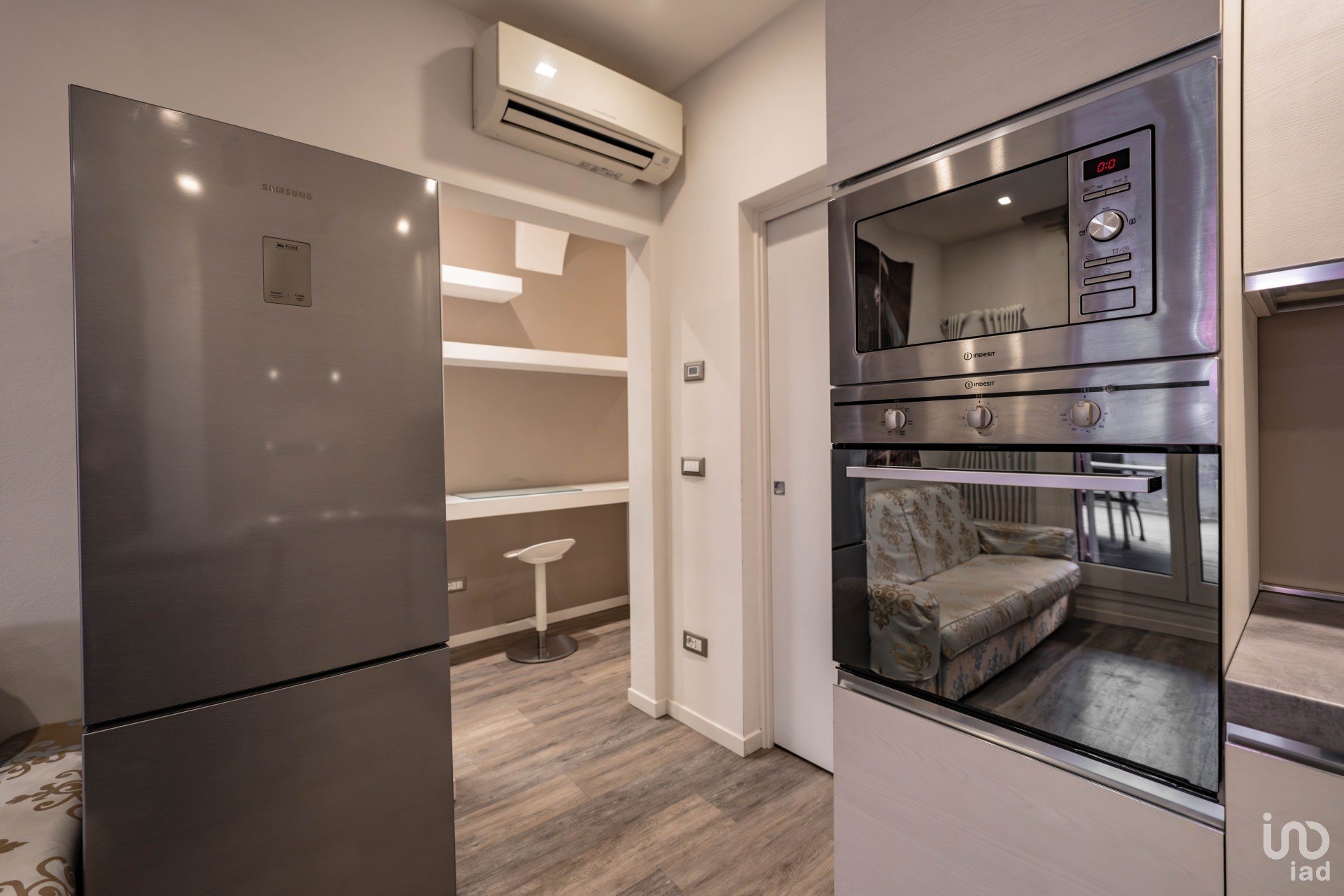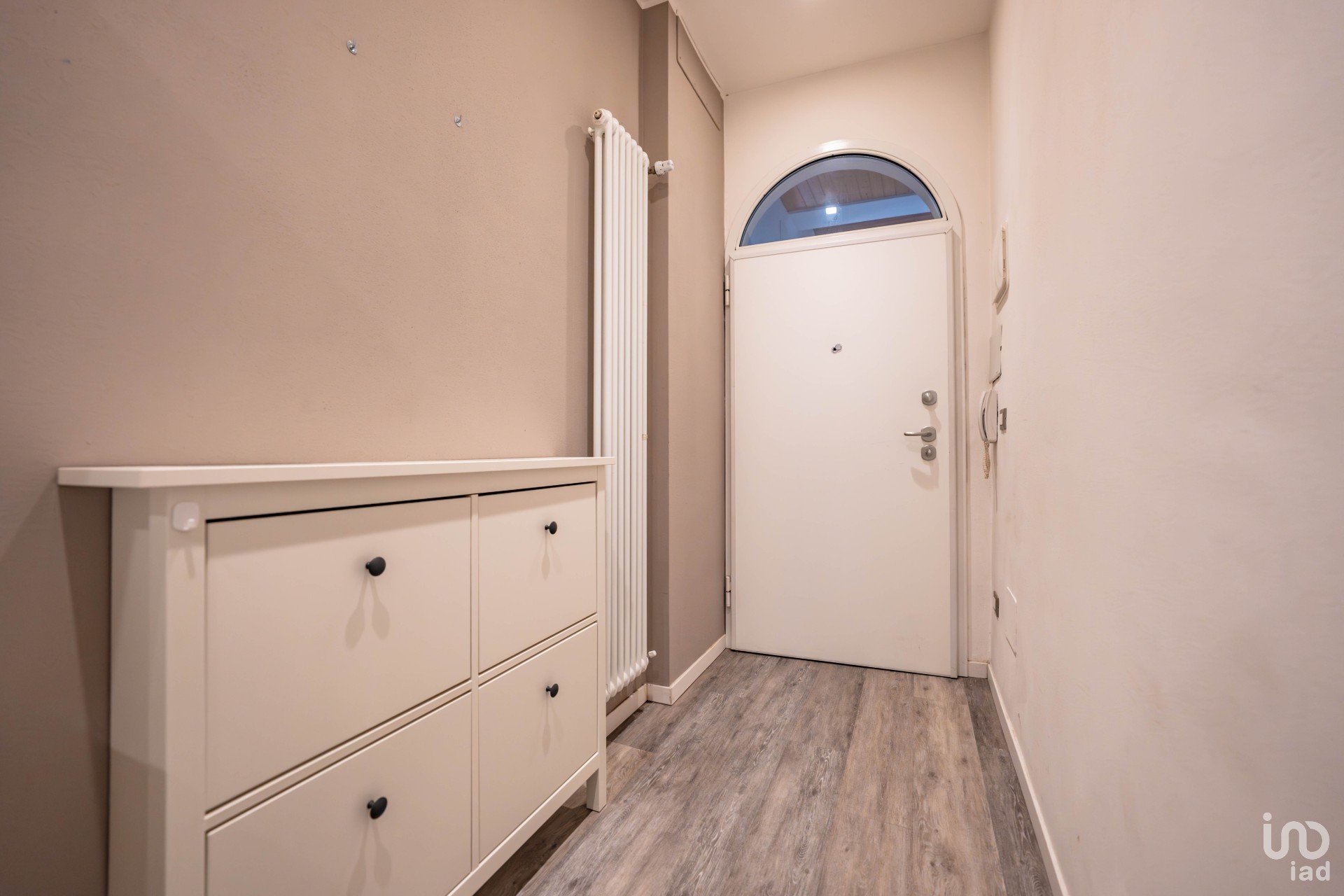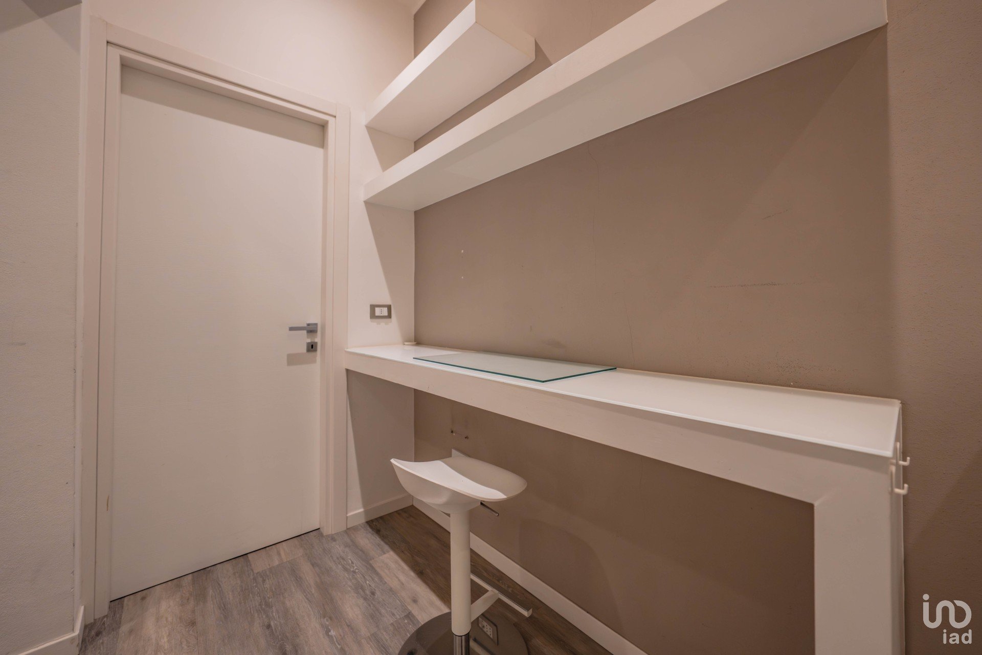Ingresso ampio e versatile, dove è stato sapientemente ricavato un angolo studio in cartongesso, completo di scrivanie e mensole: perfetto per lavorare o studiare in tranquillità.