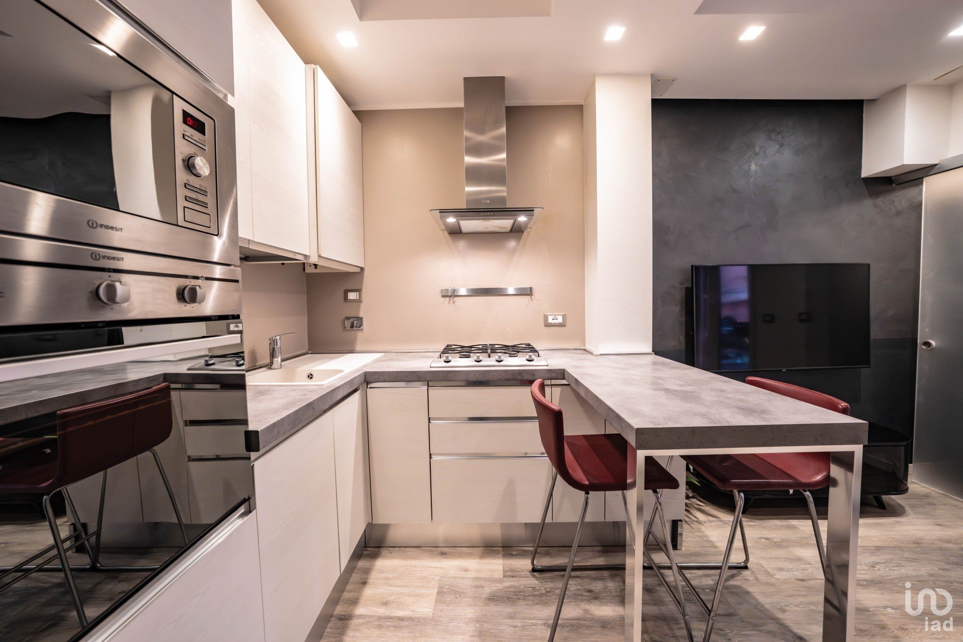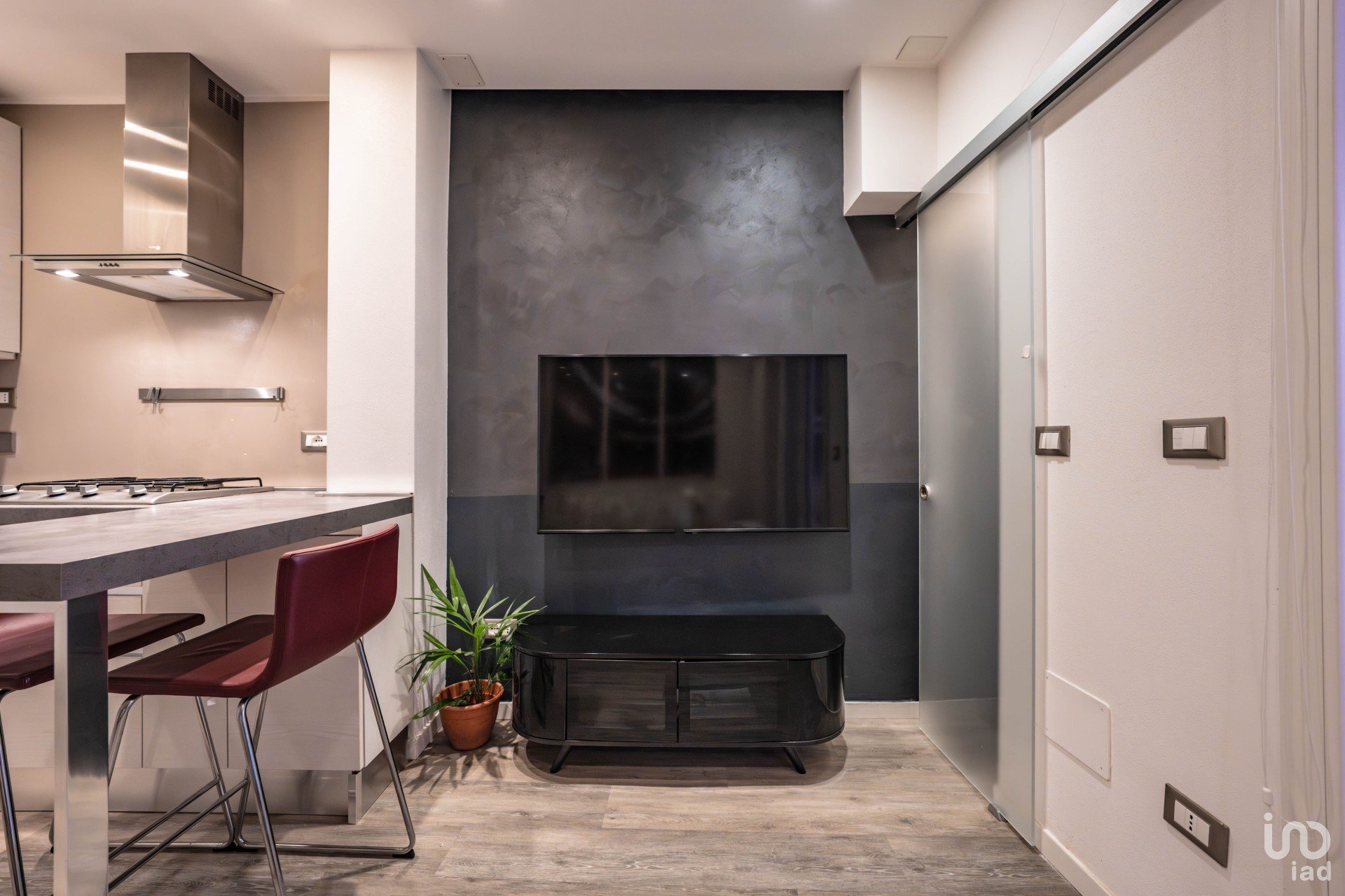 Zona living luminosa con angolo cottura moderno e cucina su misura, dotata di ogni comfort.
