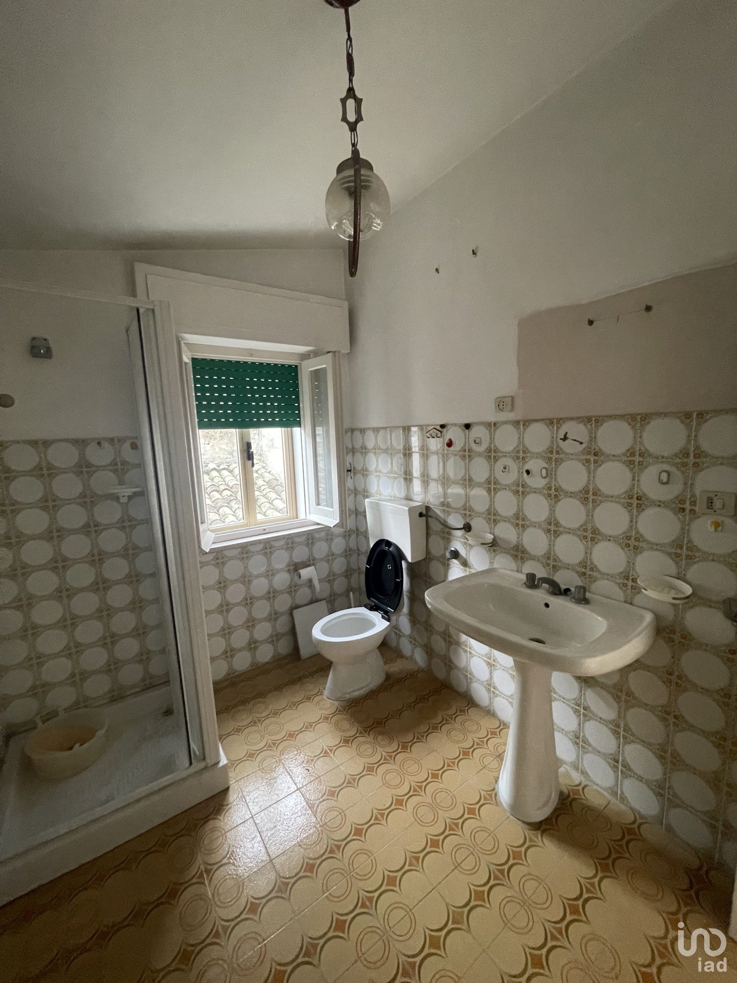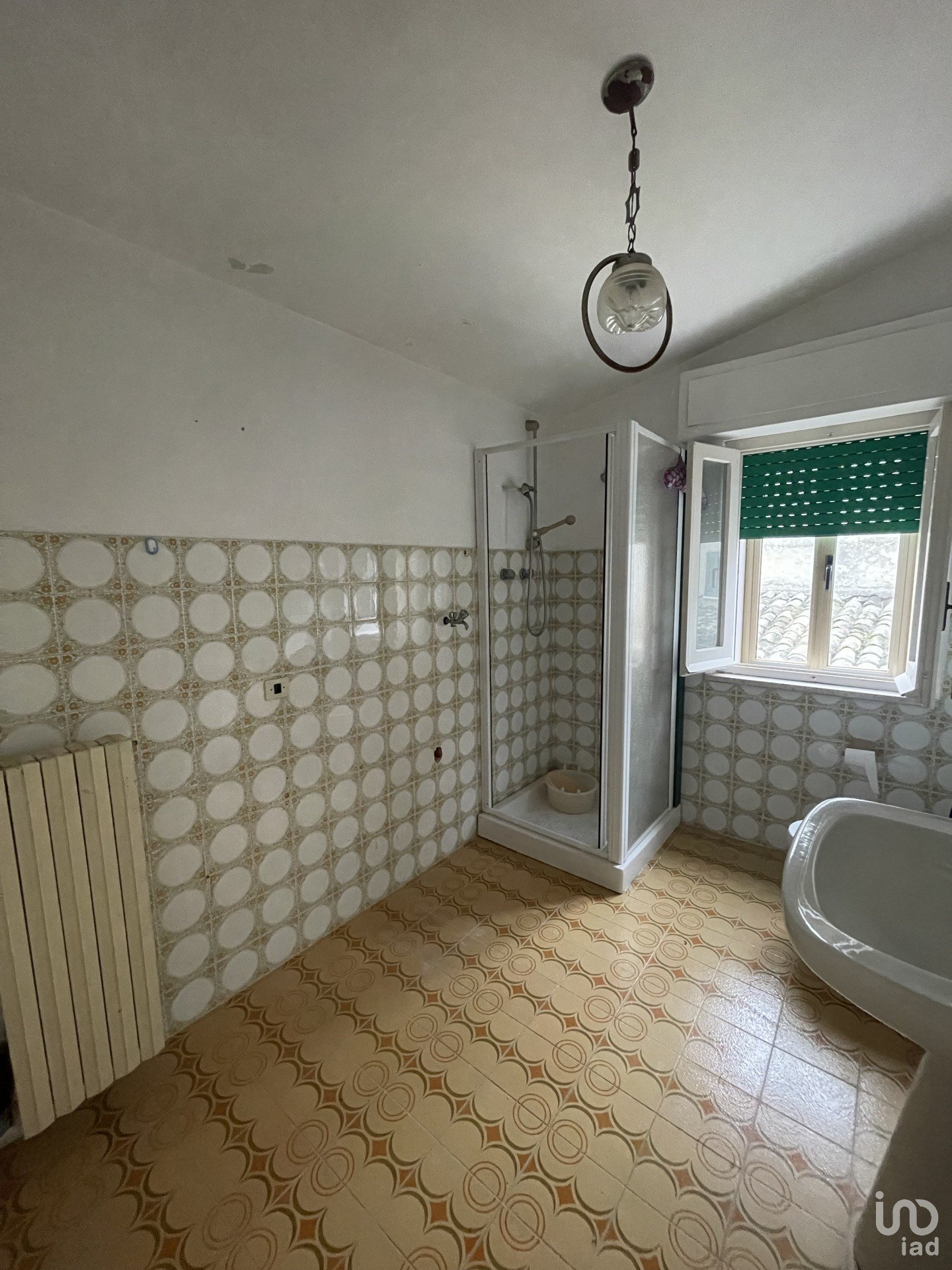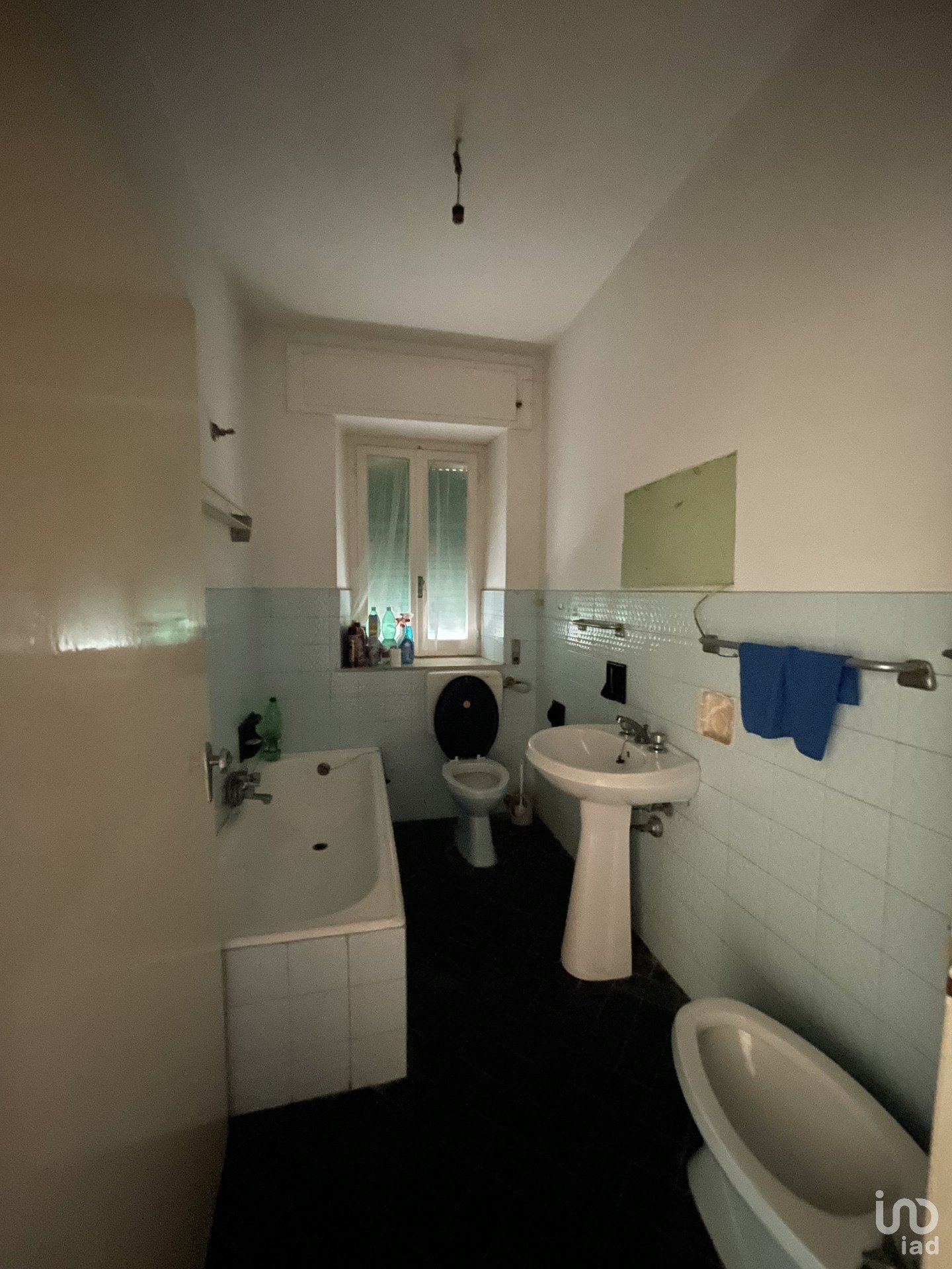 A seguire c'è un primo bagno, con rivestimento in piastrelle in stile anni '70, con finestra, vasca da bagno, wc e bidet.