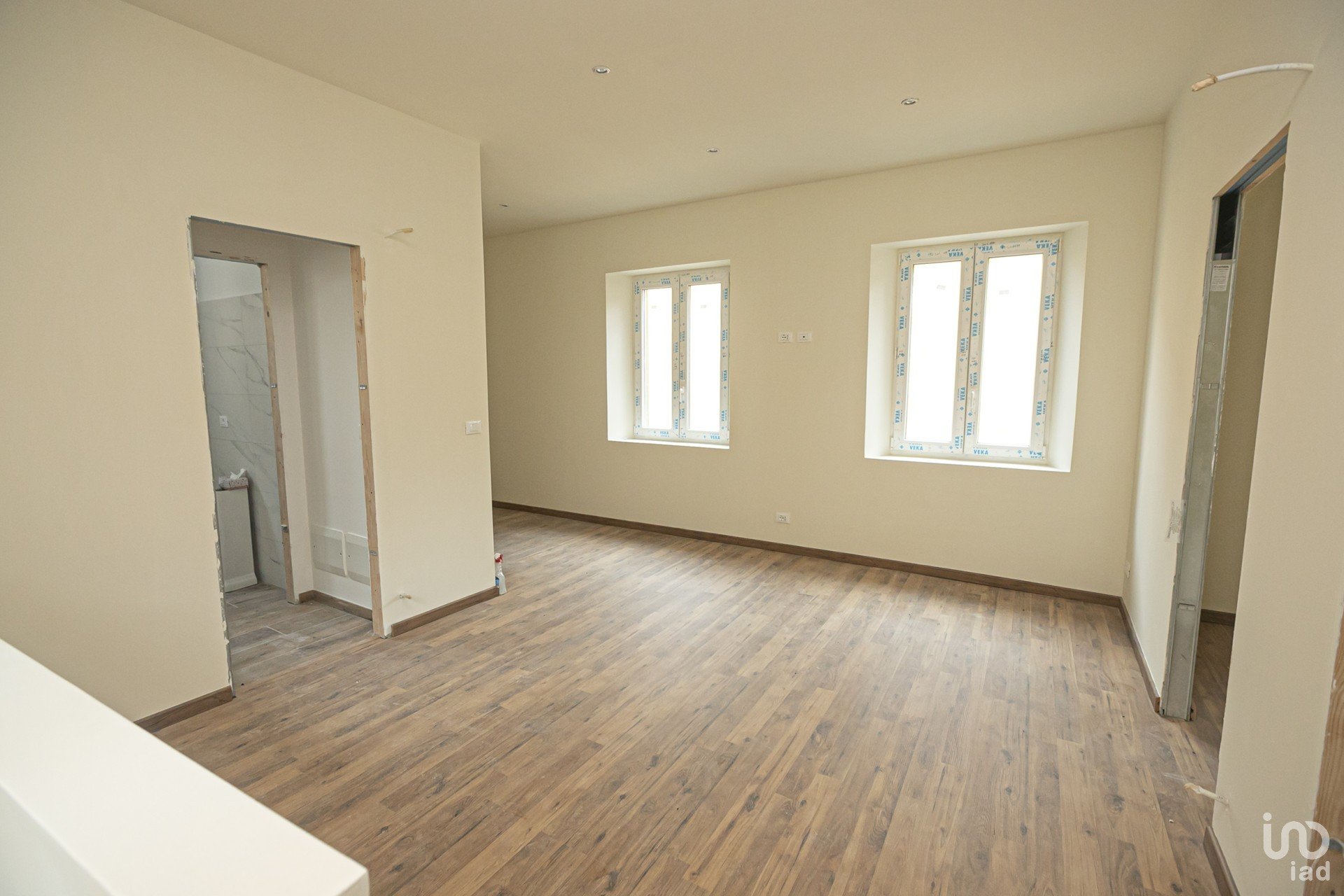 il primo piano, ossia l'appartamento ( con accesso indipendente con scala dal piano terreno ) composto da ingresso in grande zona giorno con cucina, due camere da letto ed il bagno con antibagno;