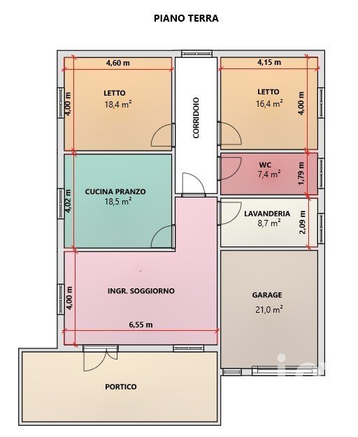Entrando abbiamo un'ampia zona giorno, abbiamo poi una cucina abitabile, due camere da letto, un bagno e una lavanderia posta in adiacenza al garage di circa 21 mq, dal quale accediamo direttamente dalla casa.