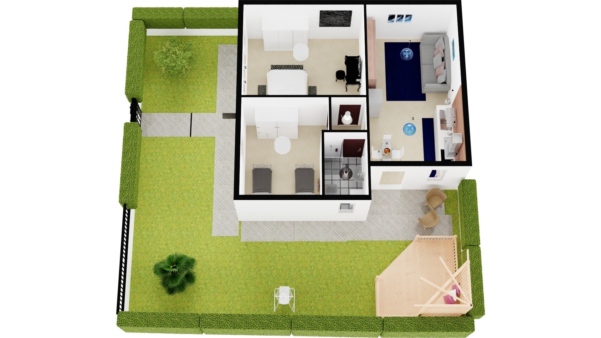 La villetta che presentiamo in vendita è ubicata al piano terra con ingresso indipendente, con una metratura coperta di 70 m² con serviti da un portico all'ingresso e giardino su due lati. Composto da soggiorno con angolo cottura, due camere da letto matrimoniali e bagno.