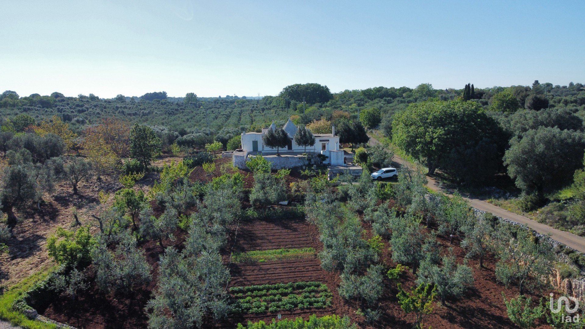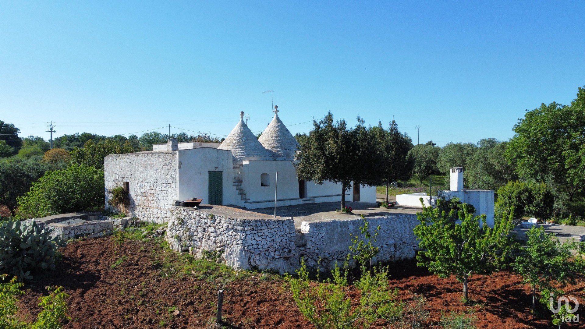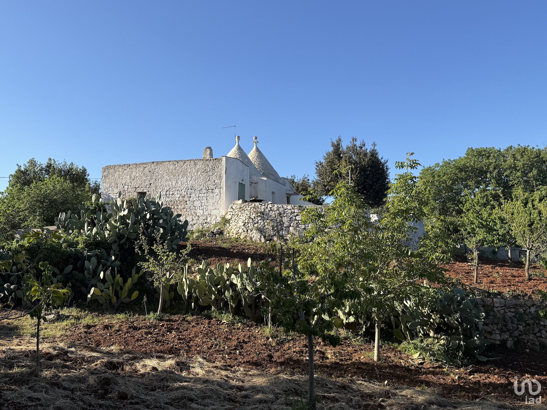 Il terreno, ben curato e completamente recintato, è coltivato a uliveto, orto irrigato, numerosi alberi da frutto, fichi d’India, e comprende anche una suggestiva porzione di bosco di querce.