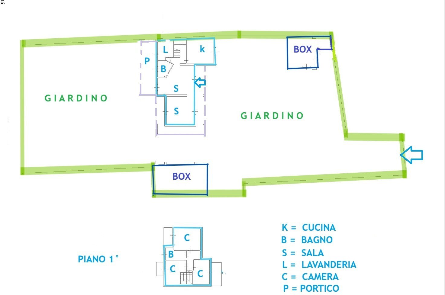 L’intera proprietà è situata su un’area recintata di mq. 1.230, nella quale sono presenti anche due box autorimessa: uno di mq. 45 e l’altro di mq. 23. L’accesso avviene mediante cancello pedonale e cancello carraio.