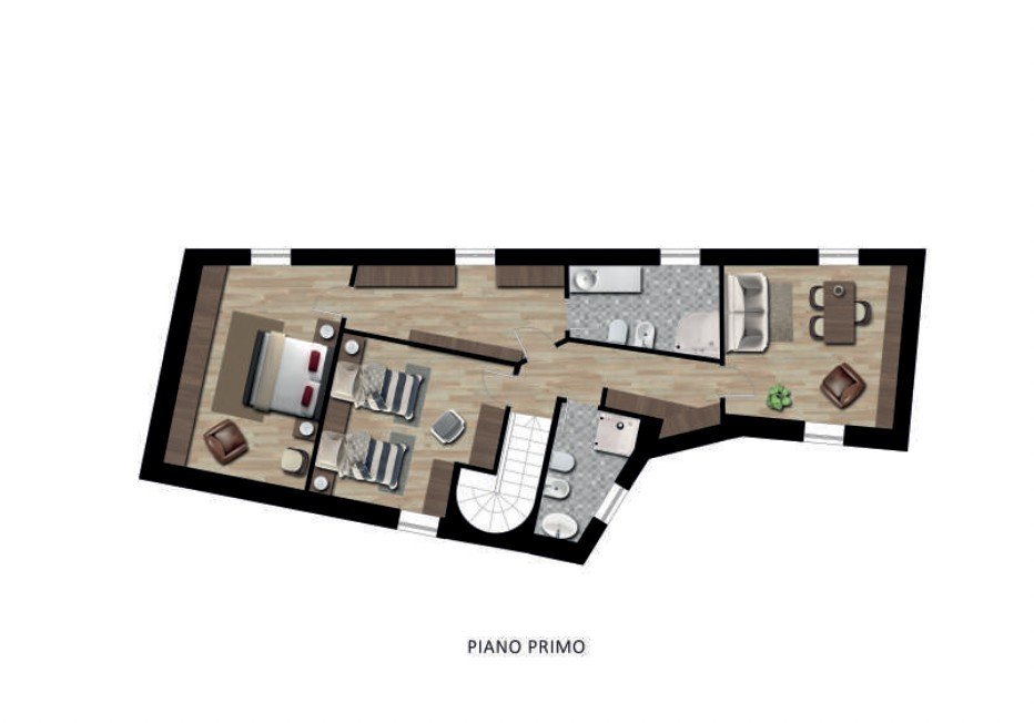 Al Primo Piano: Zona notte elegante composta dalla camera padronale con disimpegno-spogliatoio e bagno privato, oltre a due camere matrimoniali con bagno dedicato.