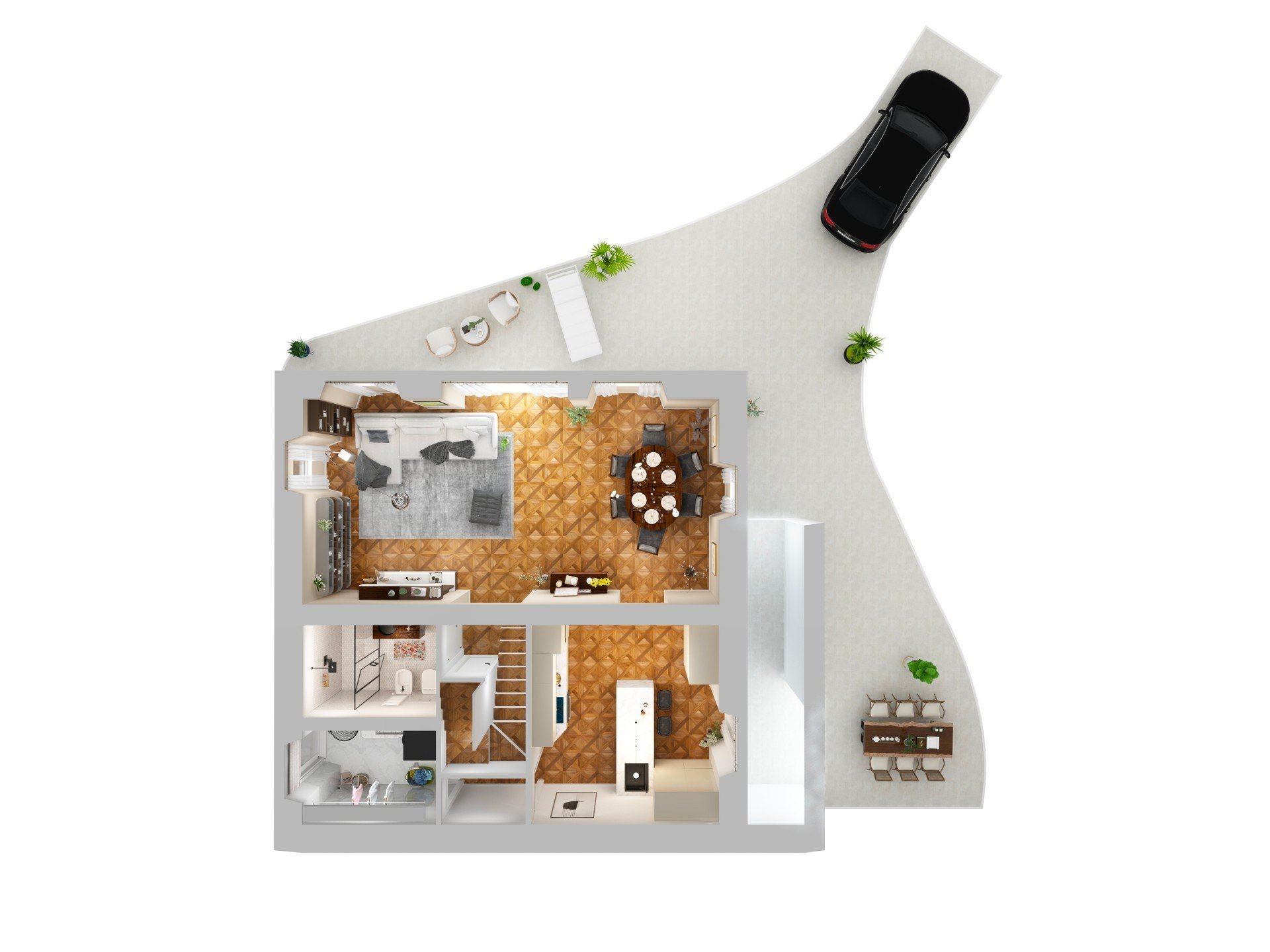 Dotata del suo Portico e Sottoscala, questa soluzione si sviluppa su due livelli. Dallo splendido ingresso con vetrata intera si accede al Piano Terra, che è interamente dedicato alla zona giorno con gran salotto, la sala da pranzo e una cucina abitabile da cui si accede diretti alla lavanderia. Un comodo bagno con doccia serve al meglio questo piano che è altresì dotato di due pratici ripostigli ricavati nei sottoscala, uno interno e uno esterno.