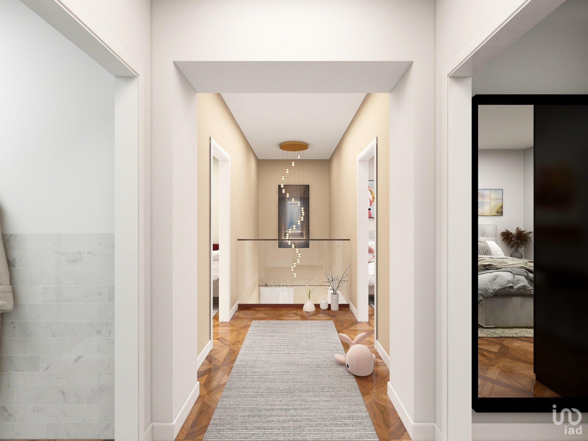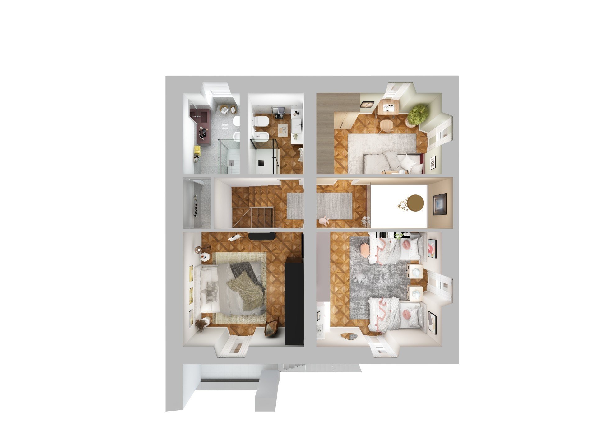 Al primo piano troviamo invece ad accoglierci l'intera zona notte, che con finiture calde ci presenta le sue tre camere, di cui due ampie matrimoniali, una peraltro dotata di ampio bagno con doccia e l'altra invece utilizzabile anche come doppia, mentre l'effettiva camera doppia è altrettanto comoda e spaziosa.