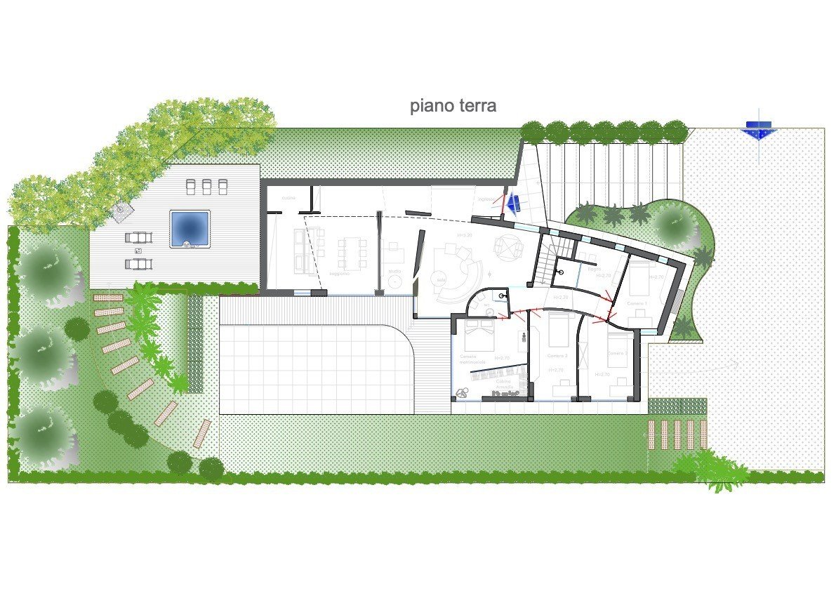 Nella zona giorno offre spazi interni raffinati e funzionali: ampio salone, cucina a vista che si apre sulla zona pranzo. Nella zona notte sono presenti tre camere da letto e servizi. Al piano interrato trovano spazio una lavanderia ben organizzata e un comodo garage con due posti auto.