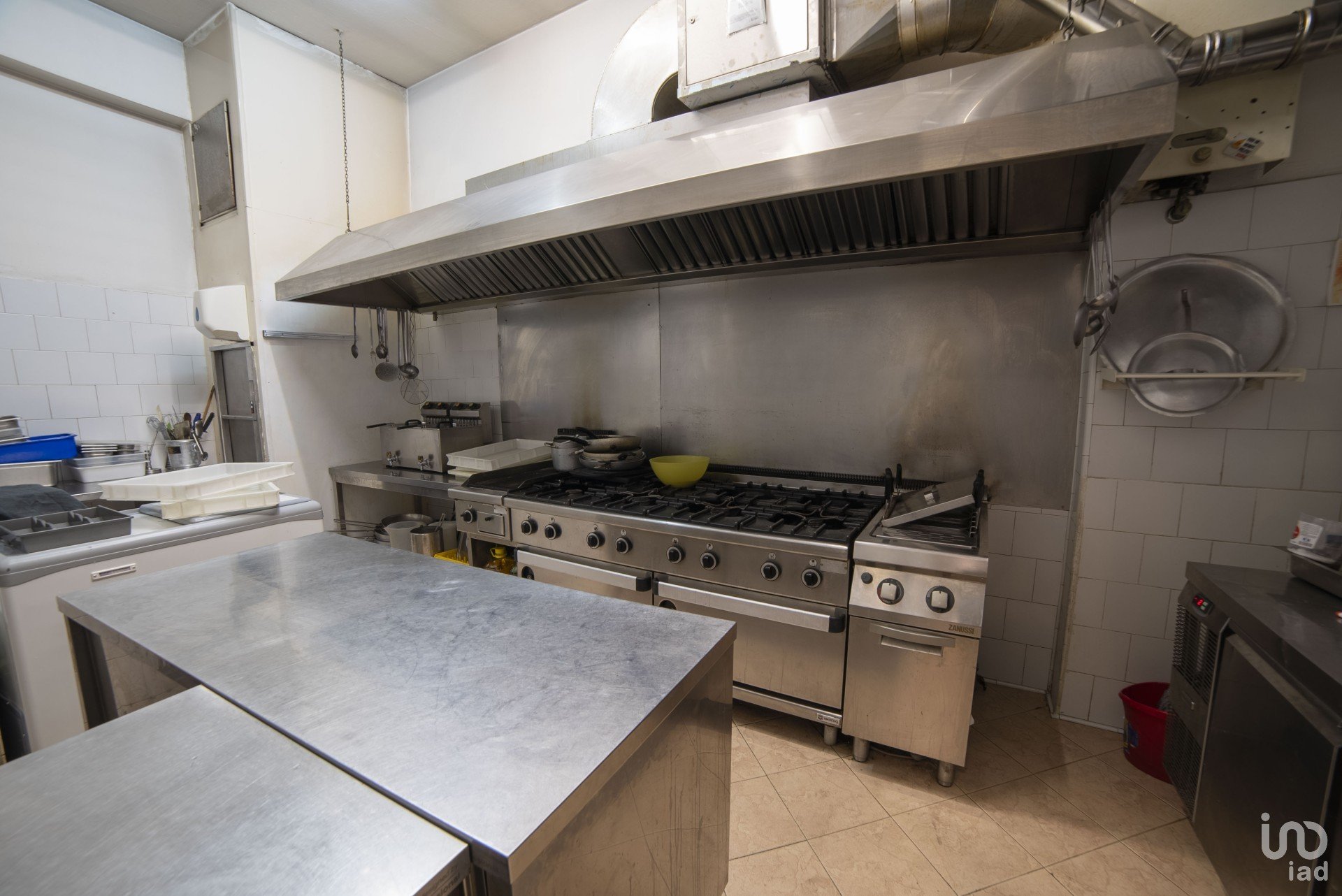 CUCINA: attrezzata con 8 fuochi a gas, cuoci pasta a tre scomparti, friggitrice a due cestelli, piastra di cottura in ghisa, abbattitore temperatura cibi, affettatrice.
