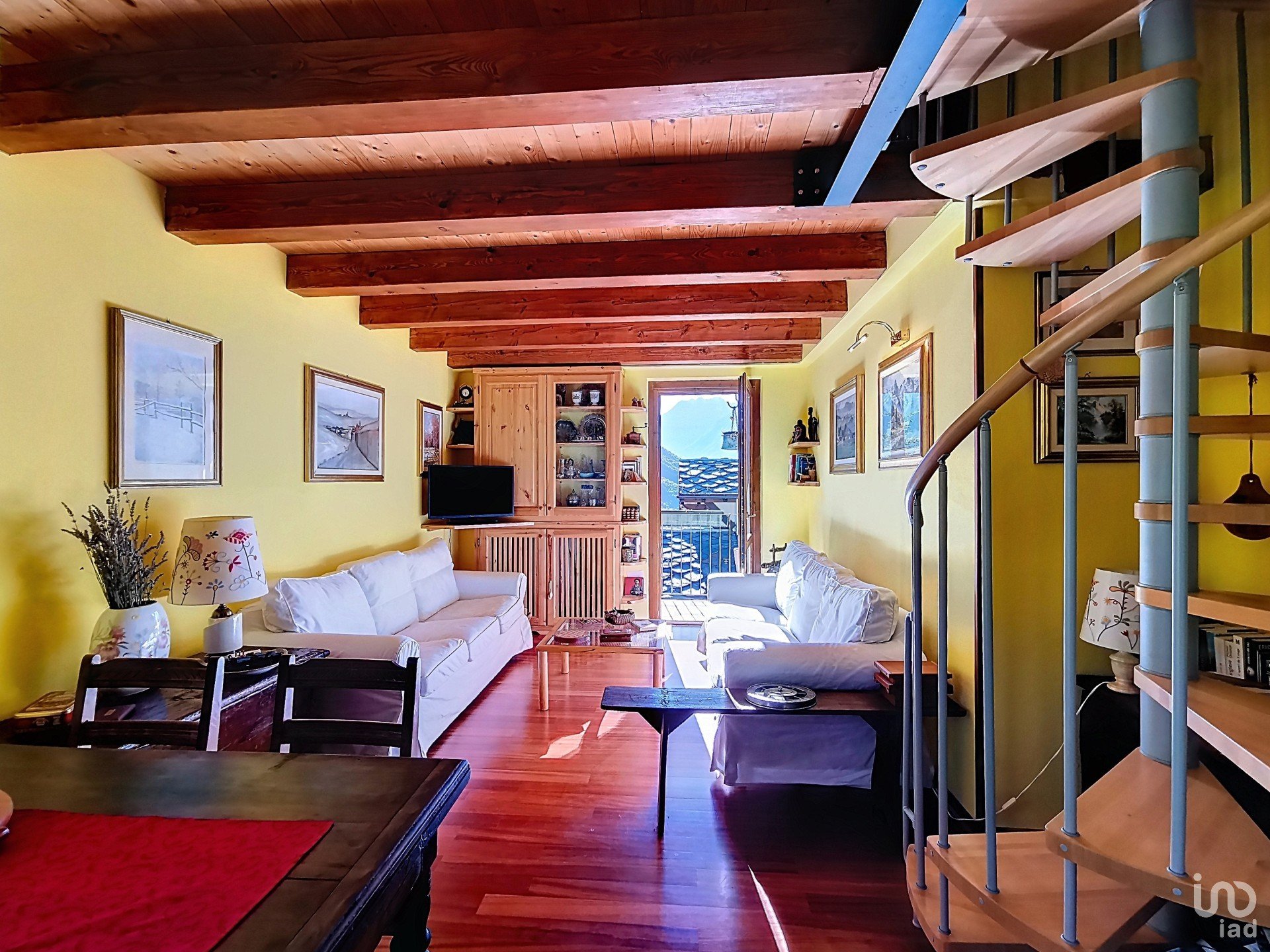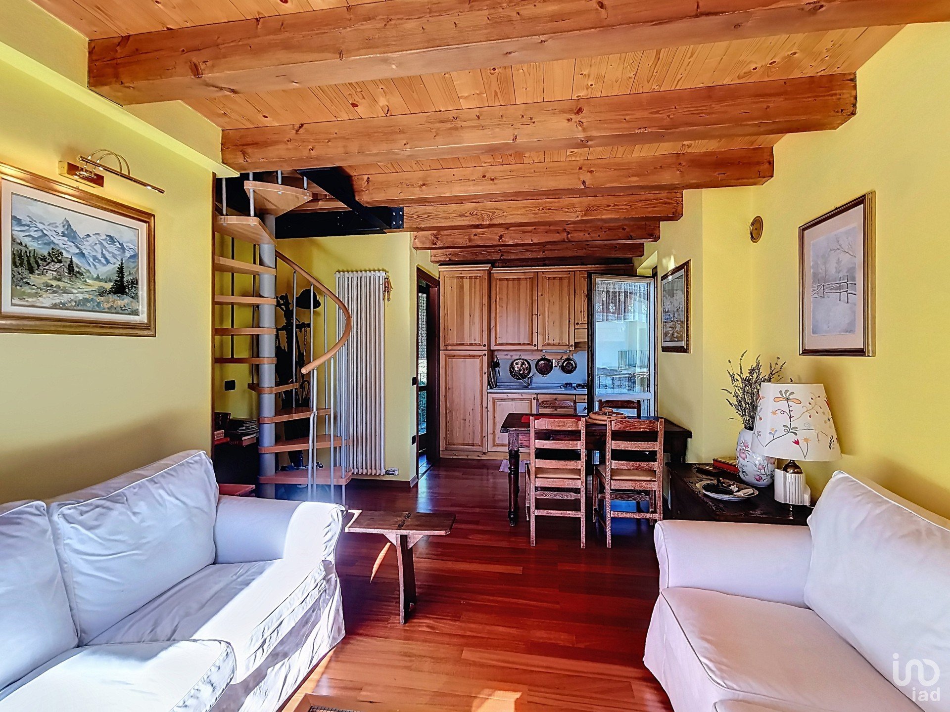 Zona giorno al primo piano: entra in un ambiente caldo e invitante con pavimenti in legno lucido e un soffitto con travi a vista che aggiungono un tocco rustico e raffinato. I divani bianchi creano un'atmosfera di relax, perfetta per le serate in famiglia o con amici.