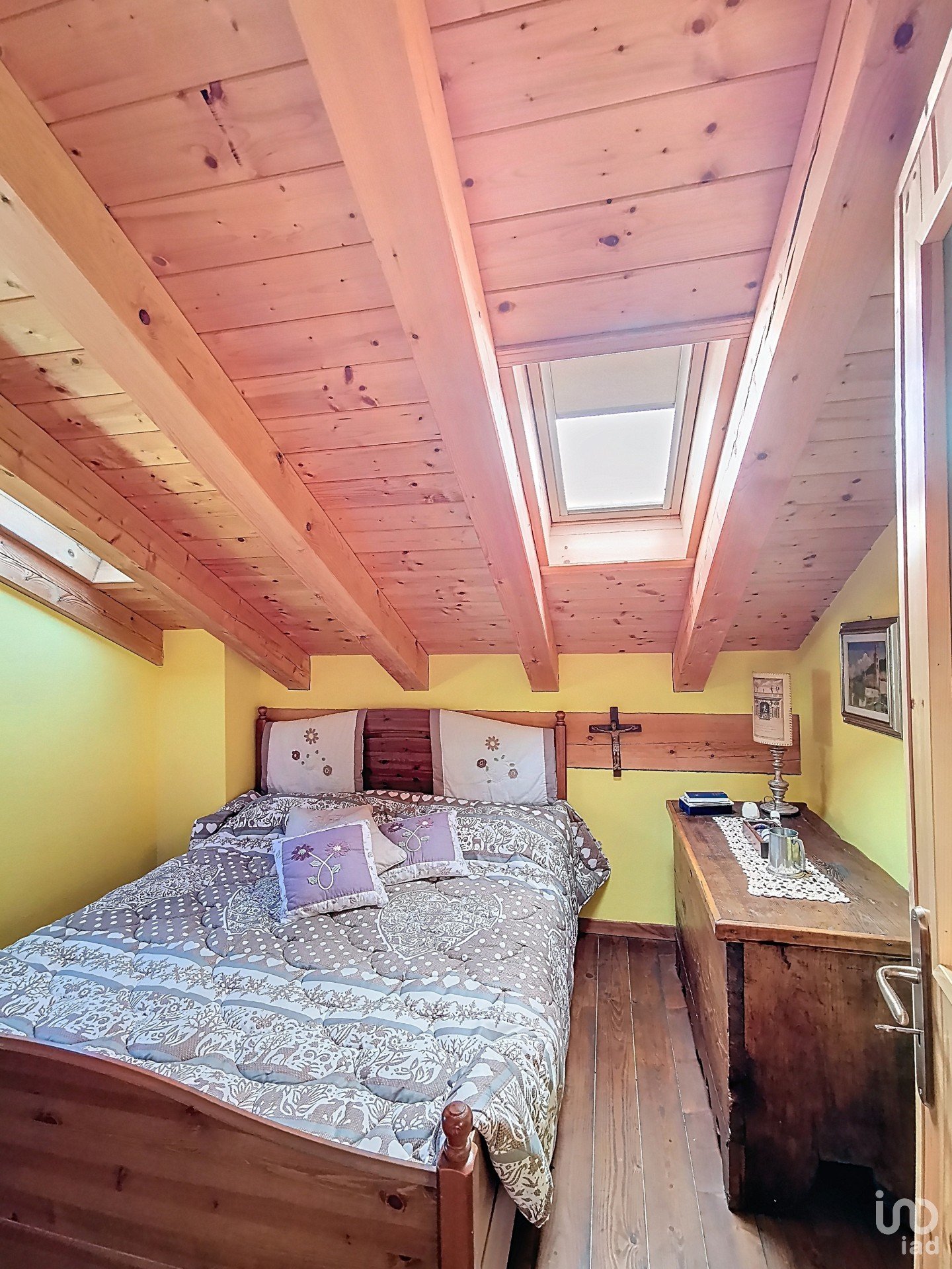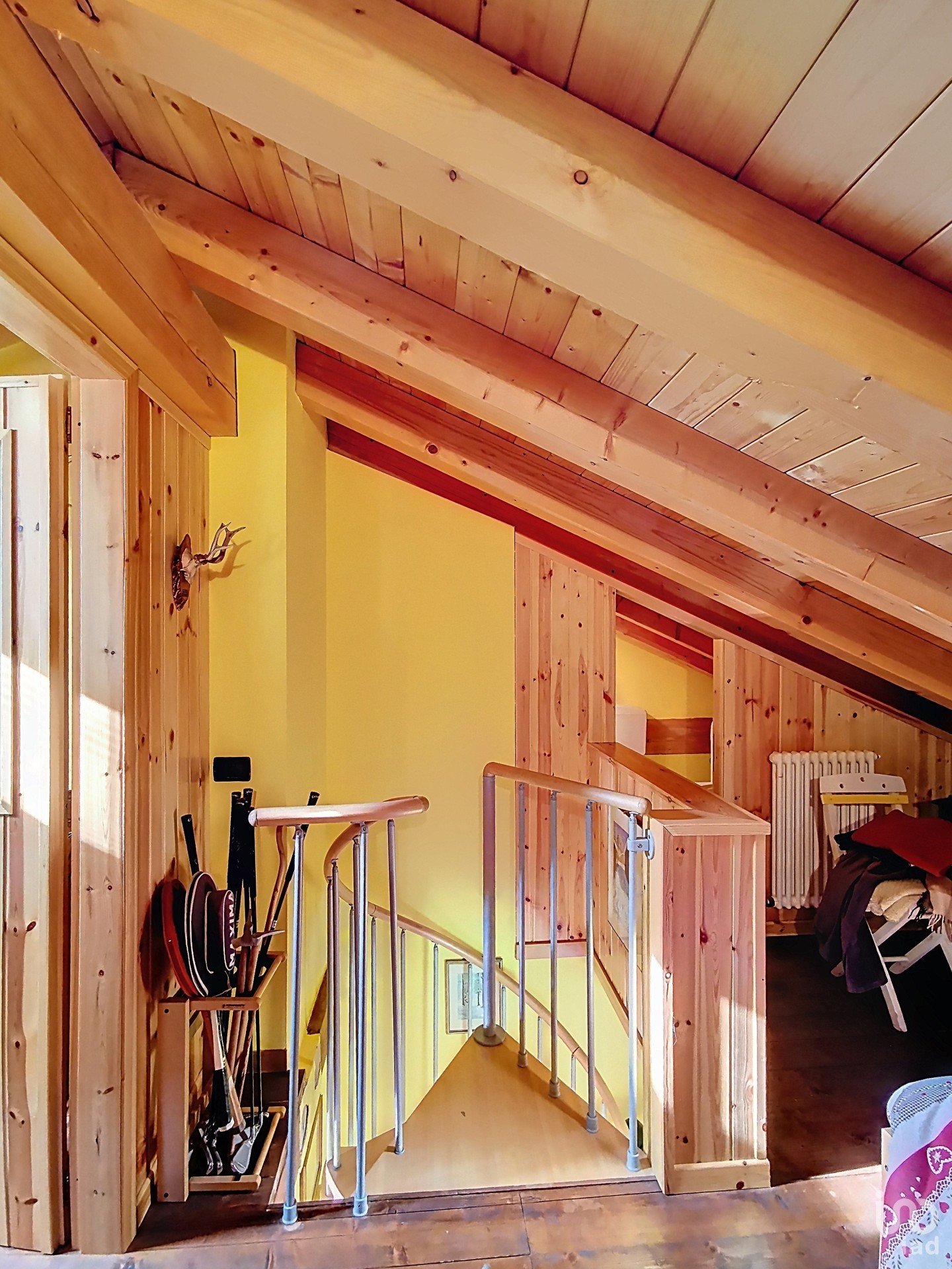 Sottotetto al piano secondo: salendo la scala a chiocciola, si accede al piano superiore. Questo livello è concepito come zona notte e offre attualmente due ambienti notte distinti e un pratico servizio igienico aggiuntivo.