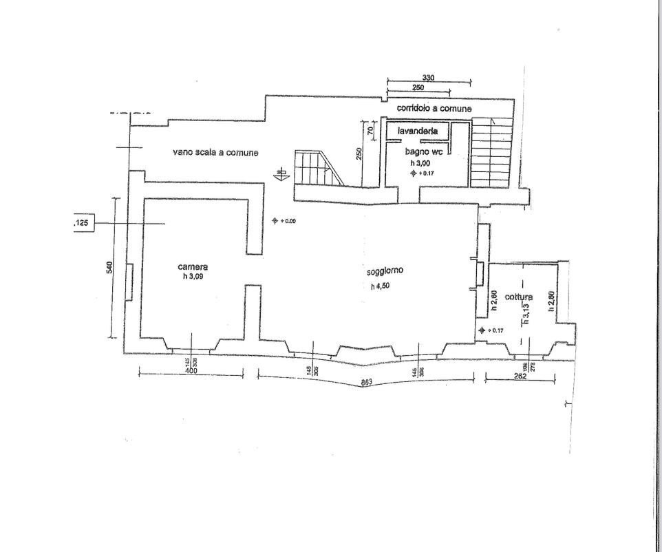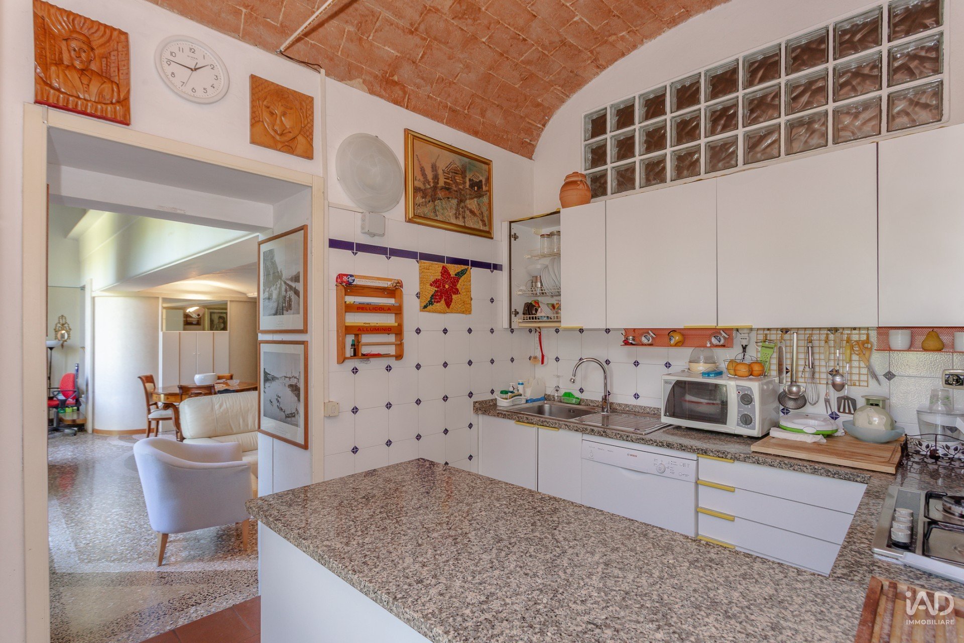 Un ampio soggiorno affrescato con sala da pranzo, soppalco artigianale in legno navale dal quale si può ricavare la seconda camera o studio, cucina, una camera matrimoniale e un bagno.