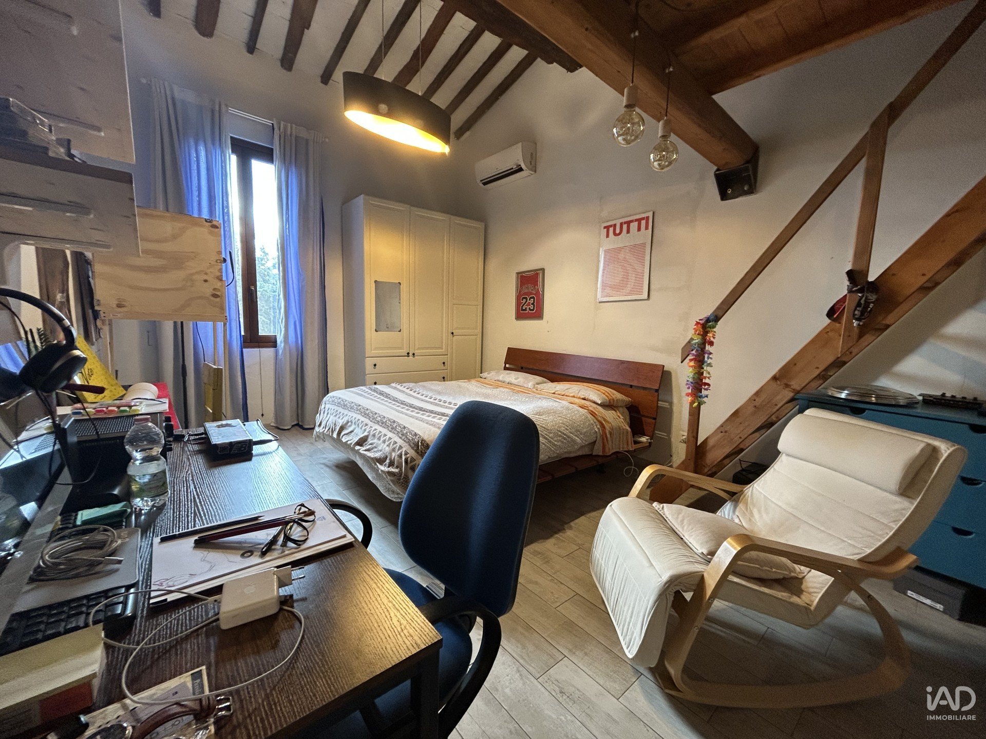 La zona notte si sviluppa al piano superiore, con 2 grandi camere da letto (di cui una con soppalco in legno di arredamento e una con cabina armadio), servizio finestrato oltre a una zona studio/terza cameretta separata.