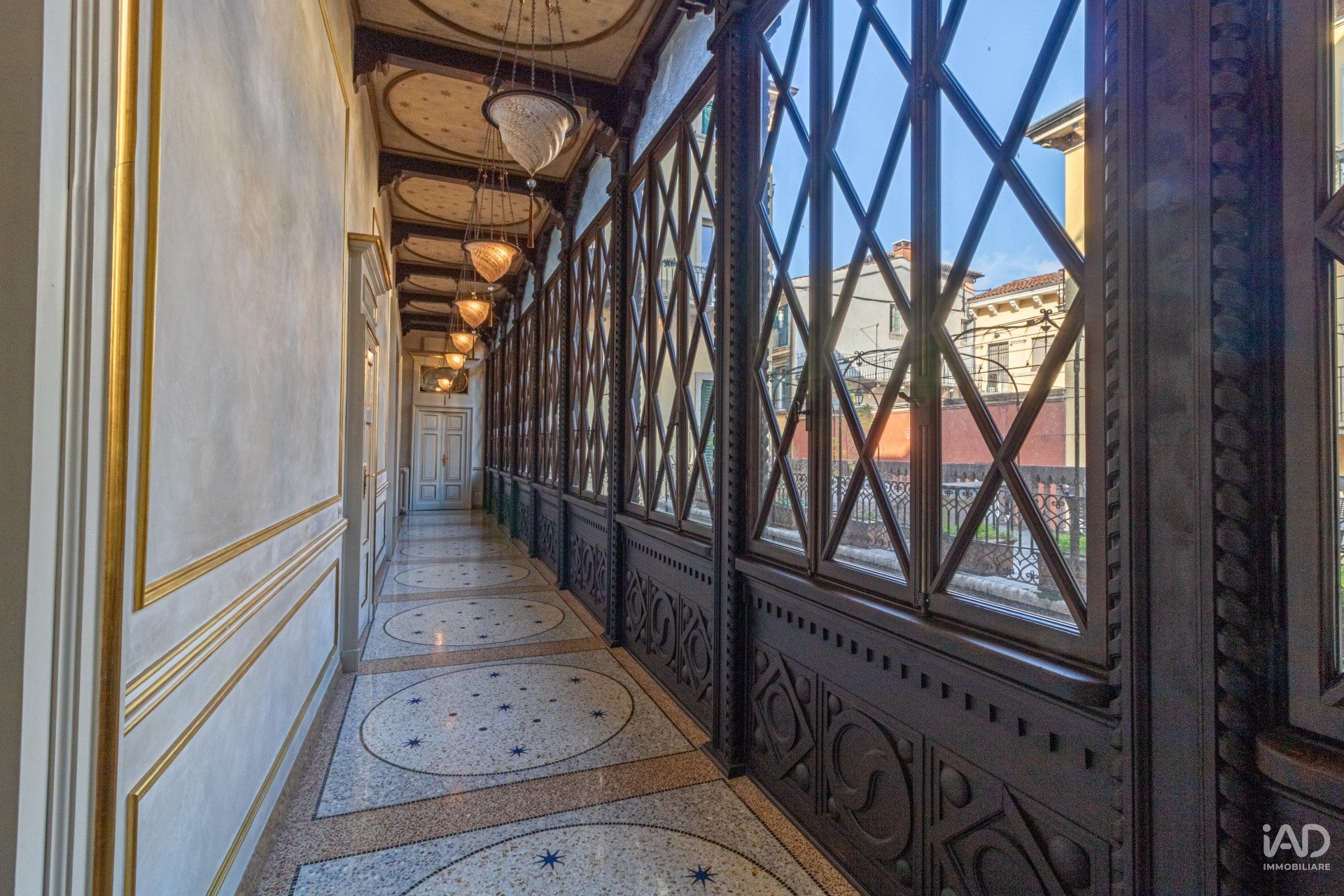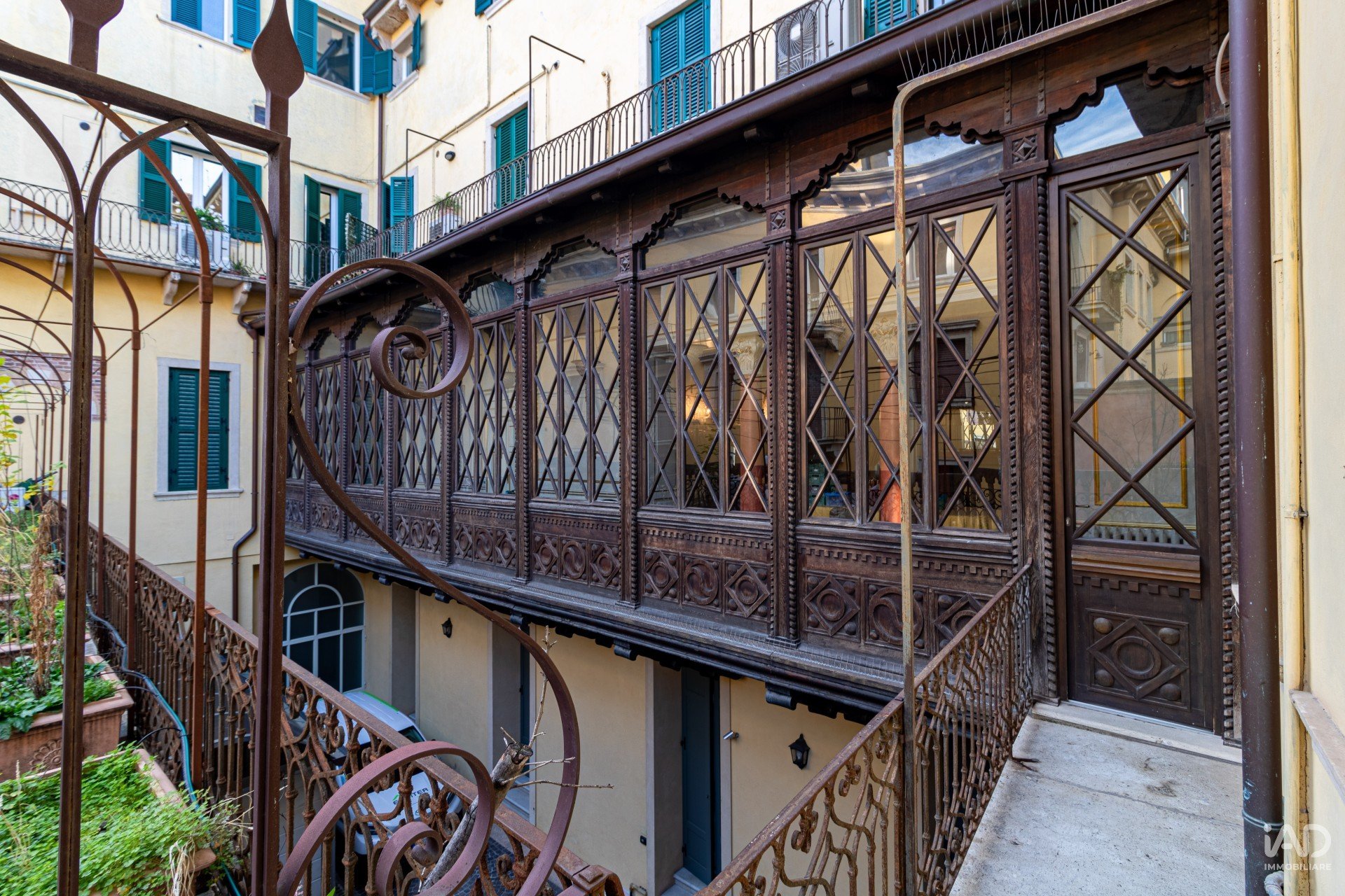Da qui si accede a un suggestivo corridoio–veranda, che affaccia su una silenziosa corte interna, arricchito da un’importante struttura lignea finemente restaurata, un raro esempio di architettura storica valorizzata con sensibilità moderna.
