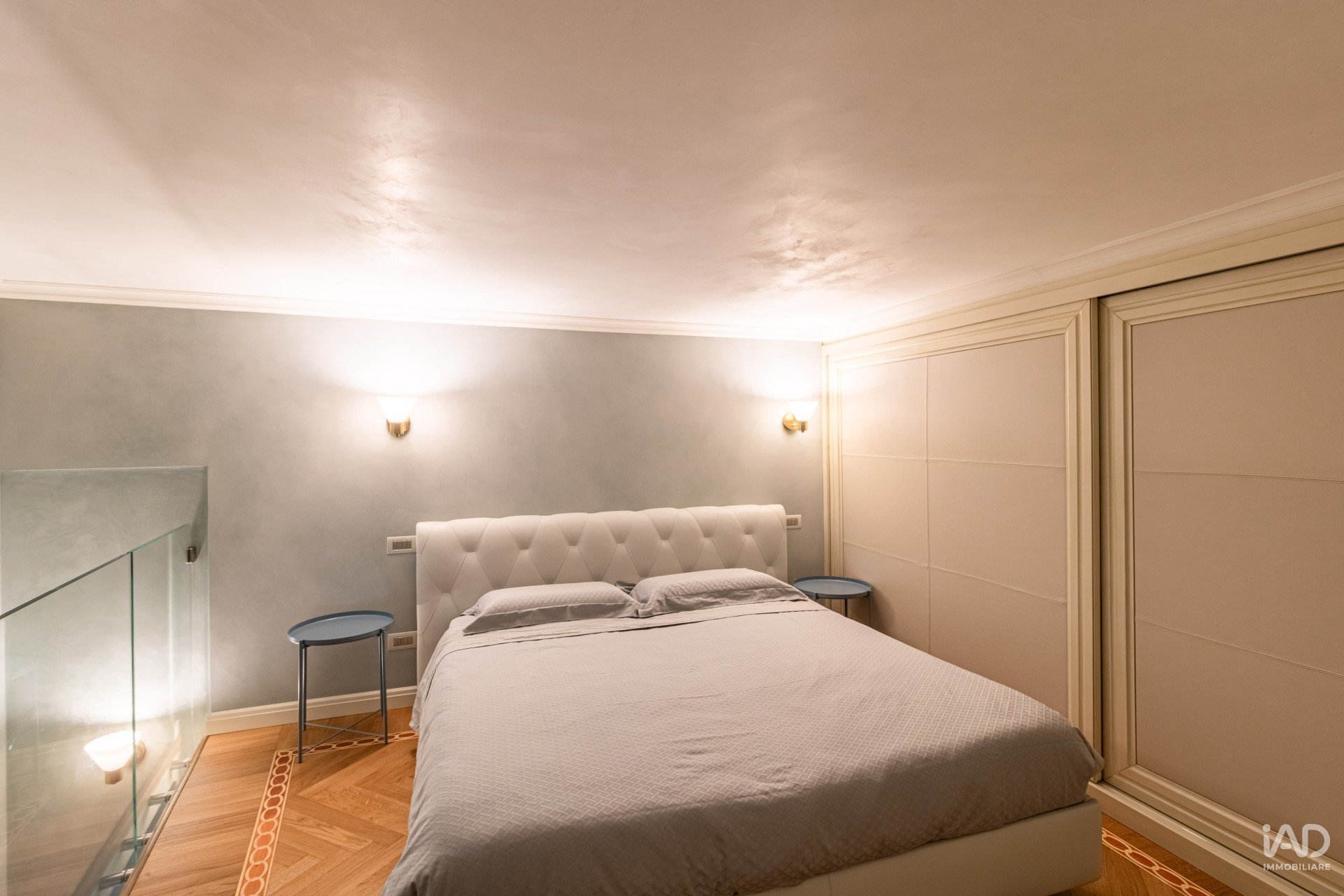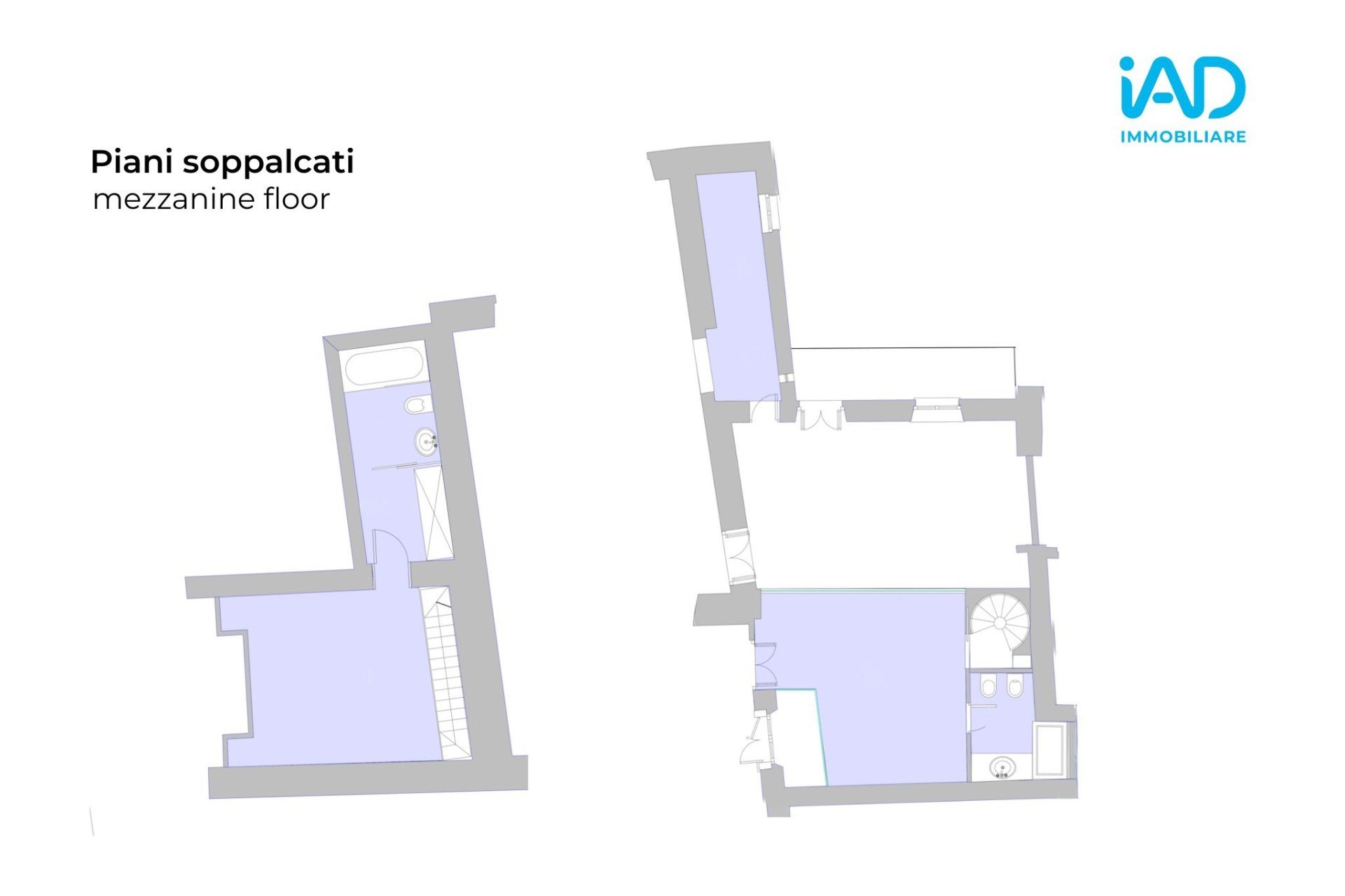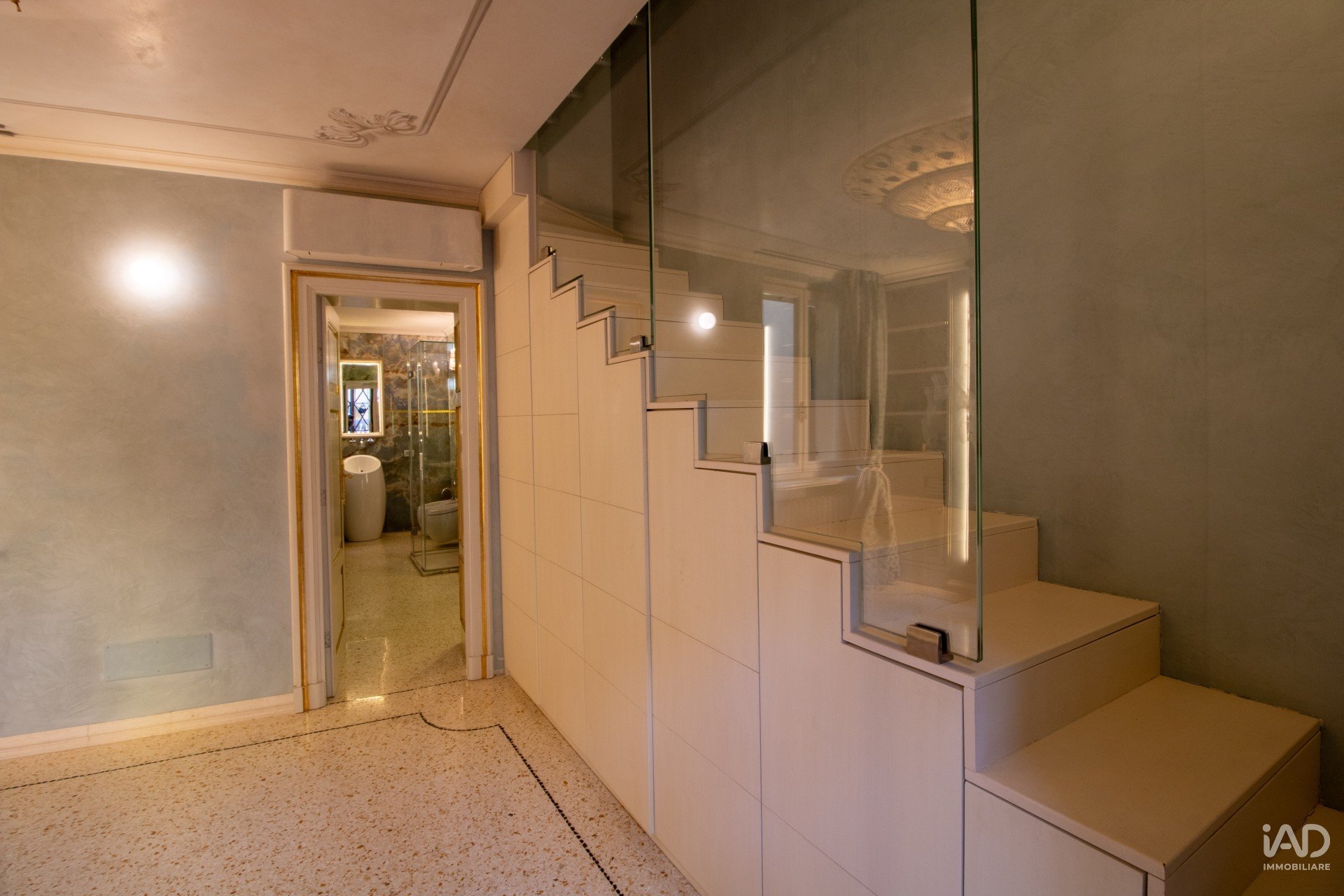 Un disimpegno introduce un’area più intima, oggi adibita a salotto TV, dove una scala elicoidale conduce a un soppalco riservato con camera, ampie armadiature su misura e bagno privato.