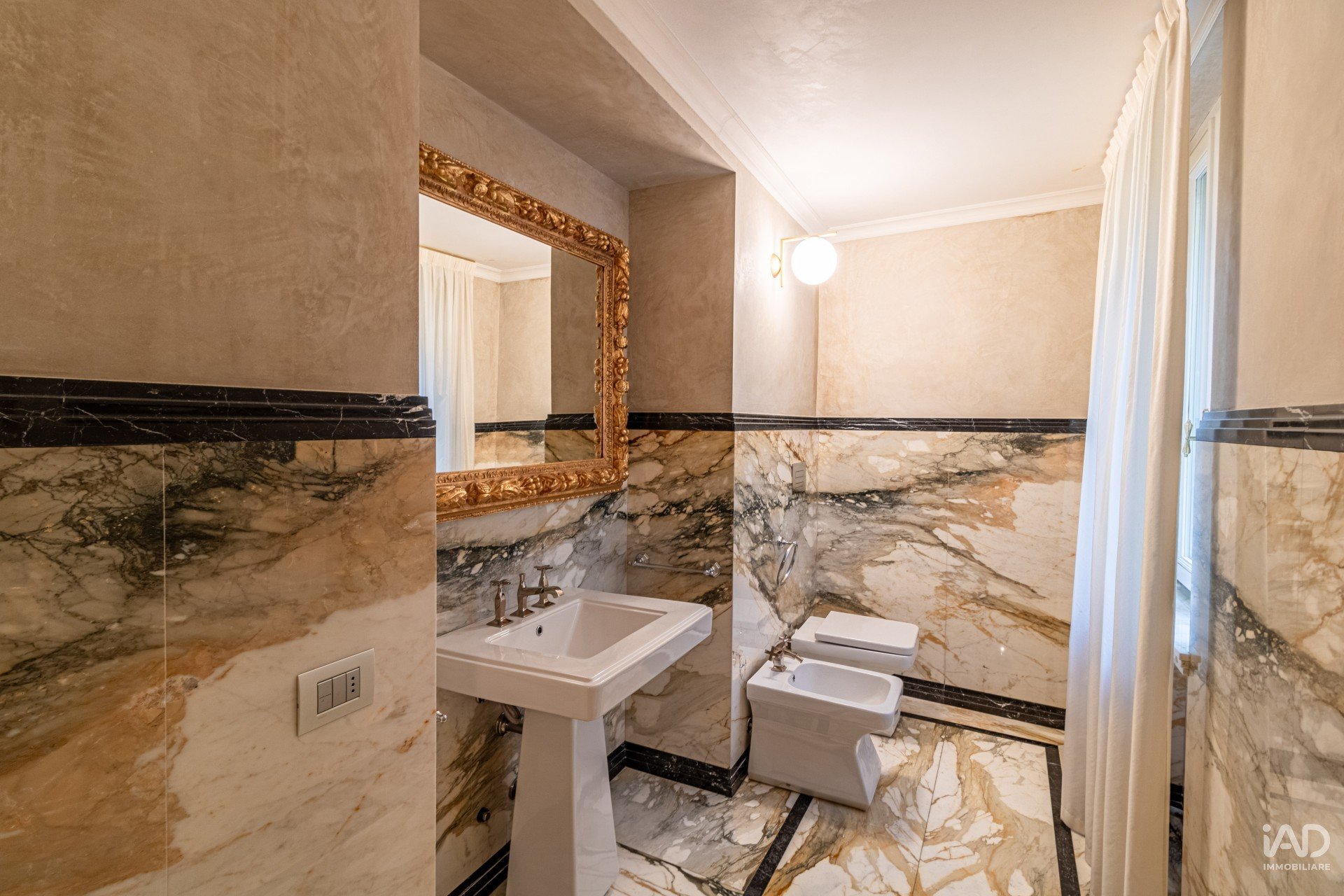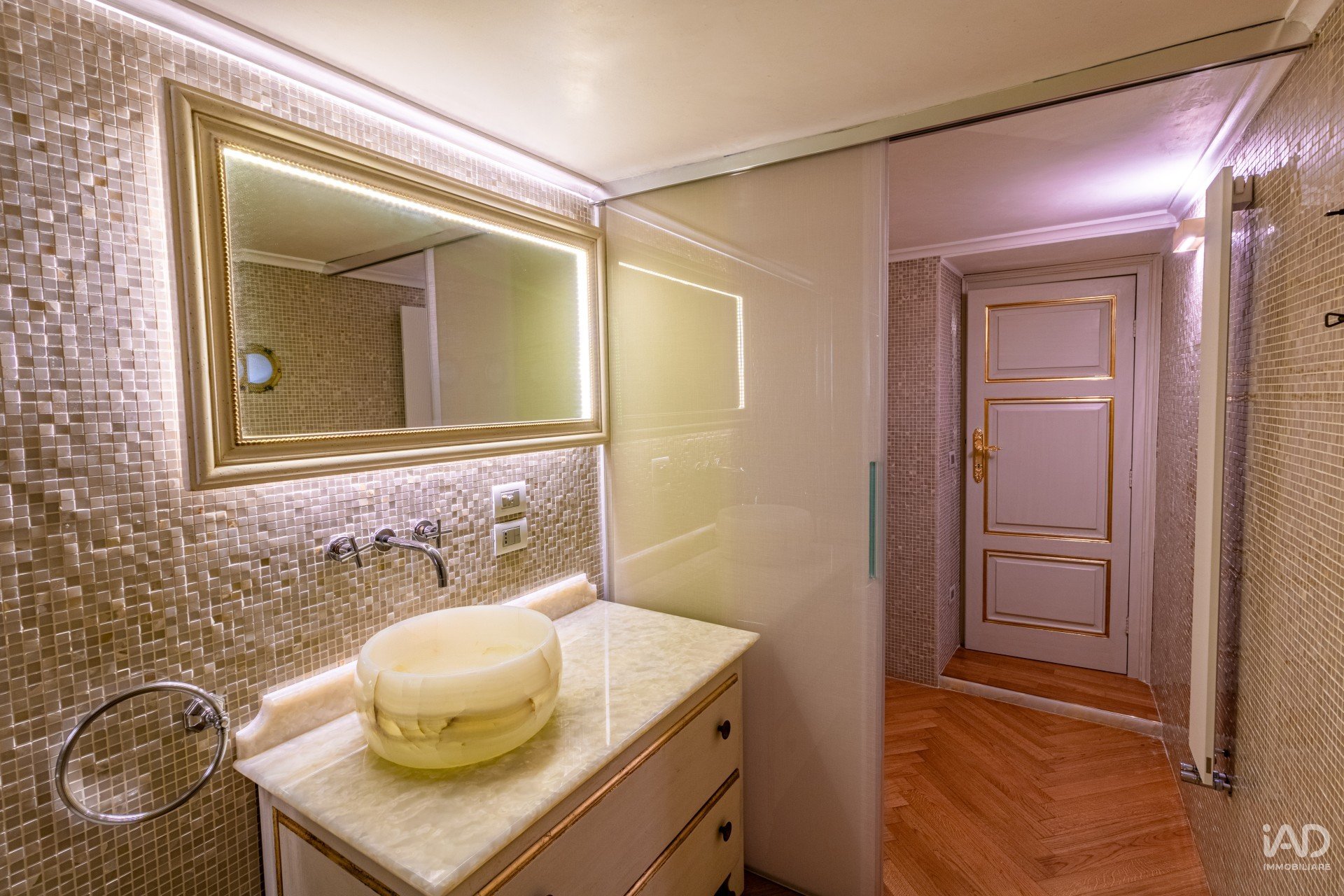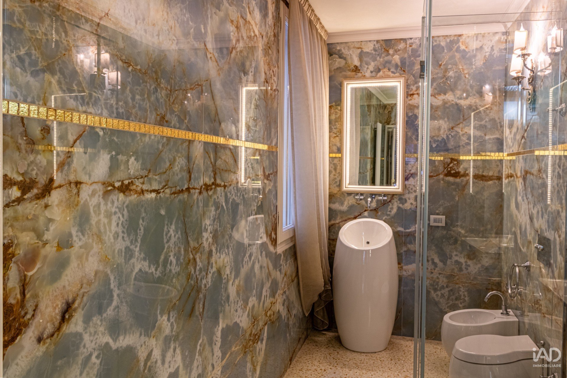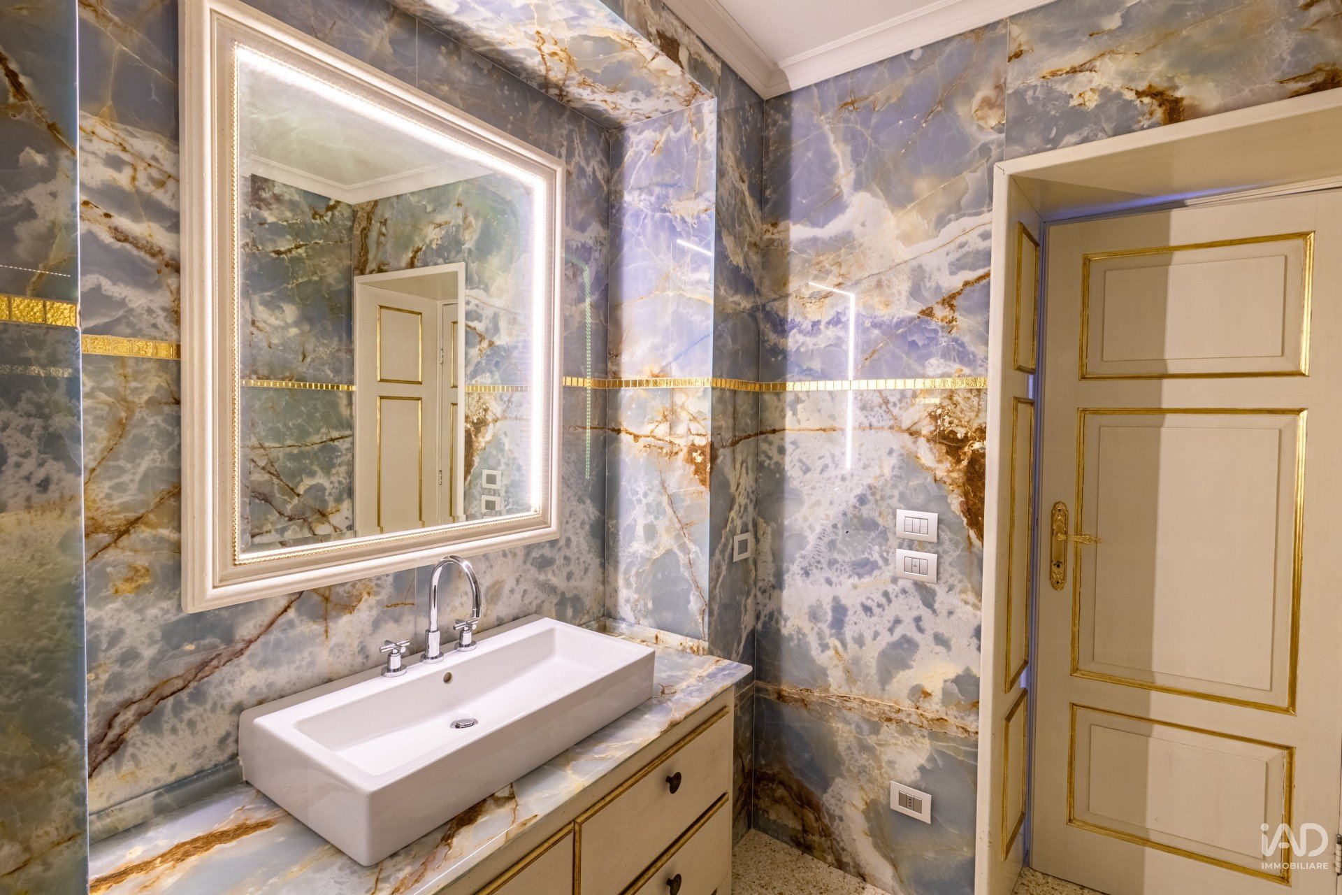 La cucina si completa con un’area pranzo e un bagno di servizio in marmo naturale, caratterizzato da superfici venate e dettagli dorati.