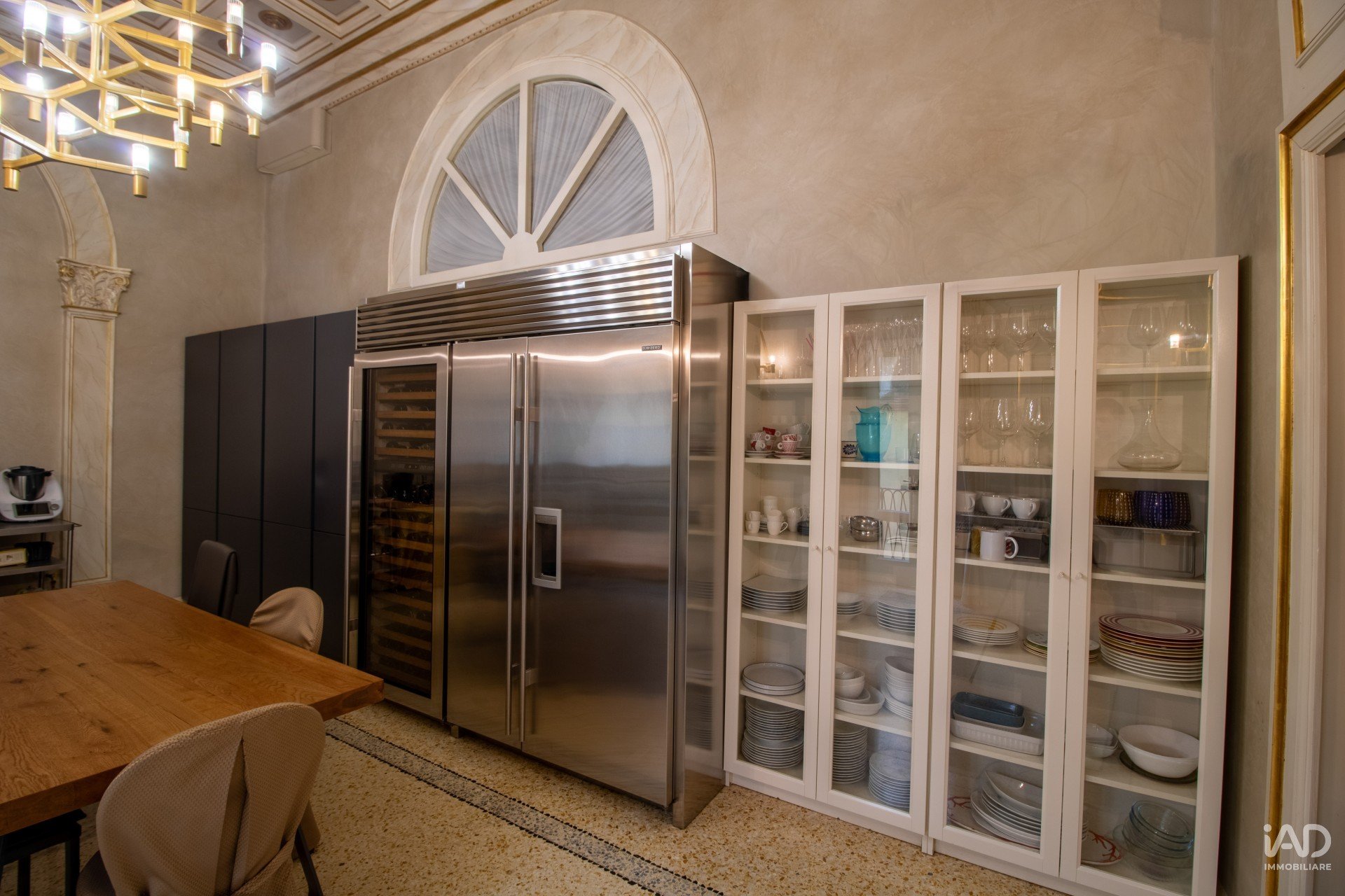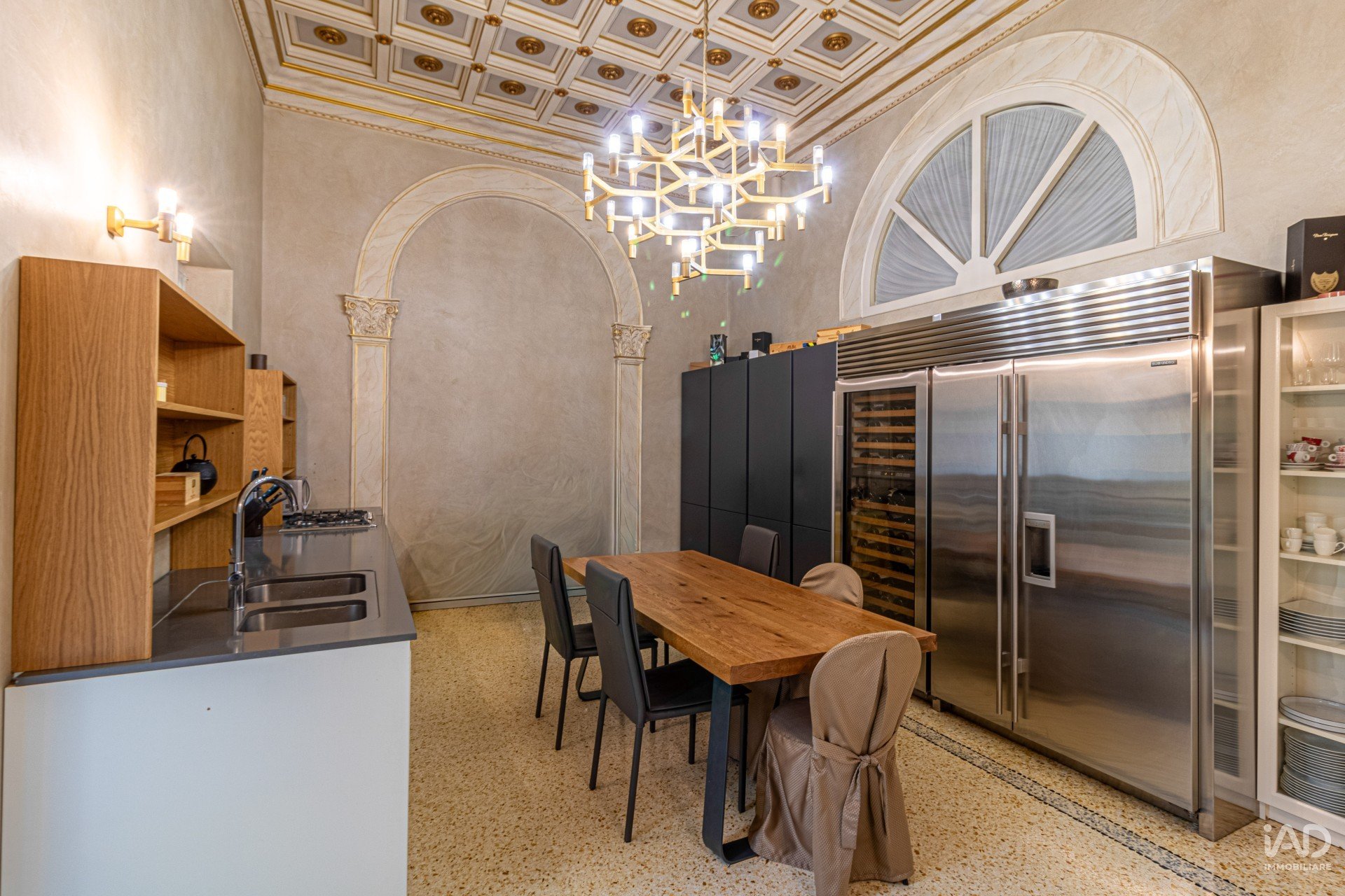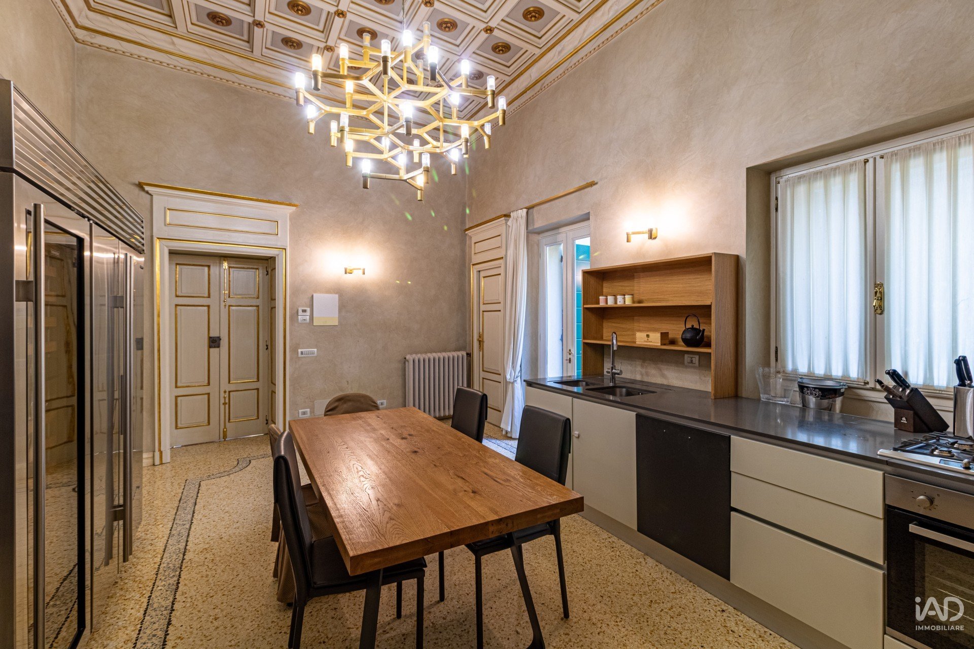 Dal salone si accede a una cucina di design con balcone, luminosa e funzionale, impreziosita da un magnifico soffitto a cassettoni bianchi e oro e da un lampadario geometrico in ottone e vetro che fonde arte e modernità.