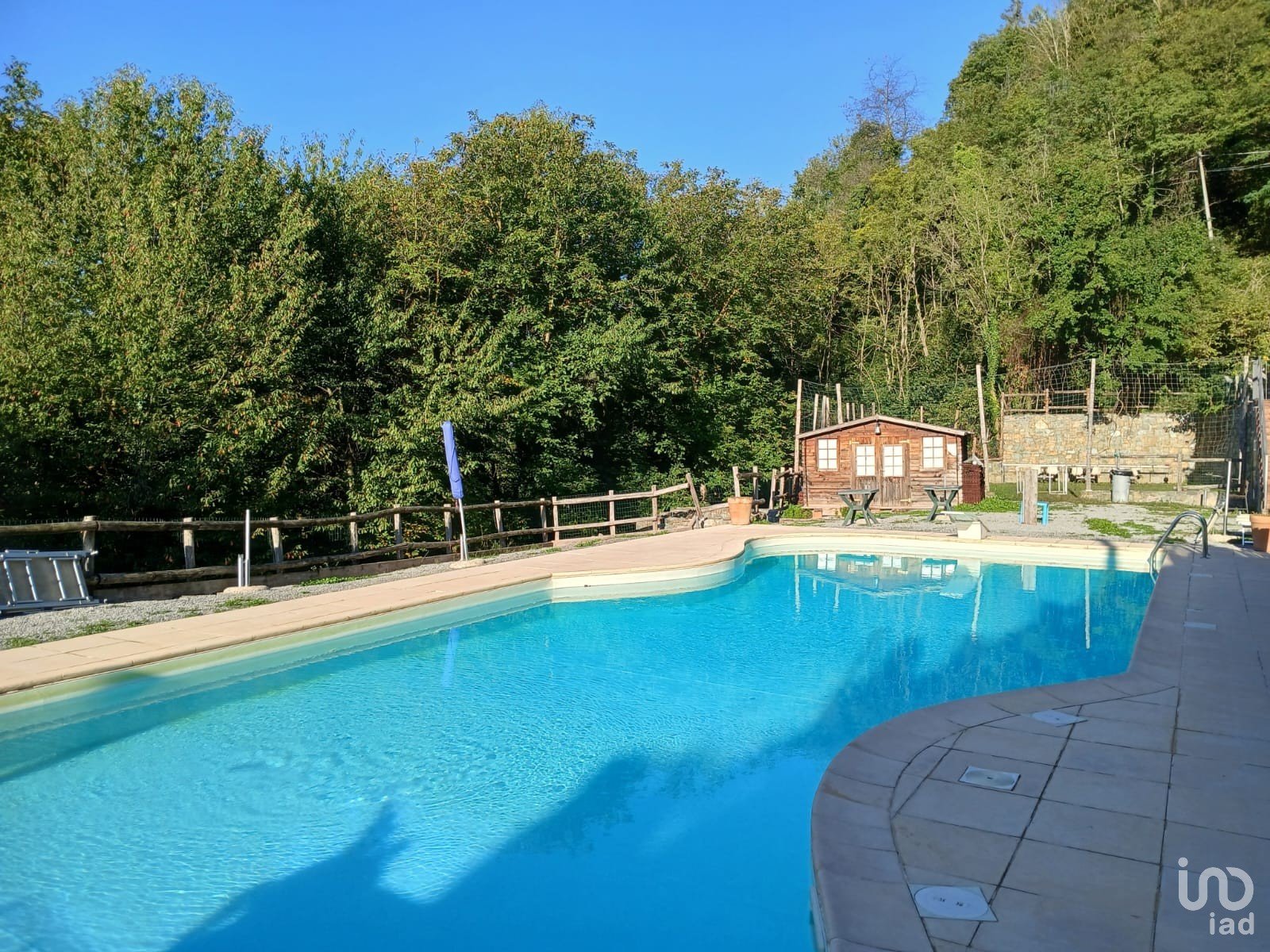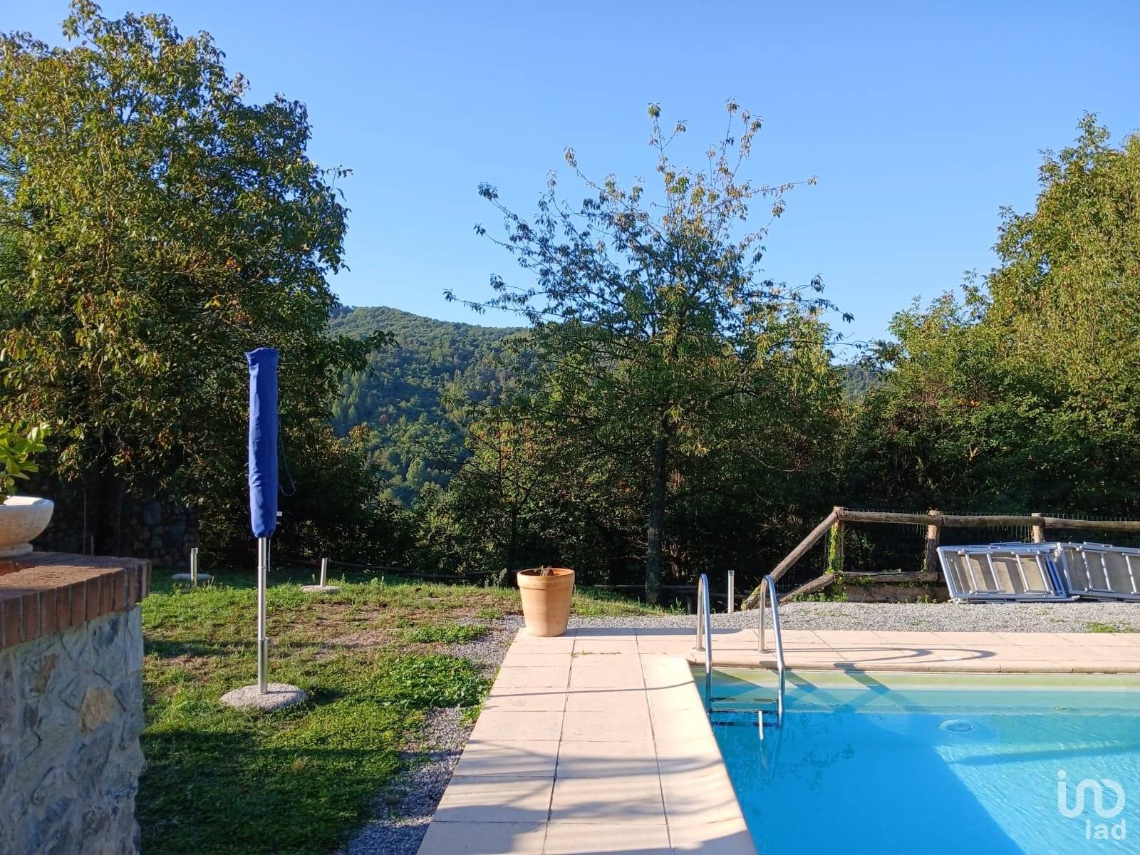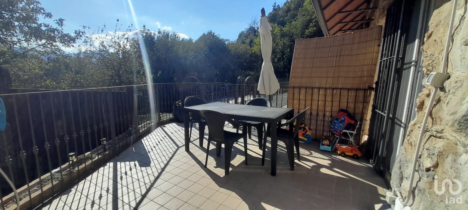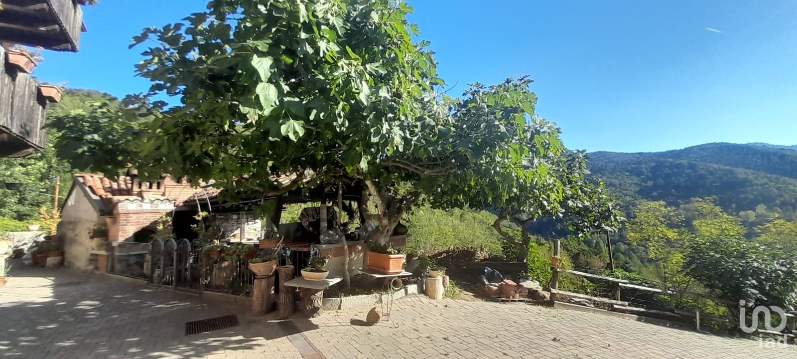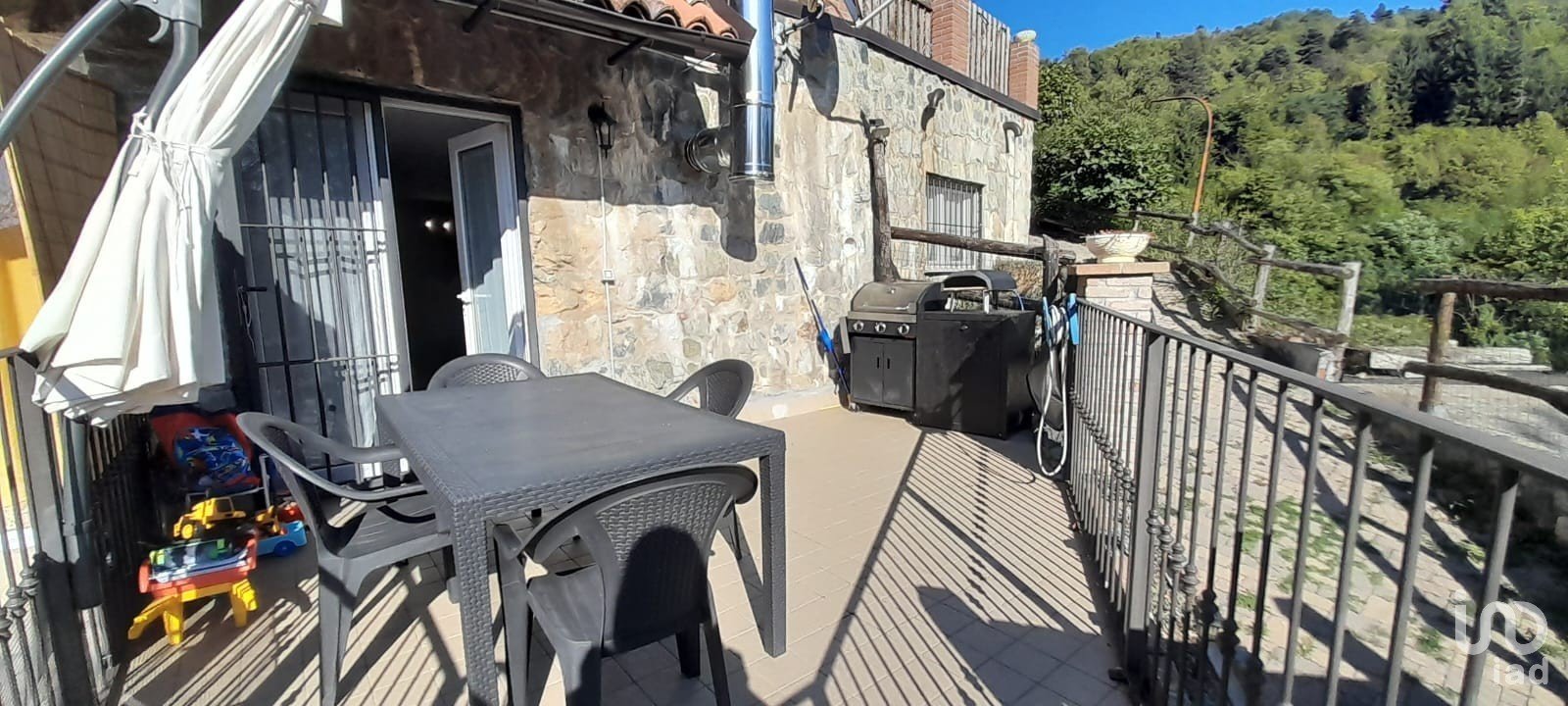 A spacious and versatile entrance, also usable as a guest room with a foldaway bed, leads to a bright living room with kitchenette and scenic wood-burning fireplace, positioned beside the French door with a spectacular view of the greenery. The door opens onto a terrace equipped with a barbecue, mini pizza oven, and furnishings for your starry dinners.