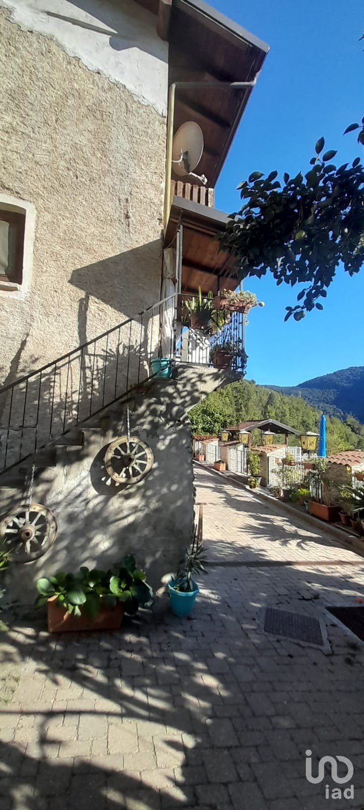 Wrought iron lanterns line the path, casting a warm glow on summer evenings. Vintage objects, wooden barrels, old pulleys, and farming tools decorate the corners, evoking memories of an authentic past.