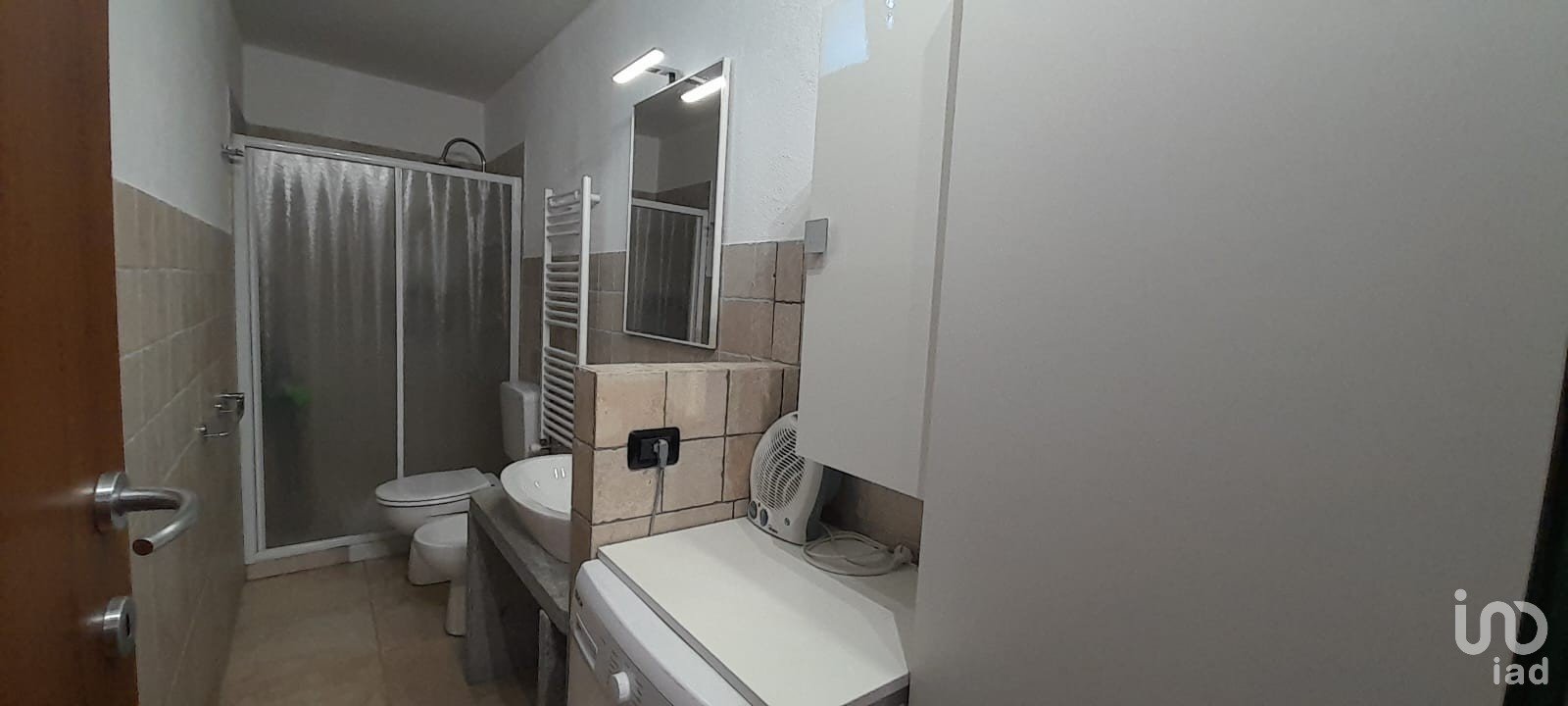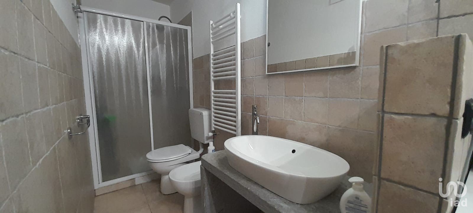 The bathroom, convenient to the guest room, features a shower and suspended sanitary ware.