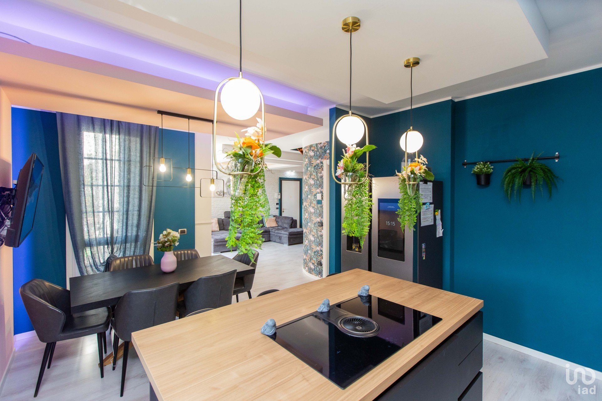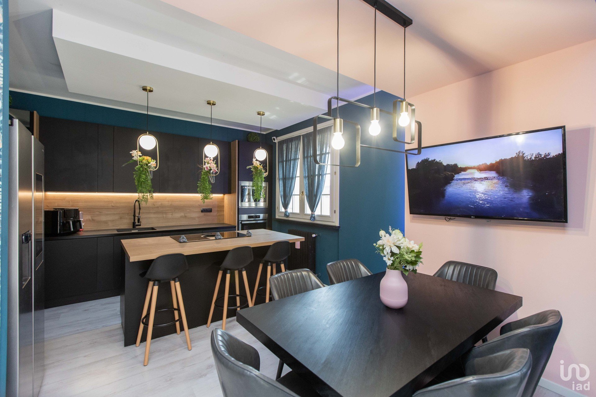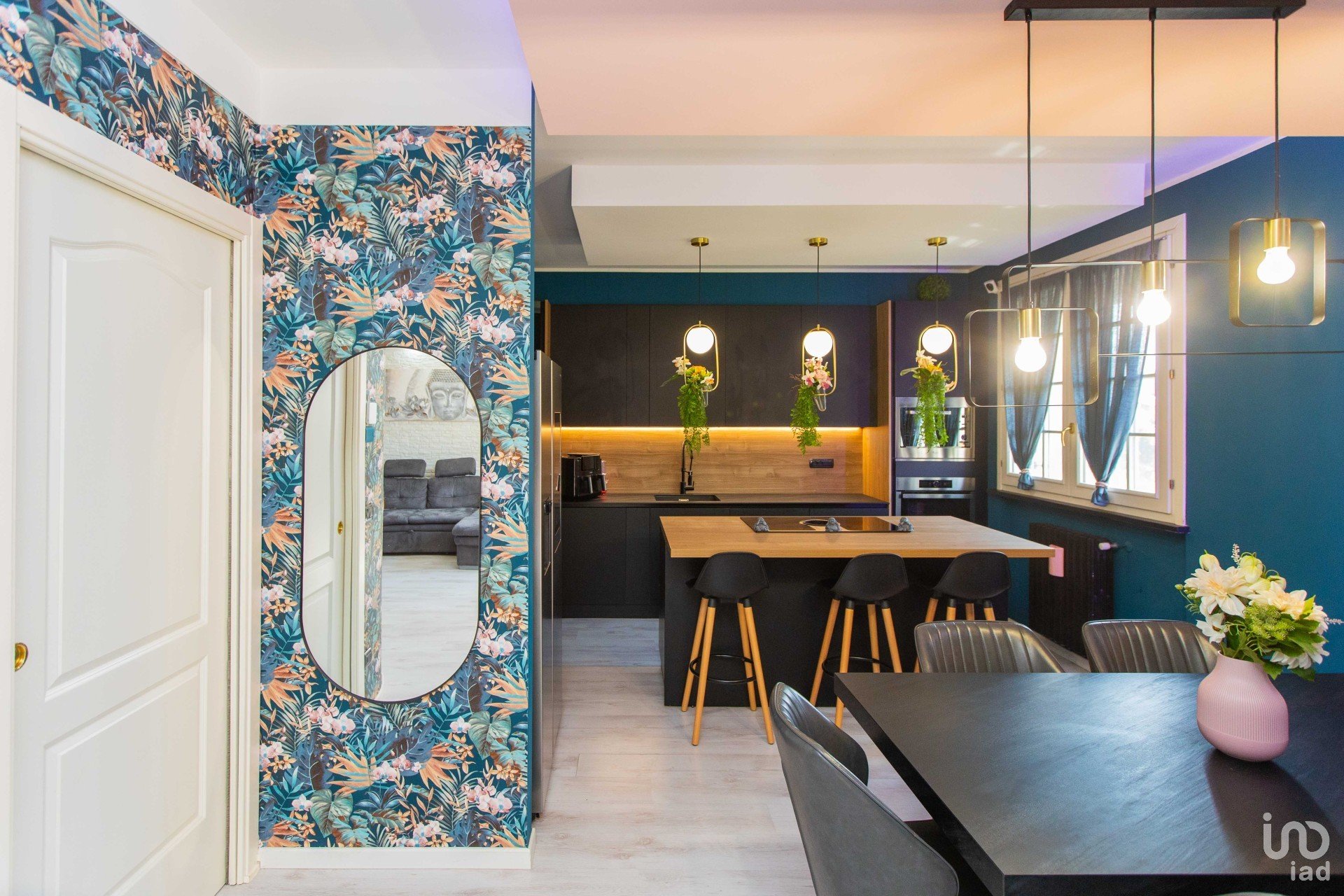 La cucina con penisola — in sofisticato nero opaco — si fonde armoniosamente con il tavolo da pranzo coordinato e con le pareti color petrolio, creando un contrasto di grande impatto, dove il verde delle piante (finemente selezionate) emerge con forza e stile. Un angolo ideale per chi ama ricevere, cucinare, vivere.