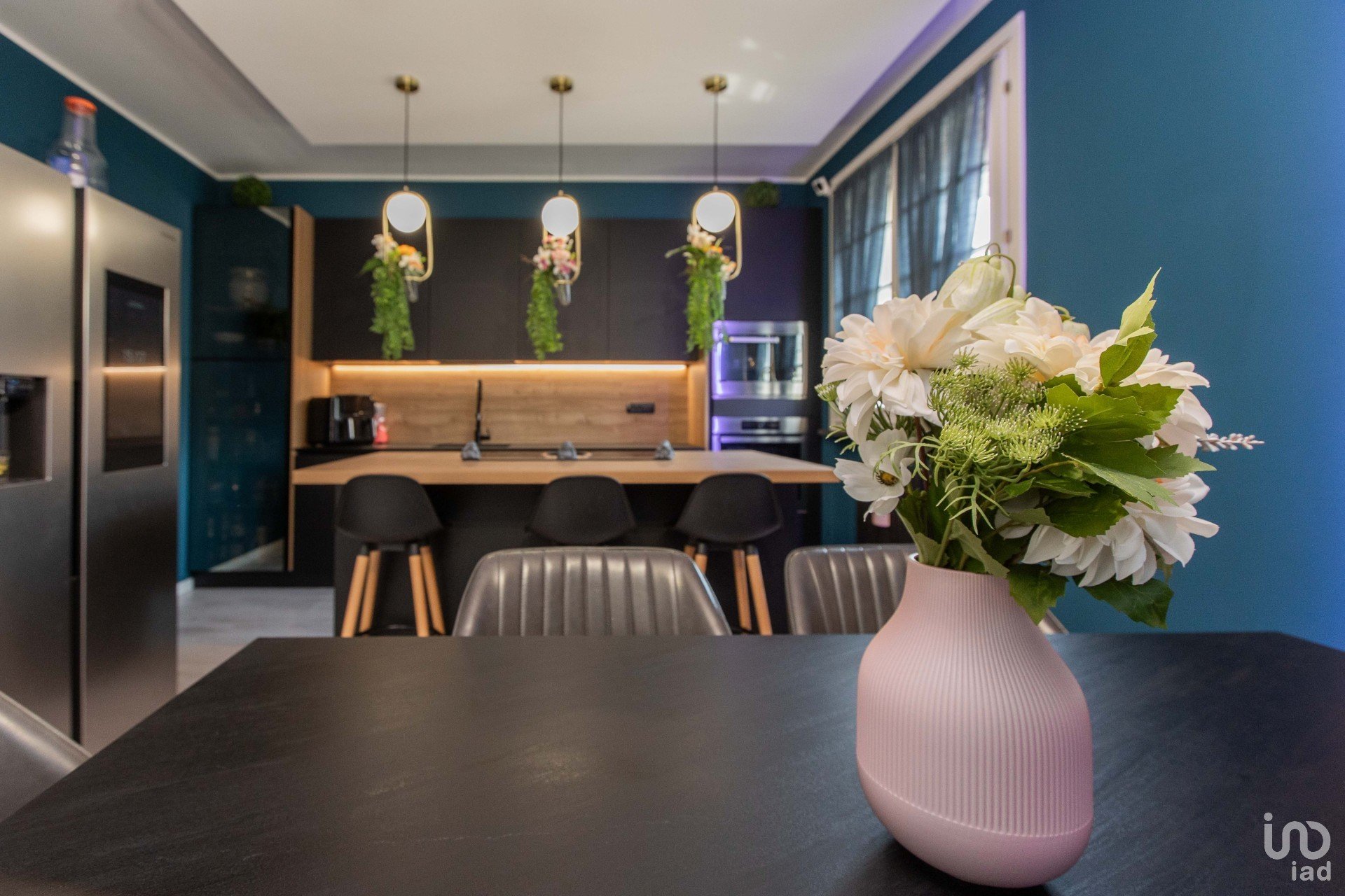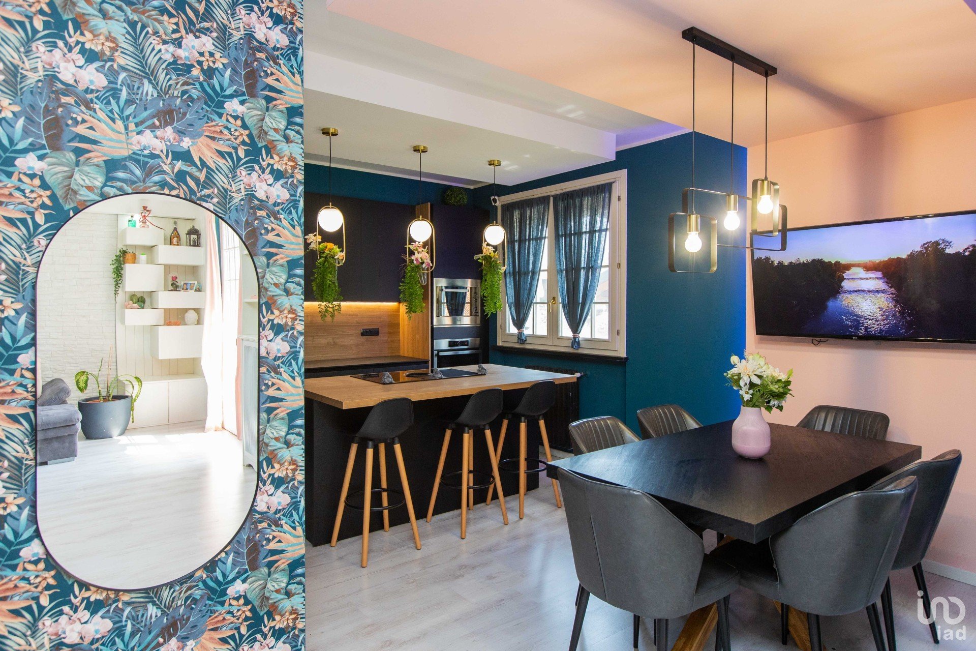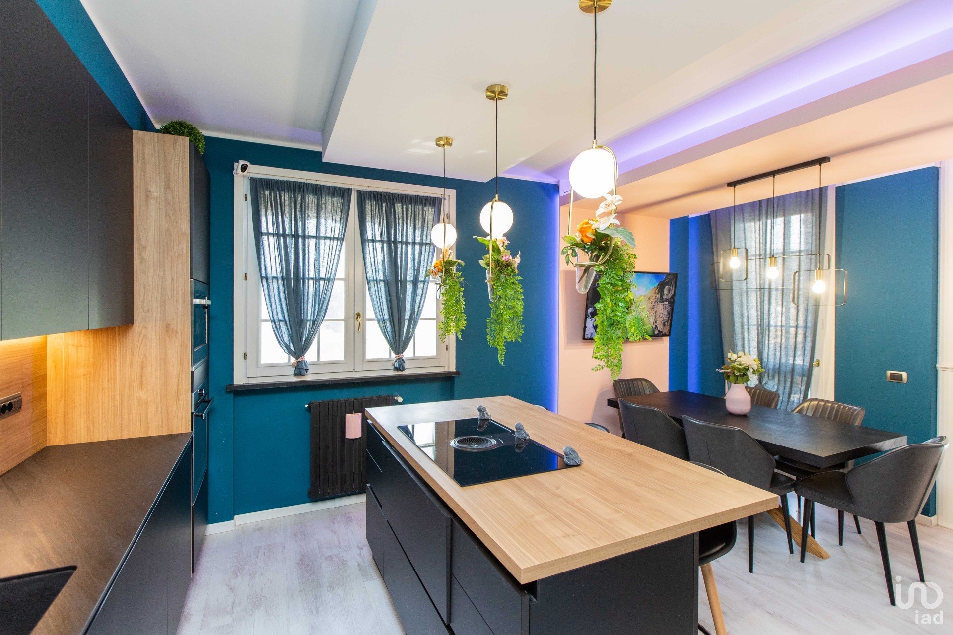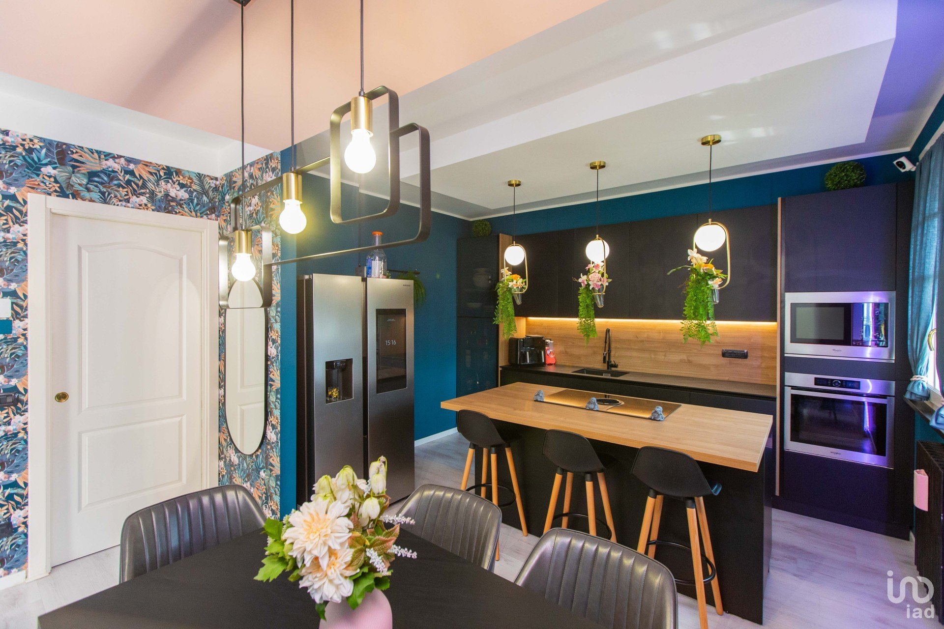 La cucina con penisola — in sofisticato nero opaco — si fonde armoniosamente con il tavolo da pranzo coordinato e con le pareti color petrolio, creando un contrasto di grande impatto, dove il verde delle piante (finemente selezionate) emerge con forza e stile. Un angolo ideale per chi ama ricevere, cucinare, vivere.
