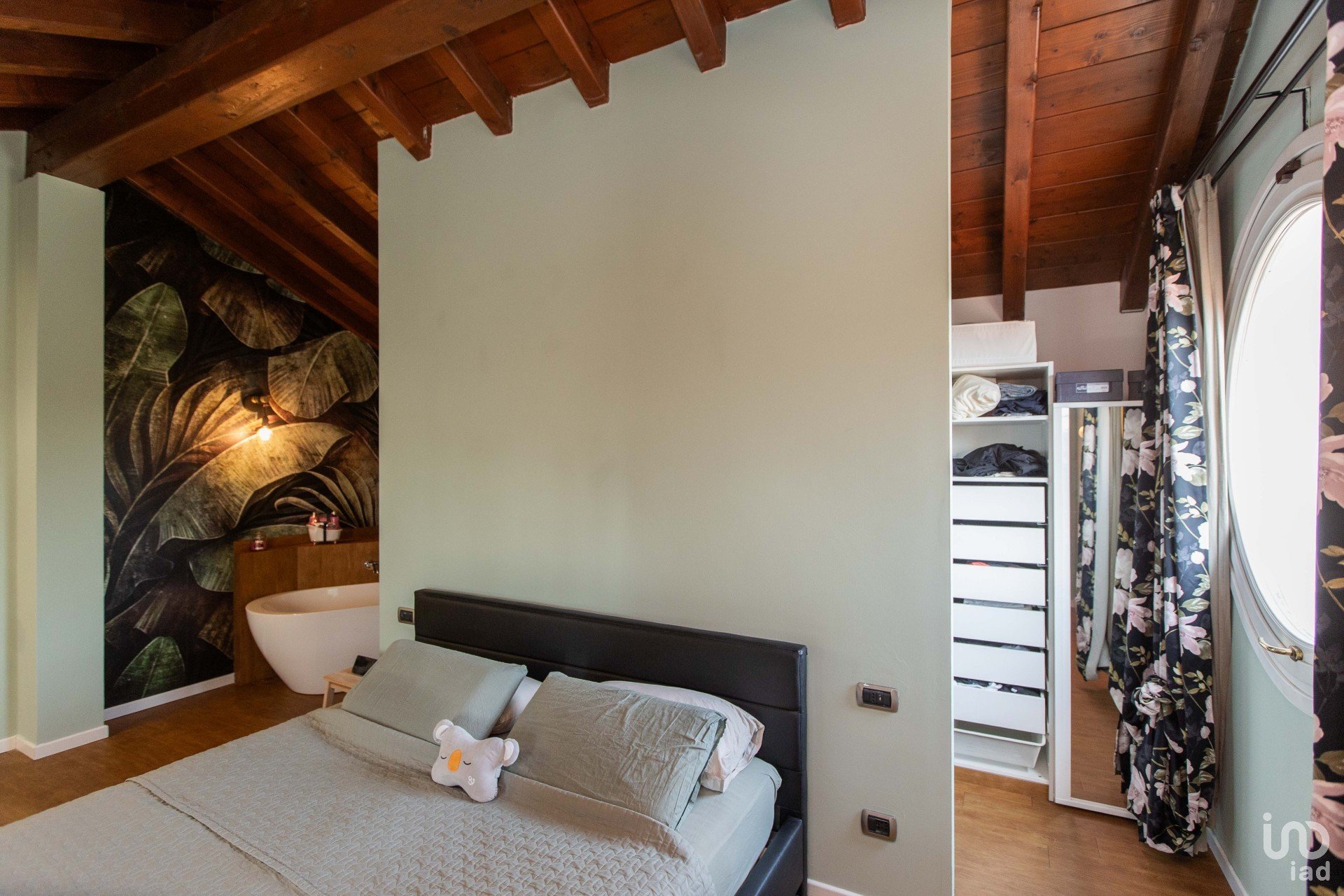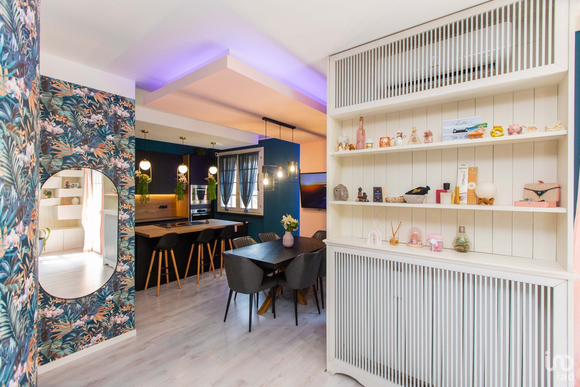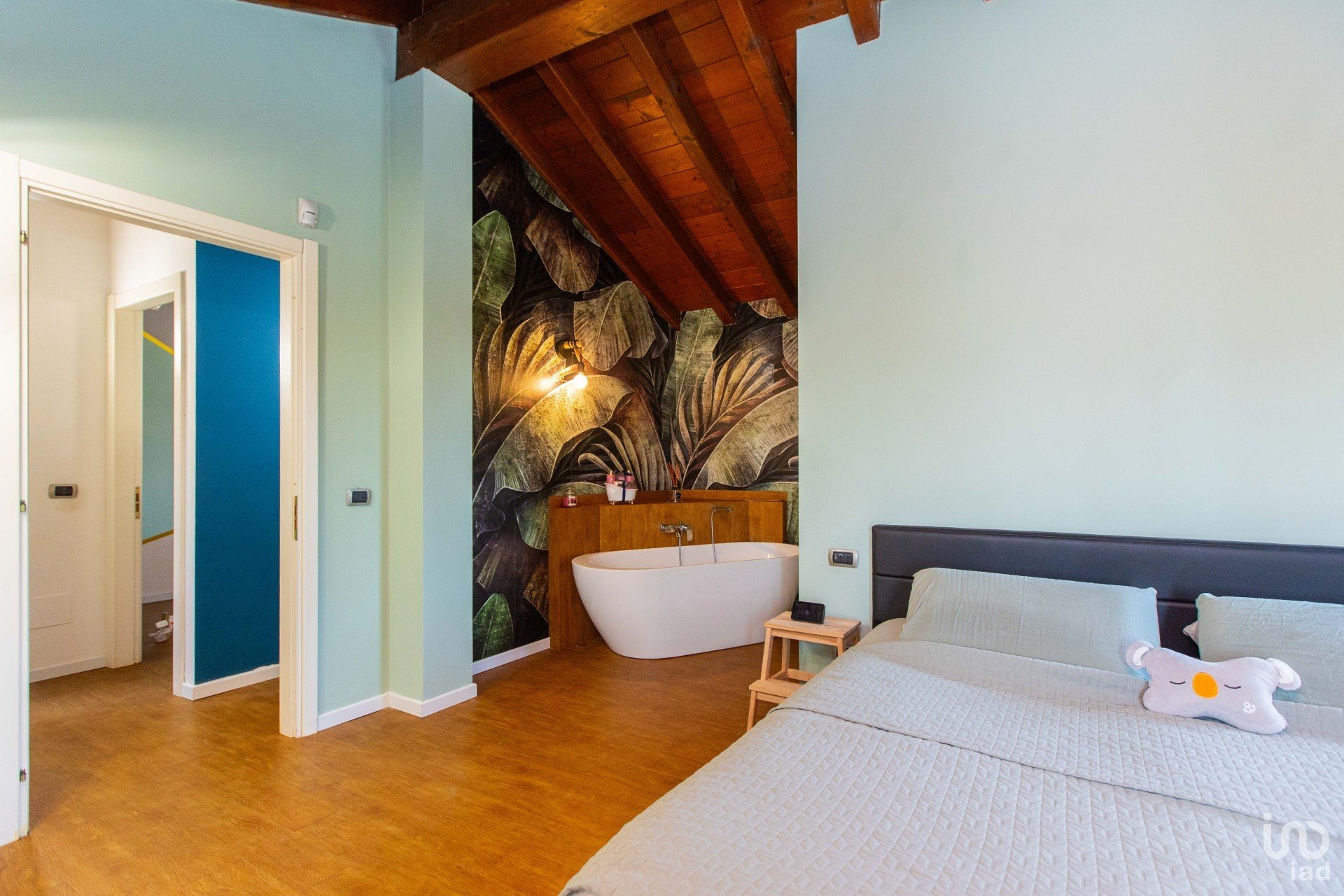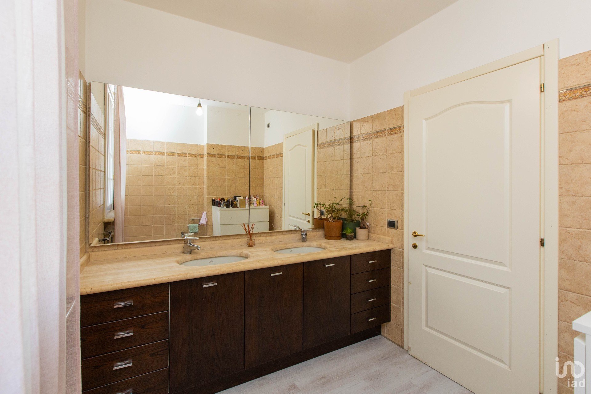 All’ingresso si viene accolti da un’ampia zona living scenografica, impreziosita da un pavimento effetto legno caldo e contemporaneo, avvolta da carte da parati artistiche e da una presenza diffusa di piante verdi, che donano carattere e vitalità all’ambiente.