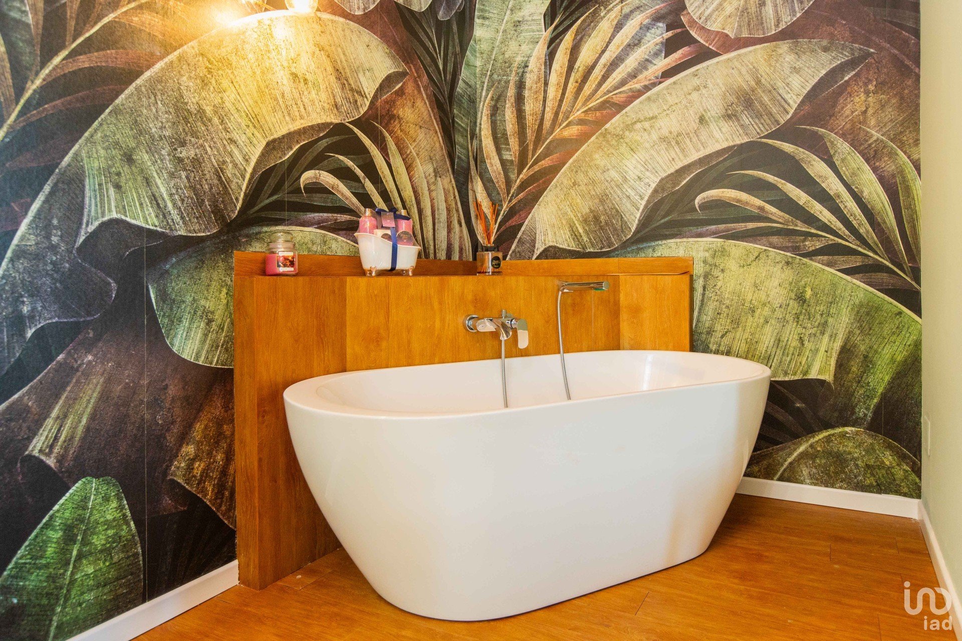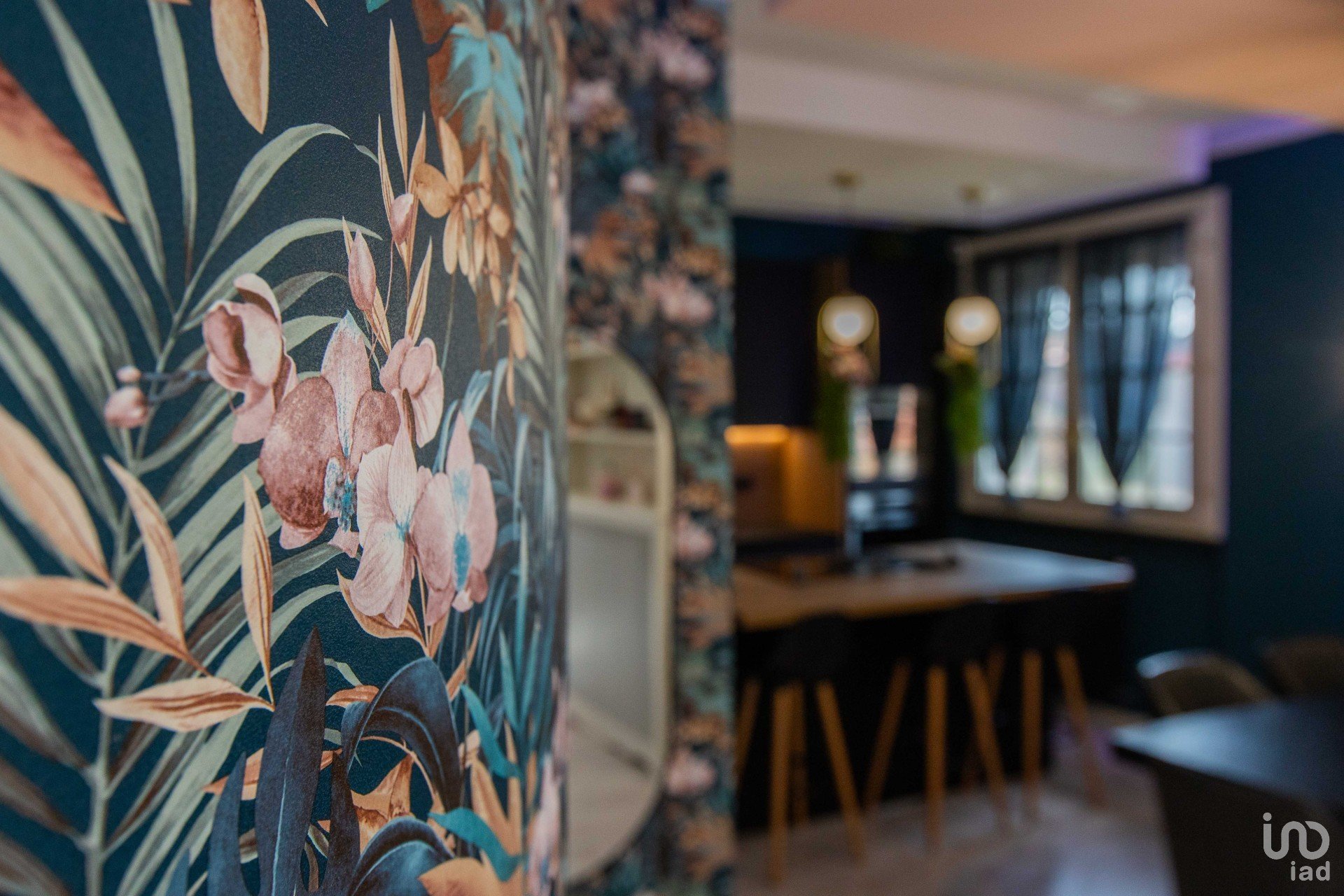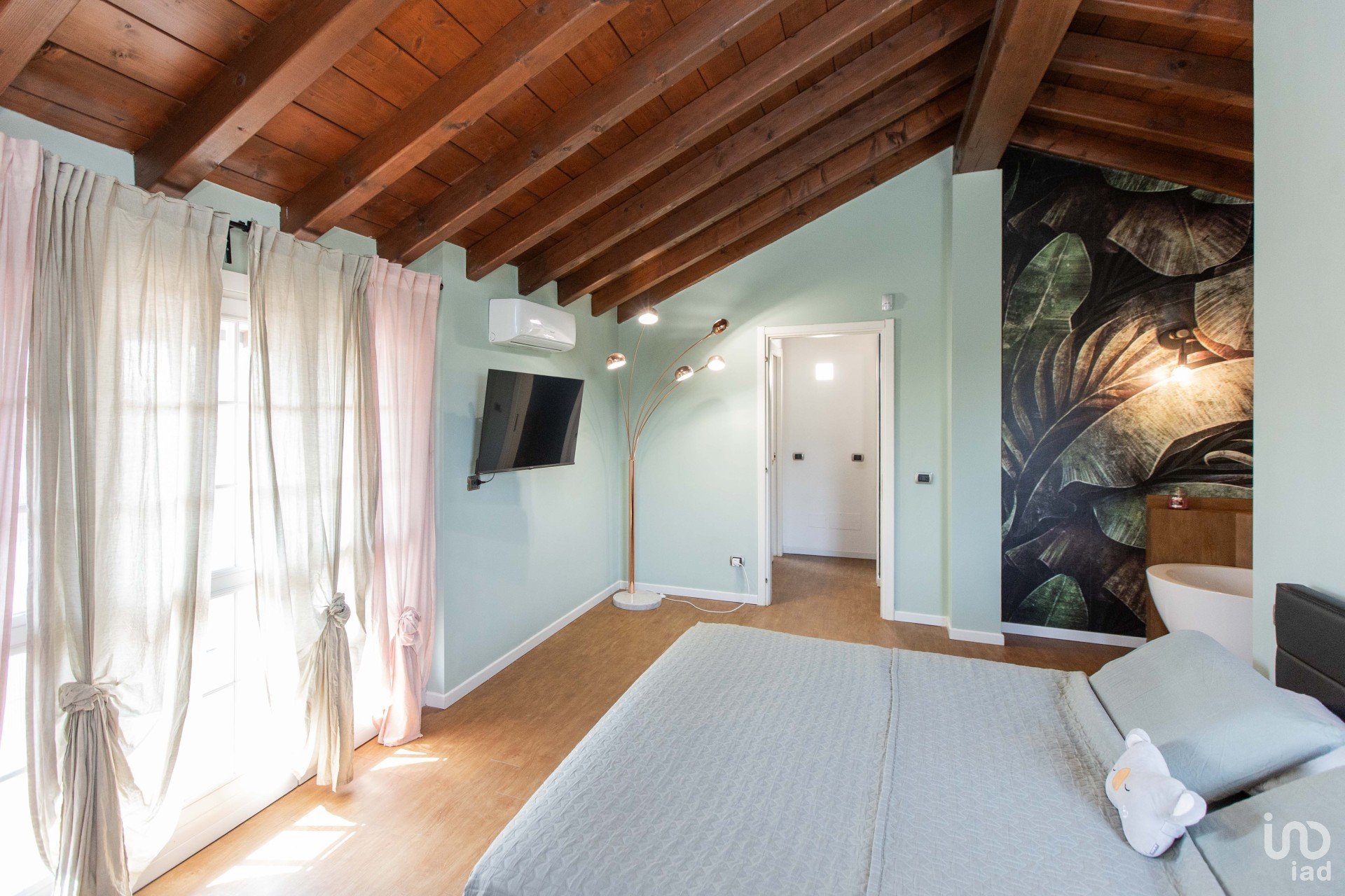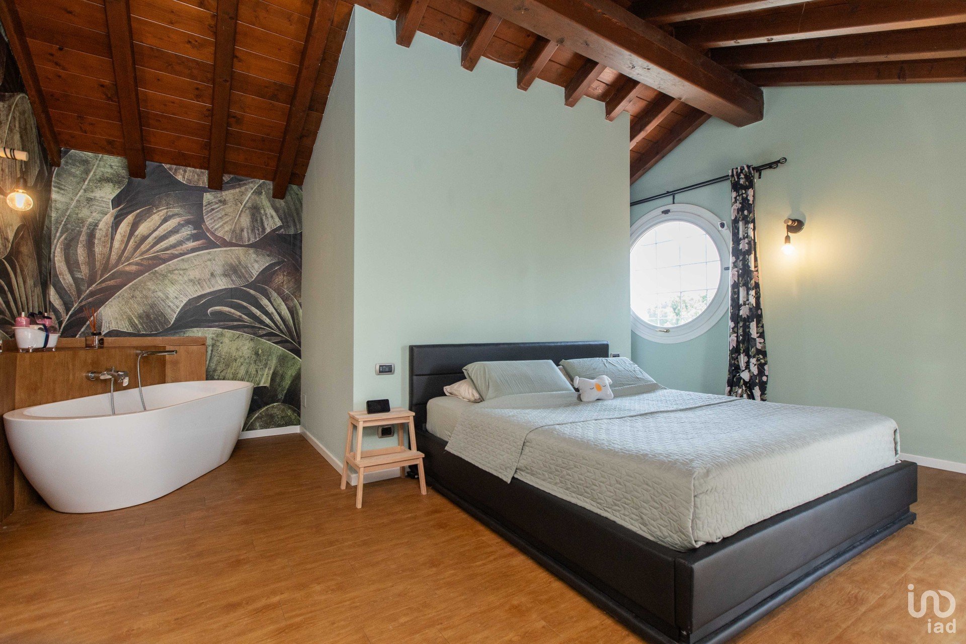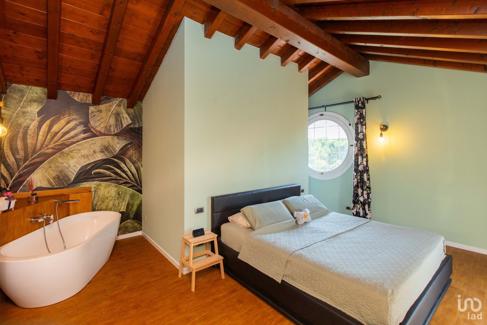 All’ingresso si viene accolti da un’ampia zona living scenografica, impreziosita da un pavimento effetto legno caldo e contemporaneo, avvolta da carte da parati artistiche e da una presenza diffusa di piante verdi, che donano carattere e vitalità all’ambiente.