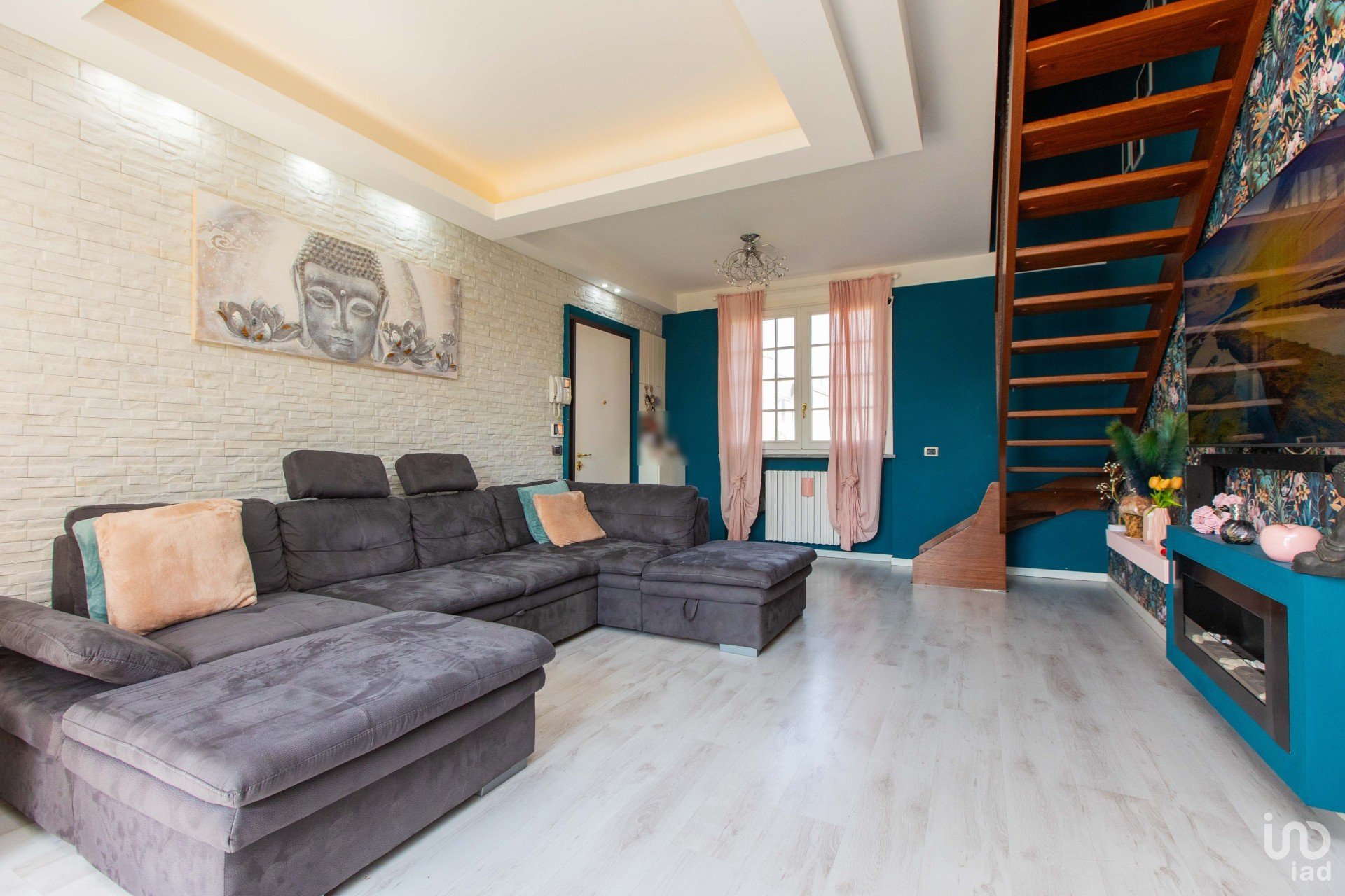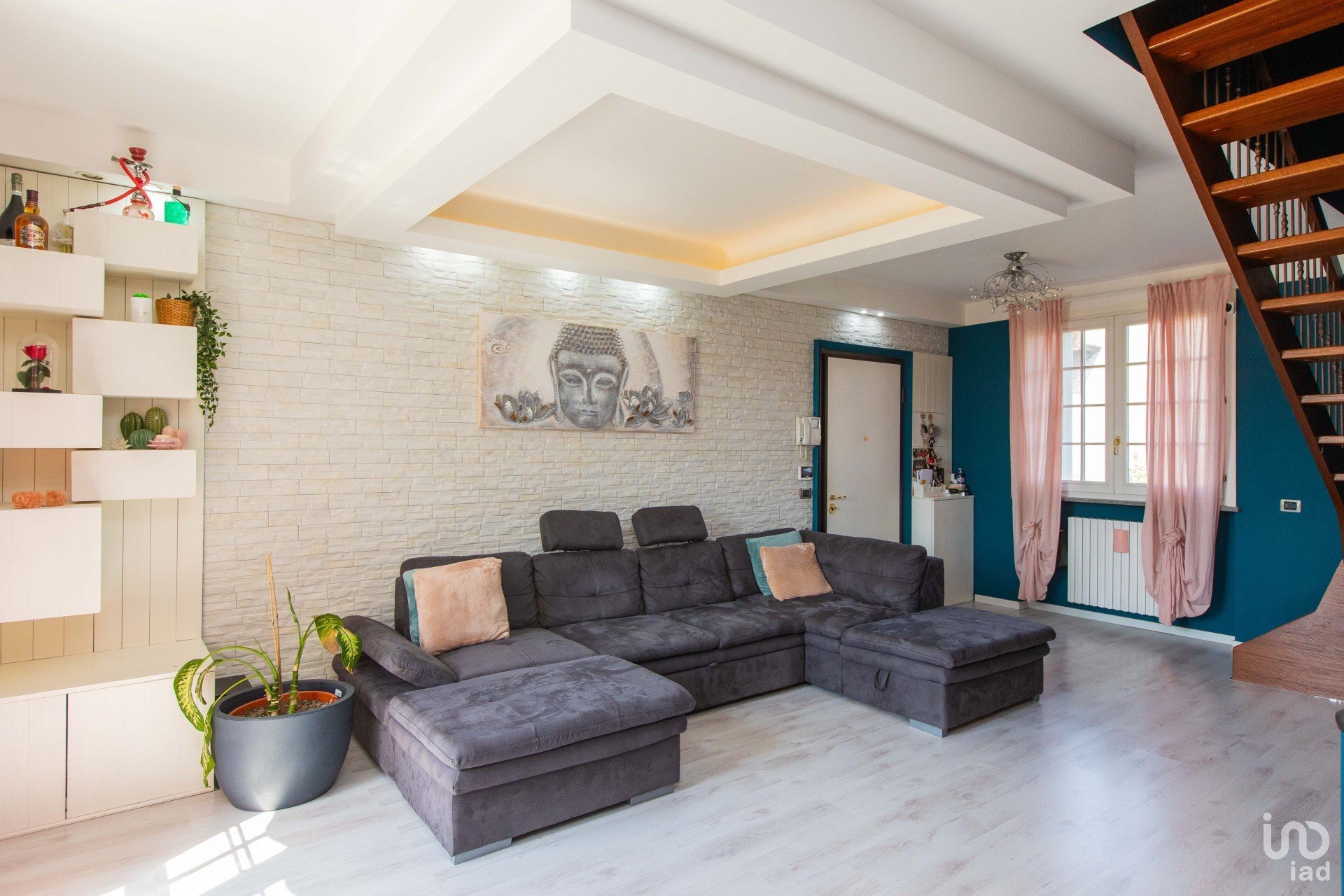 Un elegante Buddha in soggiorno introduce alla grande zona relax, incorniciata da un suggestivo controsoffitto con illuminazione scenografica.