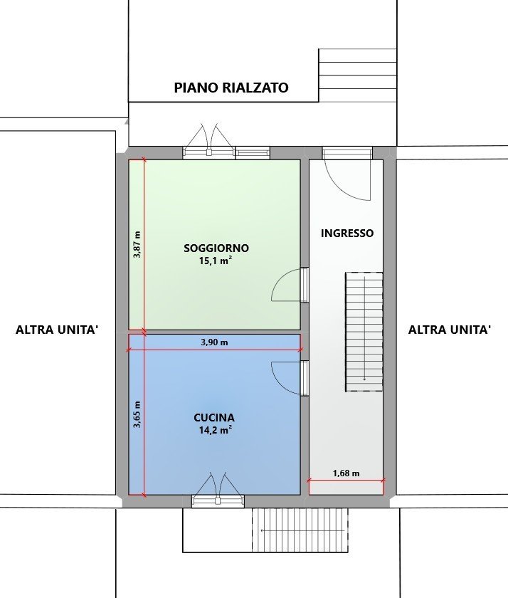 Al piano rialzato si accede alla zona giorno composta da un luminoso soggiorno e una cucina abitabile. Al piano primo troviamo la zona notte con due camere da letto e un bagno finestrato con doccia.