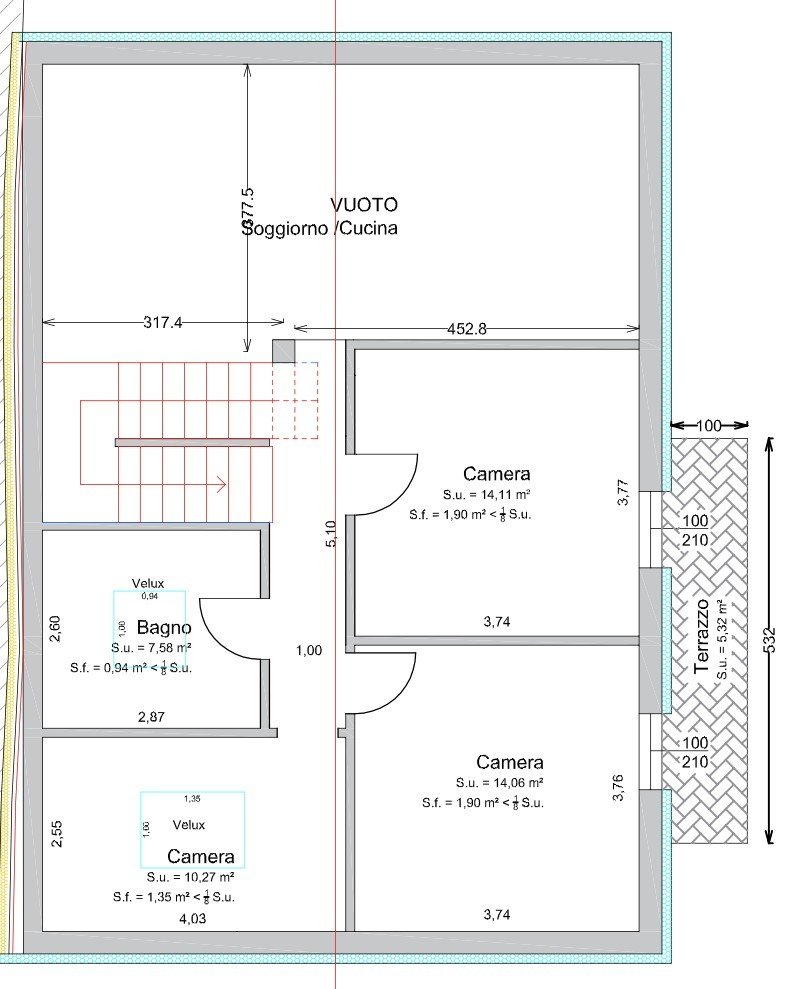 Piano Primo: tre camere da letto, bagno finestrato e suggestiva vista sul soggiorno sottostante, che dona un senso di apertura e luminosità agli ambienti.