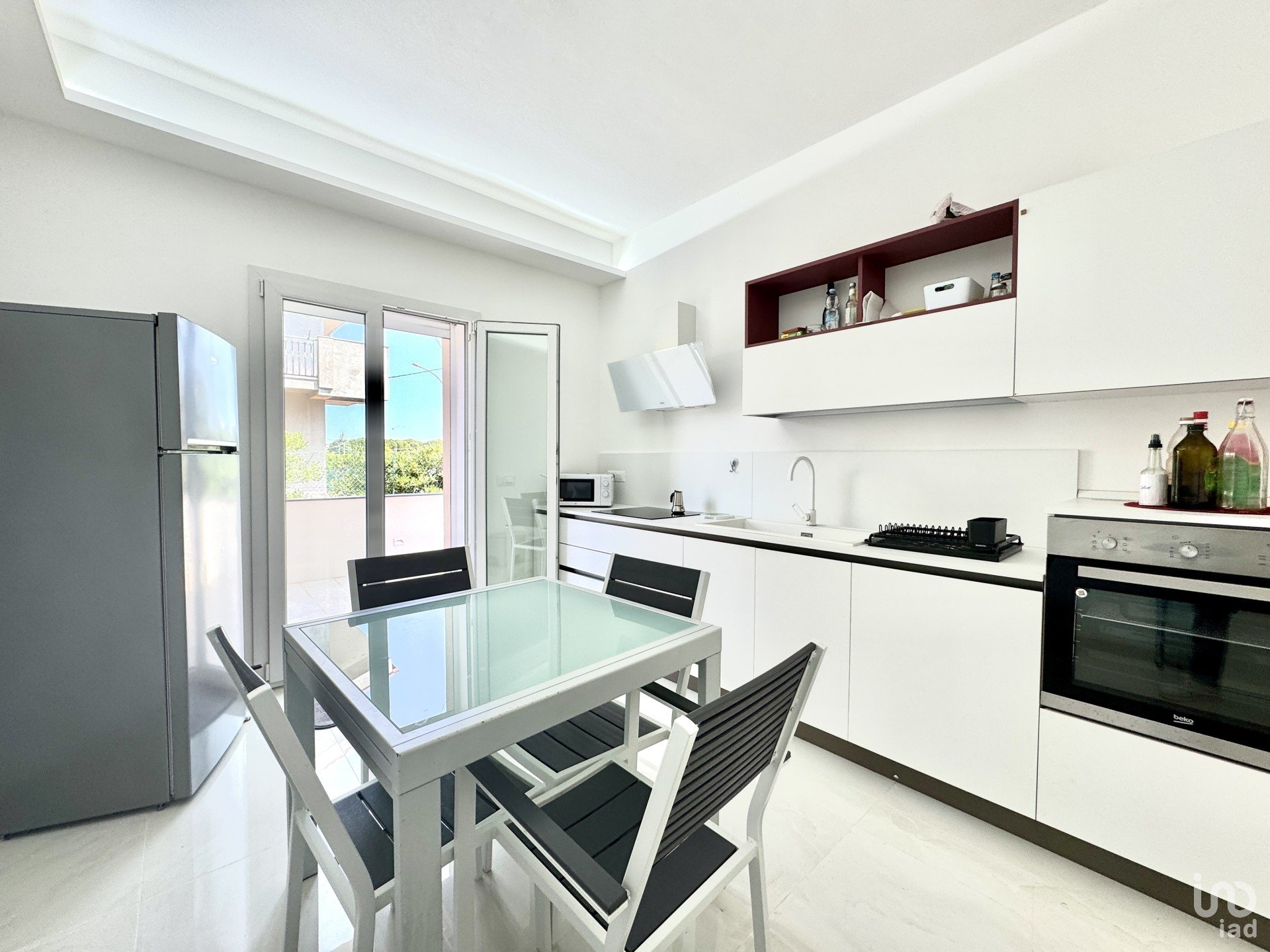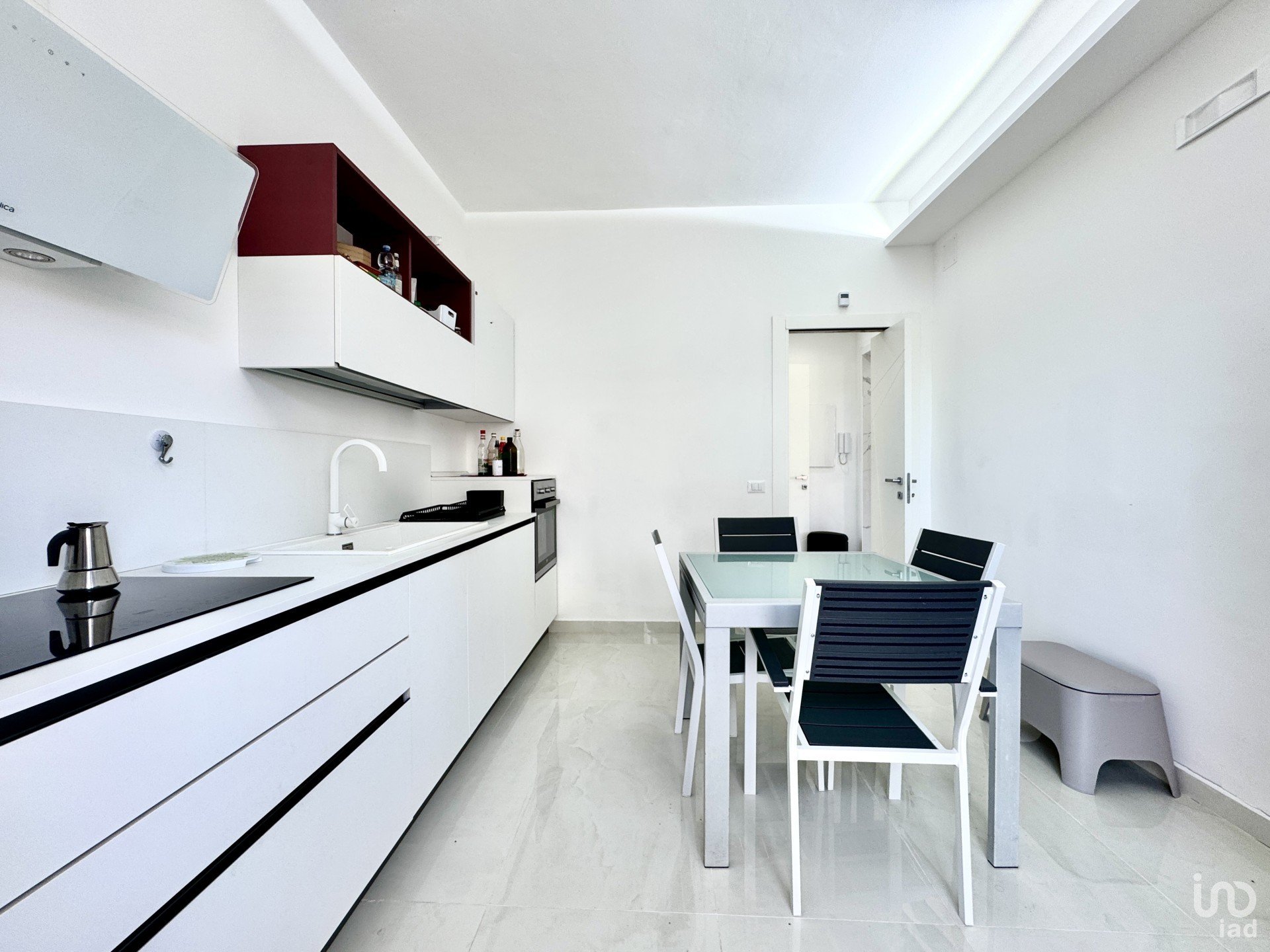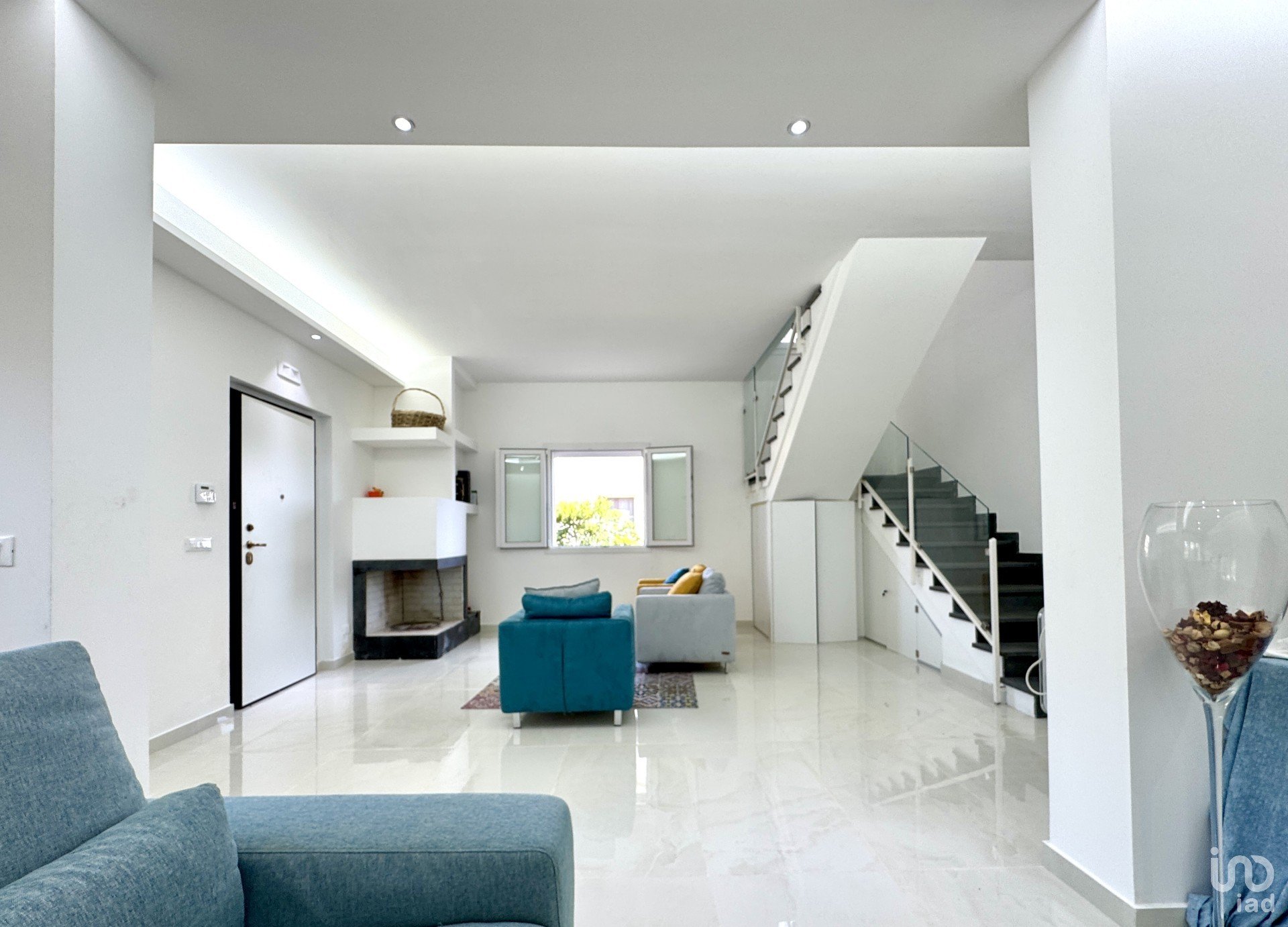 Inside, the villa reflects a refined and functional aesthetic: bright interiors, open spaces, and clean, elegant lines. On the ground floor, the LIVING ROOM is the heart of the home — a welcoming and intimate space enhanced by high-quality materials and large openings that blur the lines between indoor and outdoor living. The KITCHEN and a service BATHROOM with shower complete the day area, offering functionality and comfort.