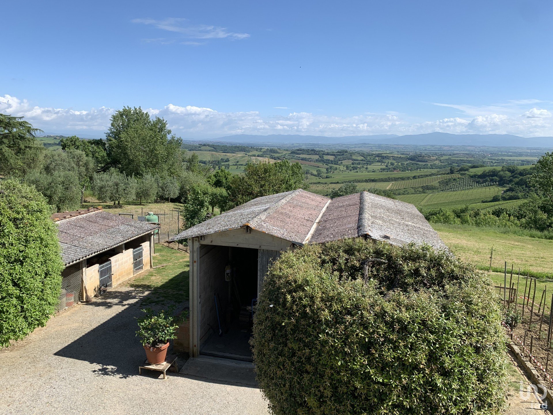 Circondata da circa 6.000 mq di terreno privato, la proprietà regala una vista spettacolare sulla Val di Chiana fino all’Appennino, un panorama che cambia colore con le stagioni e che incanta ogni giorno chi vi abita.