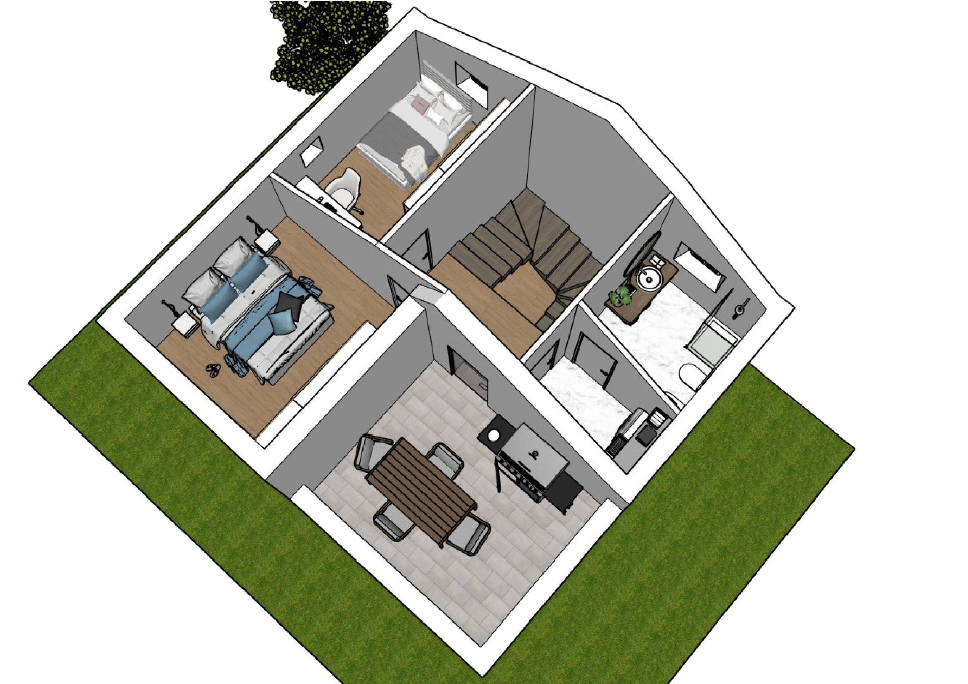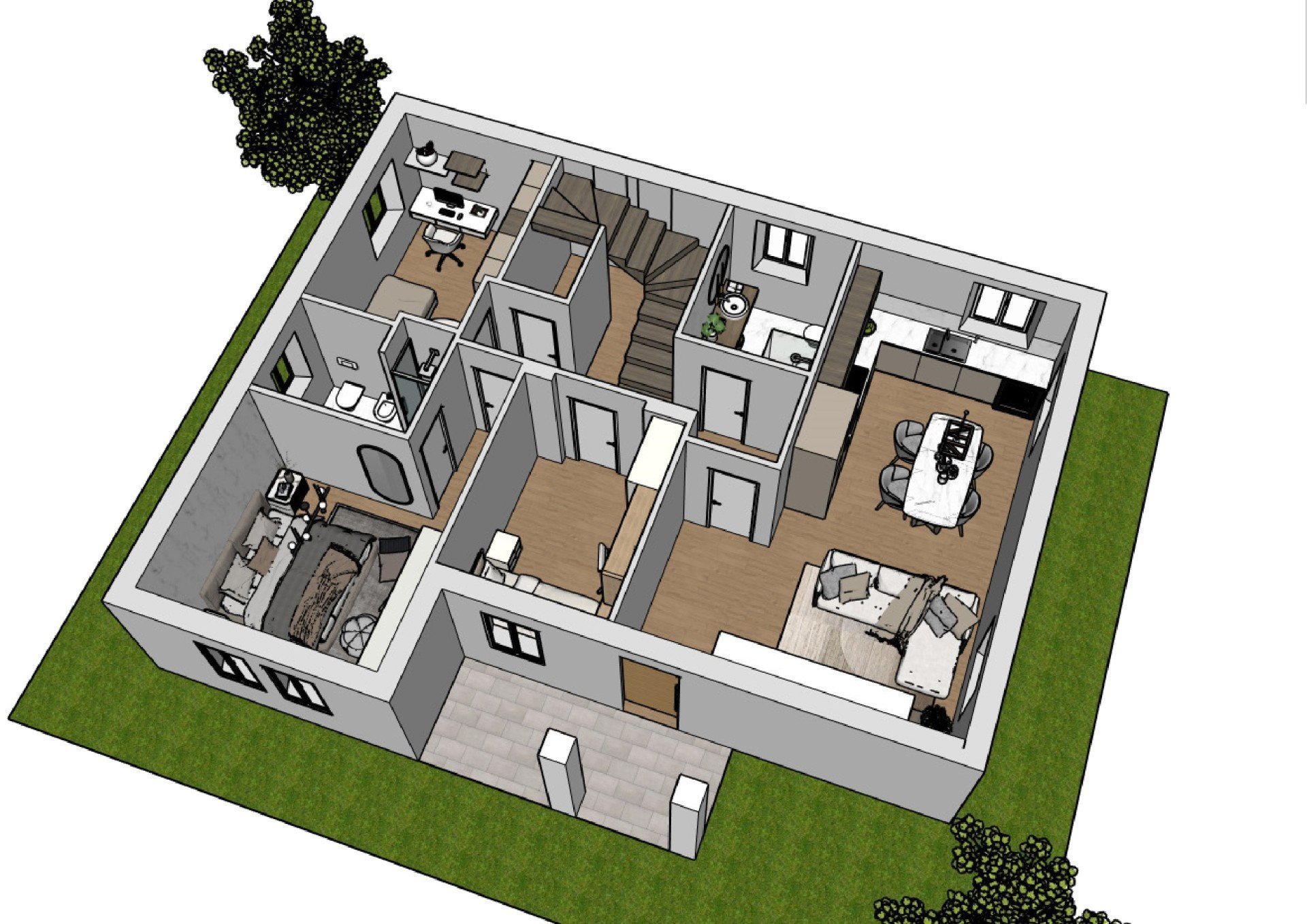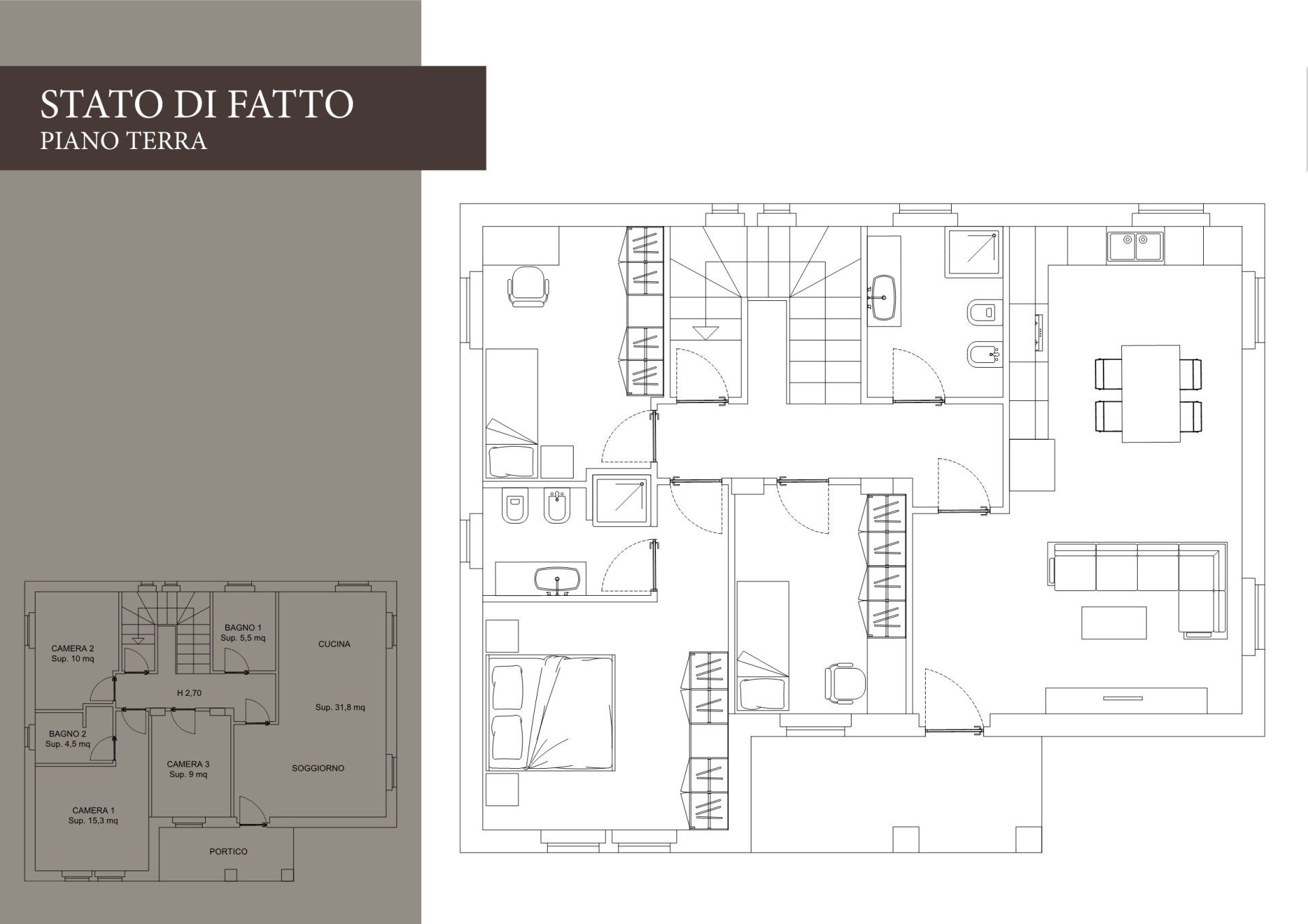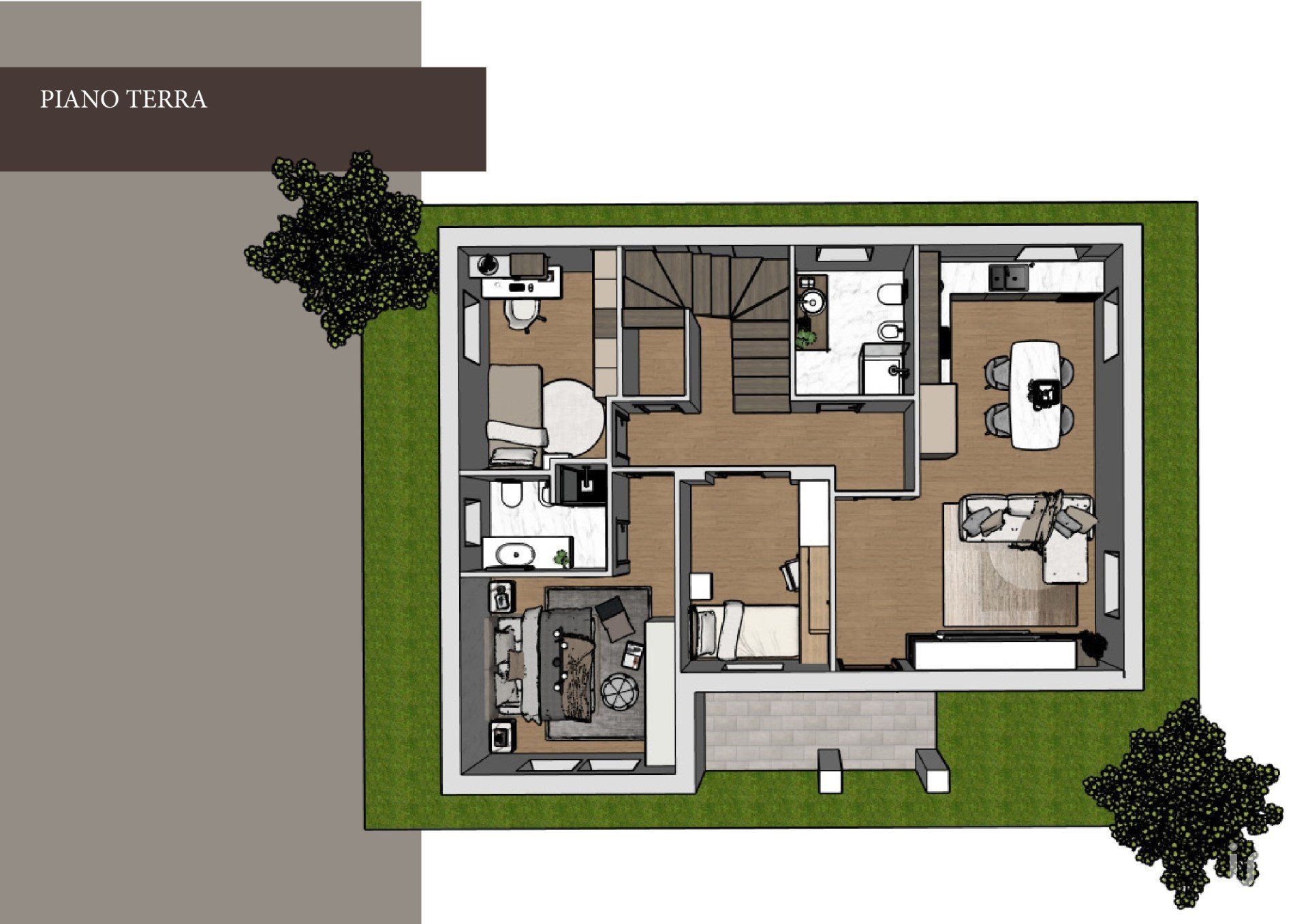 Piano terra: zona giorno con soggiorno e cucina spaziosi, una camera matrimoniale con bagno privato, due camere doppie e un secondo bagno. Ambienti progettati per garantire comfort e funzionalità a tutta la famiglia.