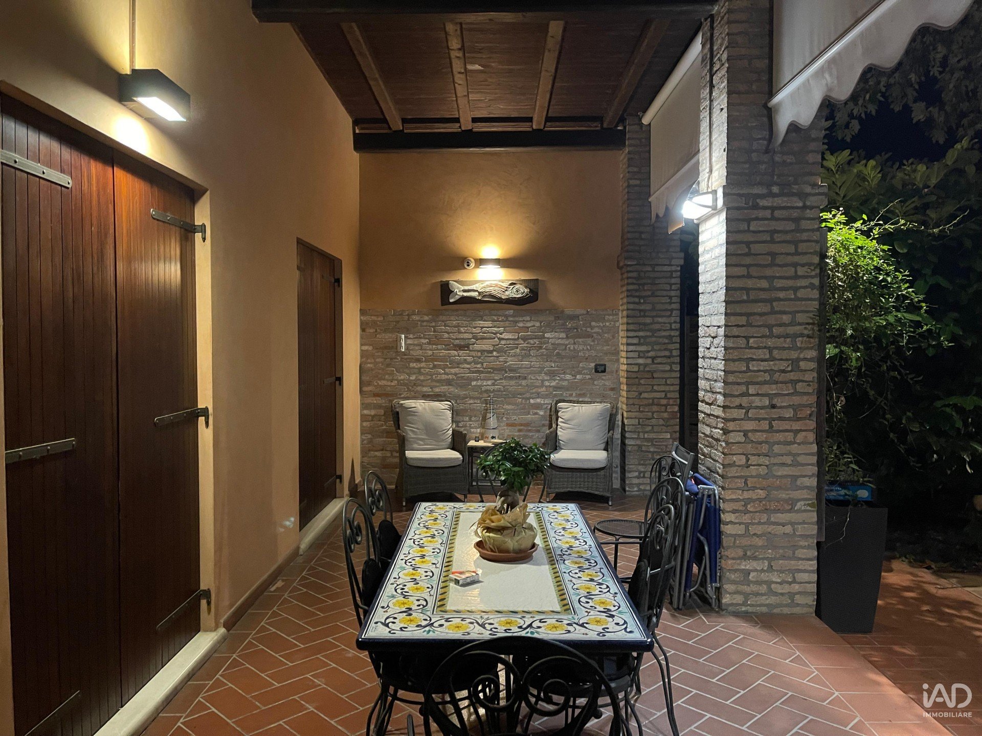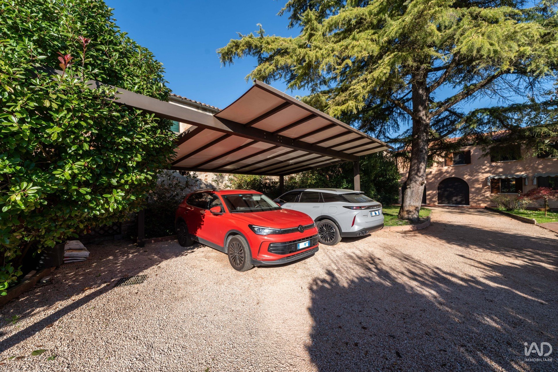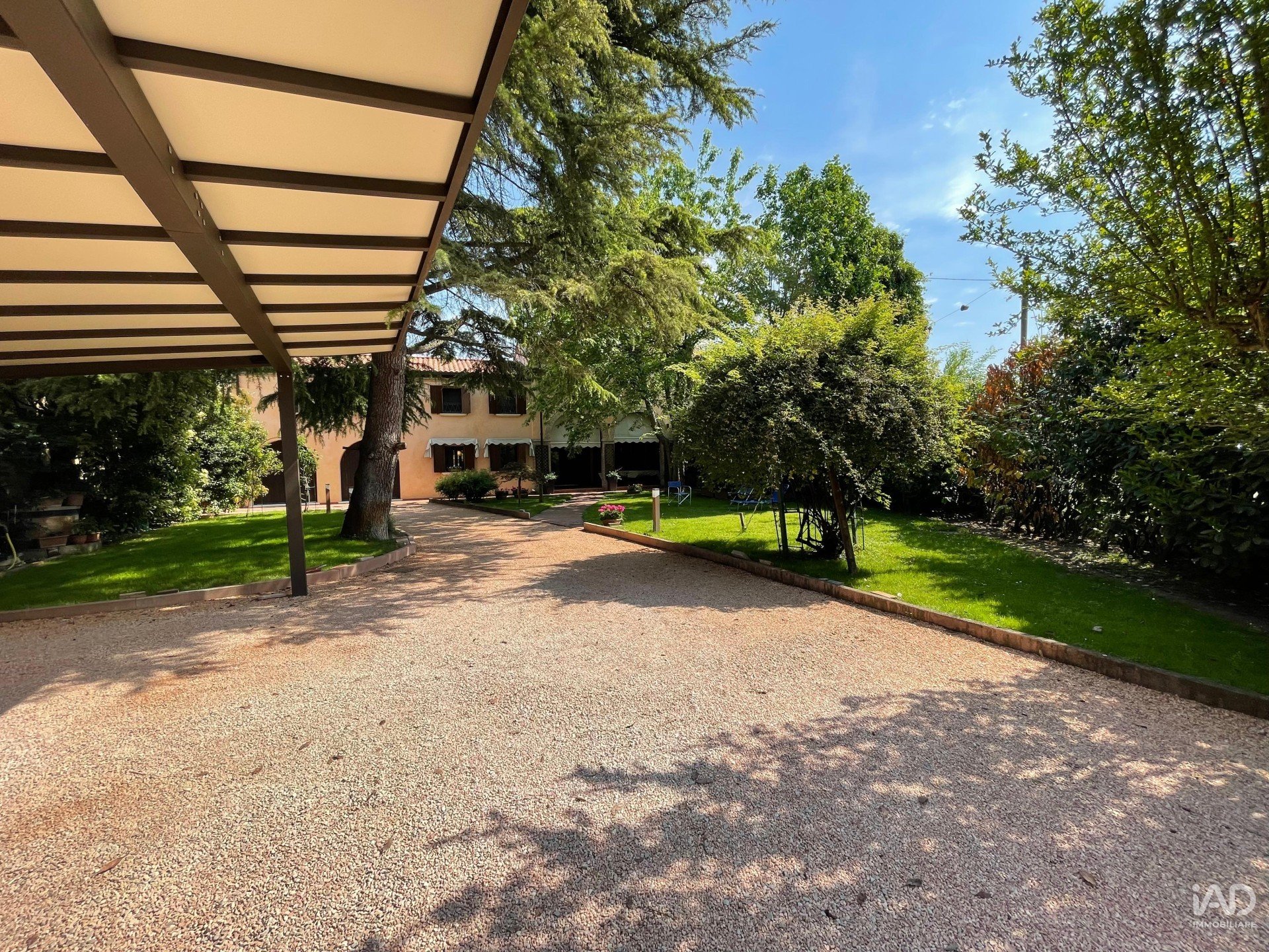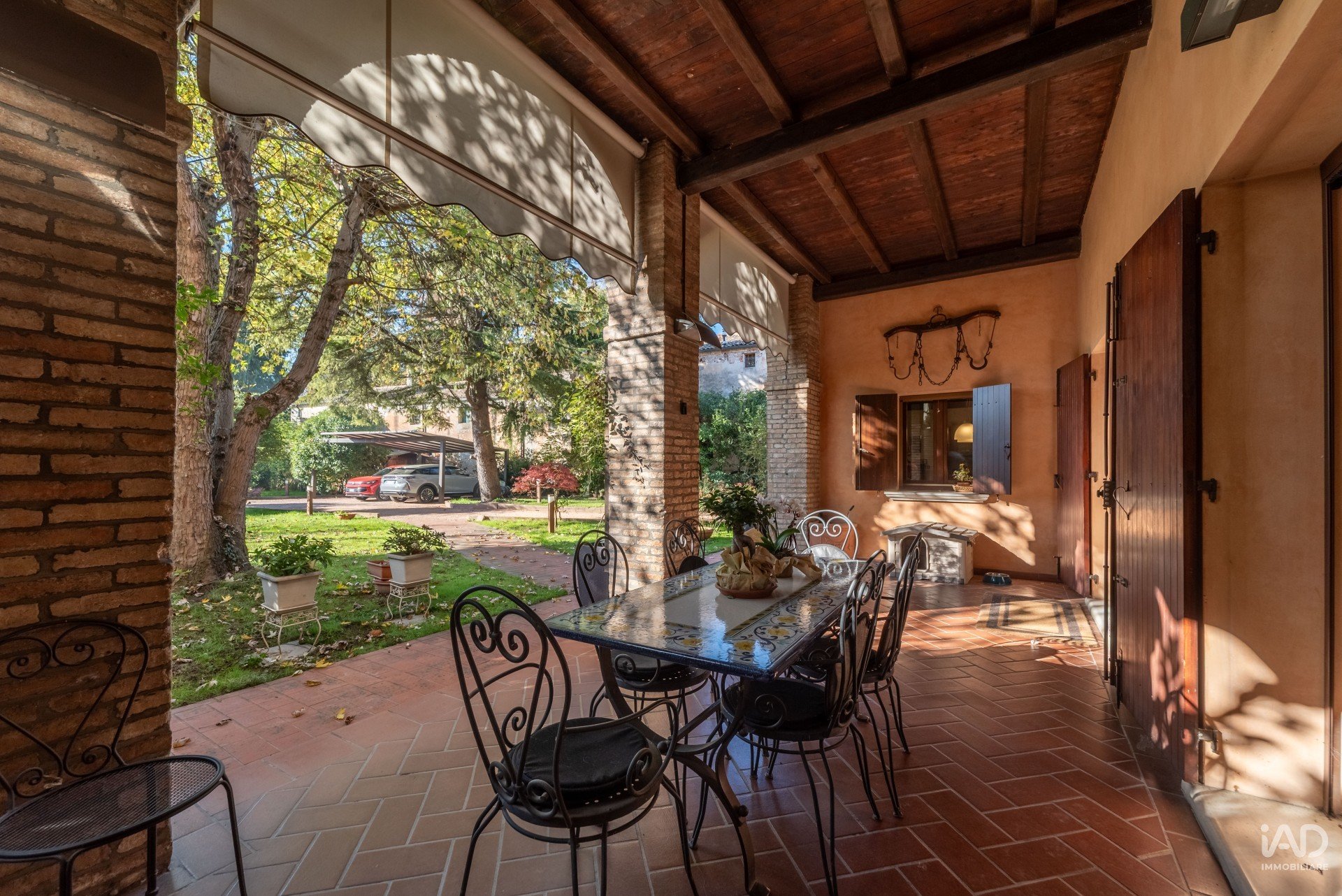 Ampio porticato ideale per cene conviviali e momenti di relax all’aperto, affacciato su un curato giardino piantumato con tettoia per due posti auto.