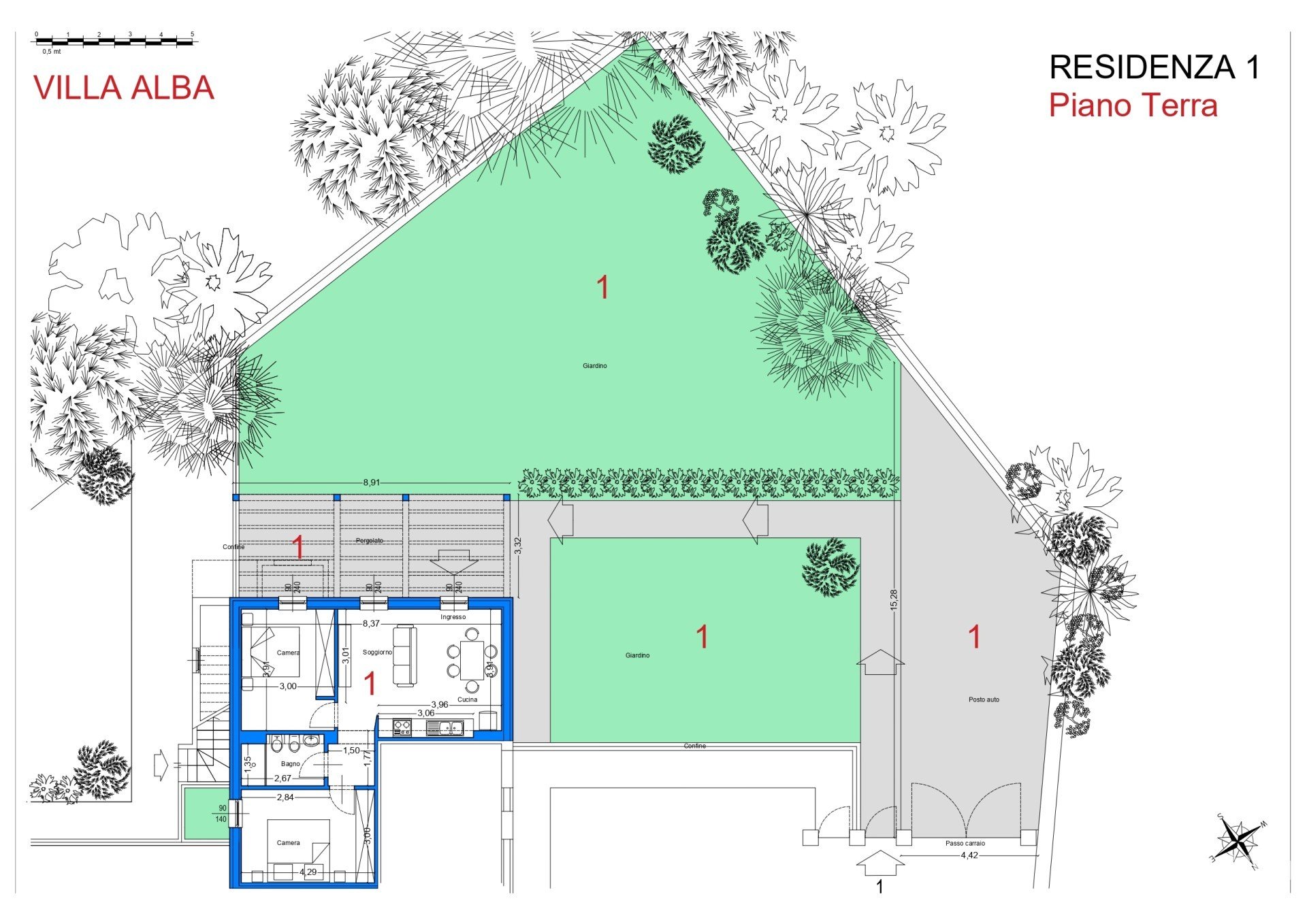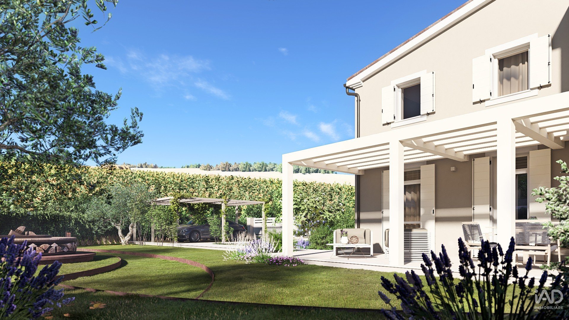 Con ampio pergolato di 30mq, corte pavimentata e generoso giardino di oltre 300mq